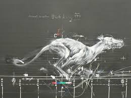 Les séries des chiens et des hommes en mouvement complètent le propos du peintre. Des chiens courent sur la toile et finissent par s’écraser sur un mur invisible. Tout au long de leur course, ils s’inscrivent dans des cadres métriques, qui mesurent leur cinétique, comme s’ils faisaient l’objet d’une expérience qui ne dit pas son nom. Ce sont des chiens durs, des pitbulls ou assimilés, que l’on sent prêts à l’agression, mais qui ne font pas le poids par rapport à l’obstacle final. Malgré leur hargne et leur vélocité, ils échouent et se fracassent. L’artiste les désosse, les mesure, comme pour comprendre les fondements de leur échec.