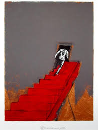 C’est une peinture dure, toute en gris, rouge et noir (exception faite du jaune pour la série des chiens), qui montre l’humanité face à la mort. Quoi que nous fassions, nous allons mourir un jour et nous ne laisserons que des traces, semble dire l’artiste à longueur de toile. Cela commence par des maternités tellement douloureuses et écartelées. Le corps de la mère n’est plus qu’un amas de chair arque-bouté de tous ses muscles vers l’expulsion finale. L’enfant n’est guère mieux loti, c’est parfois un rat. Ce qui rappelle des techniques atroces de torture sur les femmes… La naissance n’est donc qu’un acte de souffrance, qui préfigure la mort. Cela me fait penser aux tableaux classiques de madones à l’enfant, où est très souvent présent un symbole de la mort du Christ, dès sa naissance (grenade, croix, agneau)