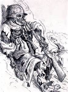 Cela m’a fait penser à ce qu’Otto Dix (1891-1969) nous avait donné à voir sur la Première Guerre Mondiale. Lui aussi, présent sur le Front de 1914 à 1918, témoin de cette boucherie quotidienne, a voulu la raconter au monde. Contournant ingénieusement la censure, qui ne s’intéressait qu’au texte des correspondances, il a tout au long de la guerre dessiné des cartes postales montrant le carnage auquel il assistait, tout en écrivant des textes lénifiants au recto. Et puis, en 1924 « pour se débarrasser de tout cela » dit lui-même l’artiste, il édite « La guerre », série d’une cinquantaine de gravures, presque insupportables à regarder.