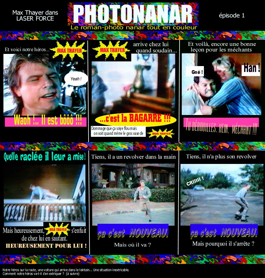 Ayant souvent retrouvé (ou conforté) ma bonne humeur devant leurs critiques, je voudrais ici rendre un hommage particulier à une initiative originale qu’ils ont eue, la création d’un roman photo sur le film « Laser force » (Teddy Page, 1985, Philippines), centrant l’histoire sur l’acteur Max Thayer.