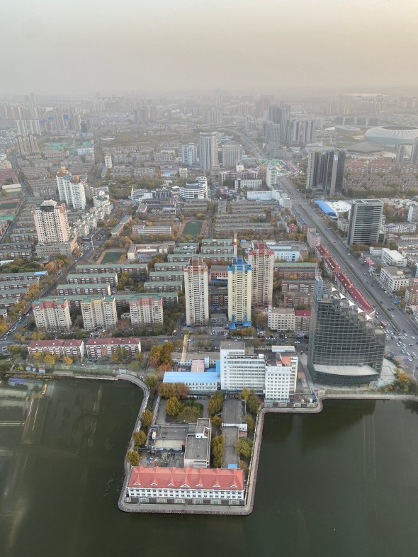 Par rapport à Pékin, la ville donne une impression d’un mélange culturel plus visible mais aussi d’une aération plus grande (du moins vu d’où j’étais et par rapport au minuscule périmètre que j’ai pu arpenter), paradoxe à première vue puisque la ville n’est pas plus grande, avec des terrasses aux allures de pays chaud où vous pouvez déguster une bière du cru, des promenades de bord de rivière ourlées de pêcheurs plus ou moins attentifs ou des jardins à taille humaine qui donnent l’impression que vous êtes revenus dans votre petit pays, la France. Jusqu’à ce que vous slalomiez sur votre vélo en marge d’une six voies pour rejoindre la tour de la télévision, calquée sur celle de Berlin, et que vous contempliez l’immensité des buildings à perte de vue dans le fog ambiant.