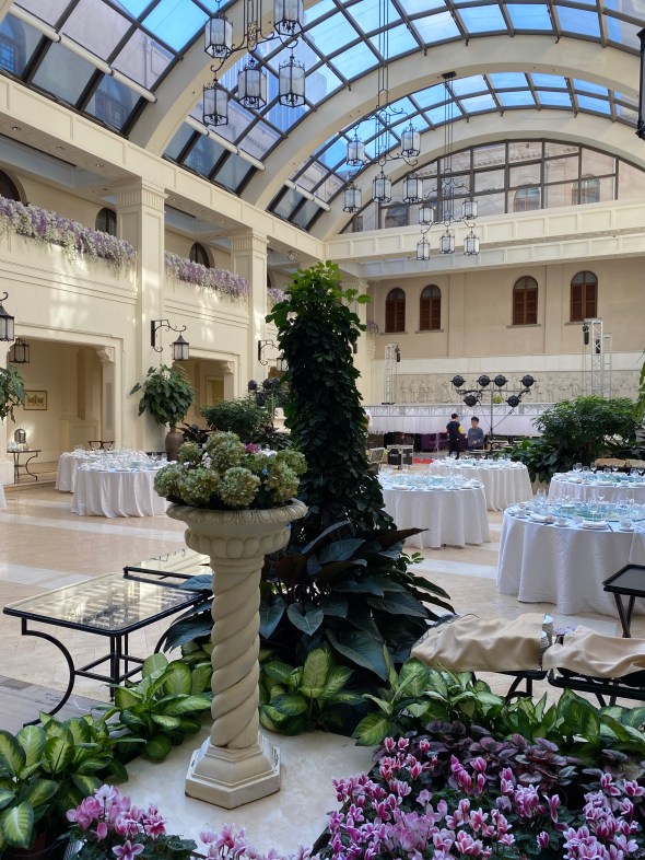 Après un voyage au travers de paysages en devenir, la Chine de ce que je vois pour le moment est faite de cela, de territoires qui bougent à une rapidité digne des sept jours de la création du monde. En moins d’une nuit, la semaine dernière, des ouvriers ont goudronné un kilomètre de trois voies devant mon appartement et en ont refait le marquage. Vous imaginez ces forces à l’oeuvre sur cet immense territoire, qu’il faut conquérir pour faire la place à l’homme. Tout au long du trajet, des excavations béantes, des terrains vagues, des immeubles en construction par dizaines, qui ne laissent en rien présager de ce que je vais découvrir en arrivant dans cet hôtel. Comme un arrêt dans le temps, épargné par les pelleteuses et autres machines, il mêle tradition anglaise (il est situé au coeur de l’ancienne concession de ce pays) et chinoise (ces mariages fastueux au coeur du bâtiment). Comme pour nous dire combien au siècle dernier, l’esprit occidental avait un temps soufflé sur ce pays. Une de mes amies m’a dit qu’il ressemblait à un subtil mélange entre « Shining », « Tintin en Syldavie » et « Las Vegas » ; j’ajouterai pour ma part une bonne dose de Royaume-Unis et nous y sommes 🙂 !