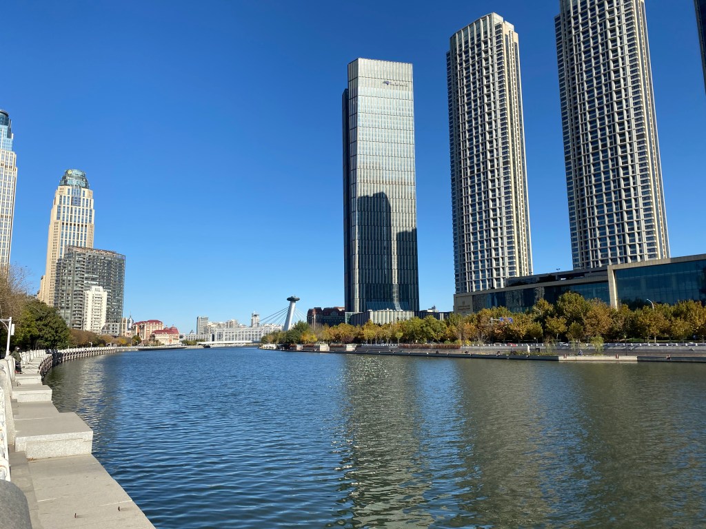 Ce fût une très bonne introduction à ce que je l’allais voir ensuite, une ville immense, impossible à parcourir à pied et à peine en vélo, qui a gardé une enclave ancienne, autour de quartiers formés par les anciennes concessions anglaise, française et japonaise enserrés par une ville chinoise qui surgit en forme de buildings modernes et impersonnels pour faire contrepoint aux constructions de cette ère révolue. Le long de la rivière Haihe, de splendides points de vue se déploient, rythmés là par un pont et ici par des statues que ni Gustave Eiffel, ni Auguste Rodin n’auraient pu renier tout à fait. Le temps splendide de ce week-end augmentait sûrement la beauté de ces promenades qui me faisaient croiser un pont très inspiré du Pont Alexandre III à Paris, adossé à de rutilants gratte-ciel avec quelques mètres plus loin l’ancienne Ambassade d’Autriche-Hongrie, que nous imaginerions bien en plein Salzbourg, ornée de la splendeur des arbres d’automne. Edgar Hoover, qui y a séjourné avant de devenir Président des Etats-Unis a noté dans son journal : « C’est une cité universelle, comme le monde en miniature. S’y côtoient toutes les nationalités, tous les styles architecturaux, toutes les cuisines ». C’est à peu près l’impression que j’y ai eue.