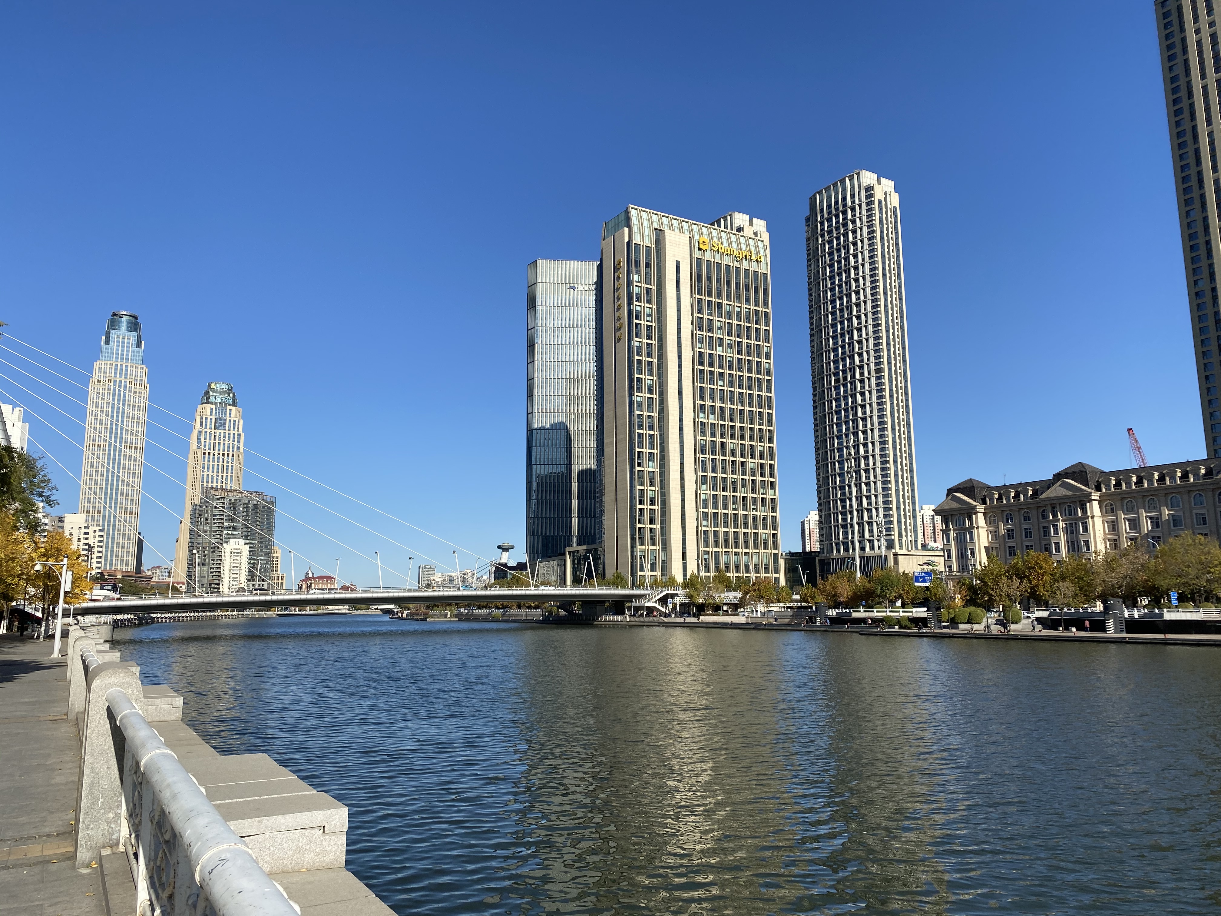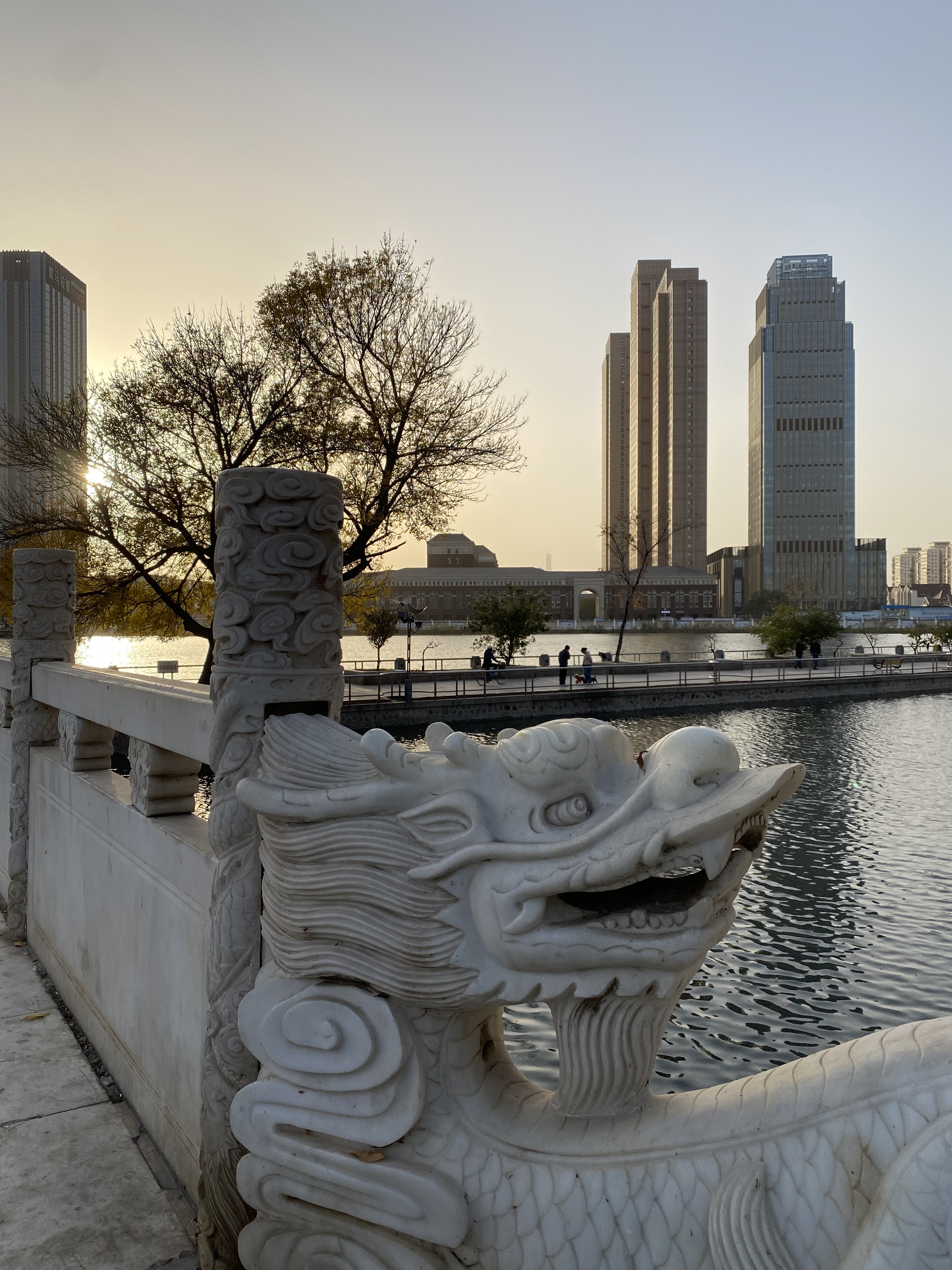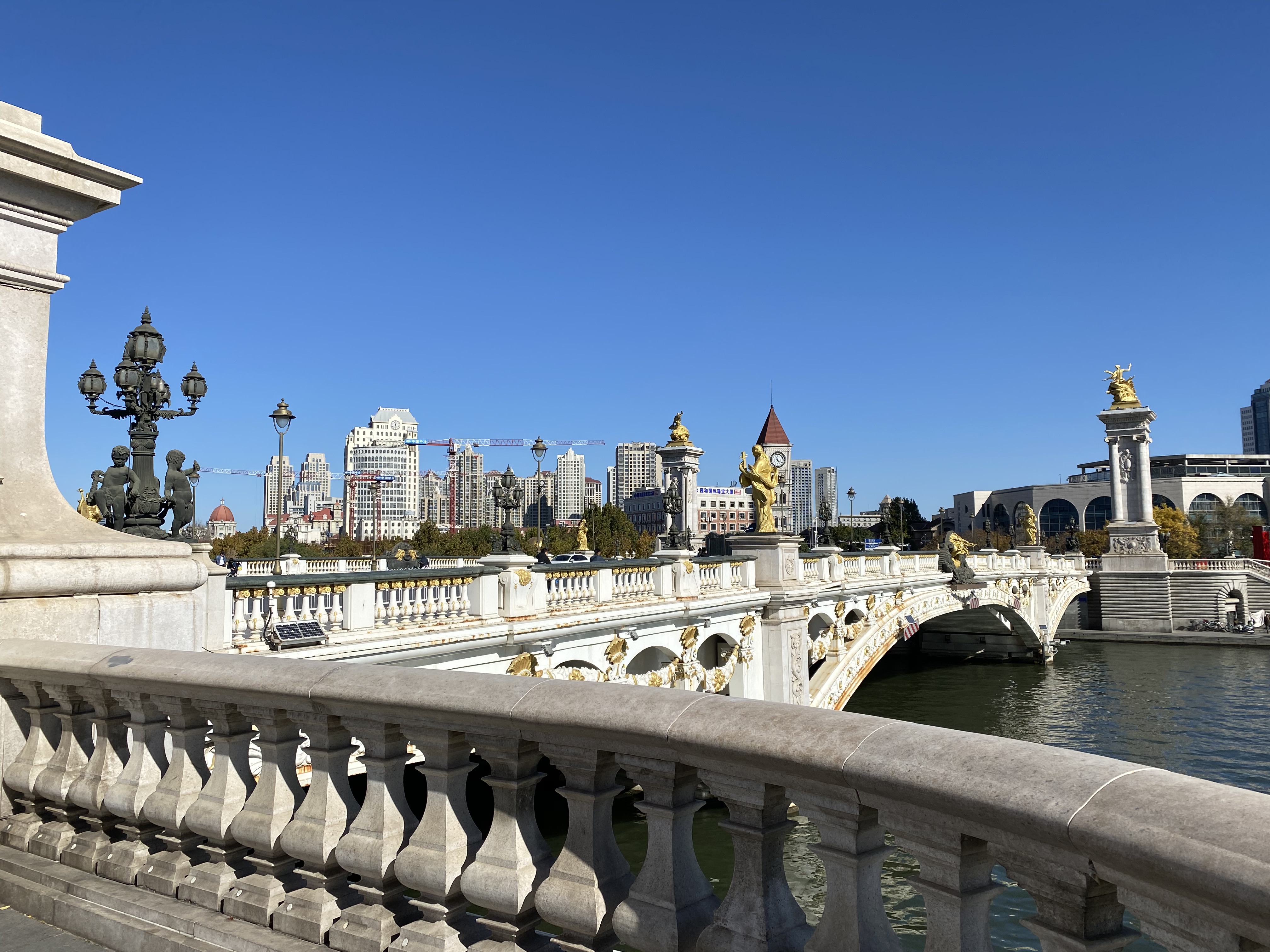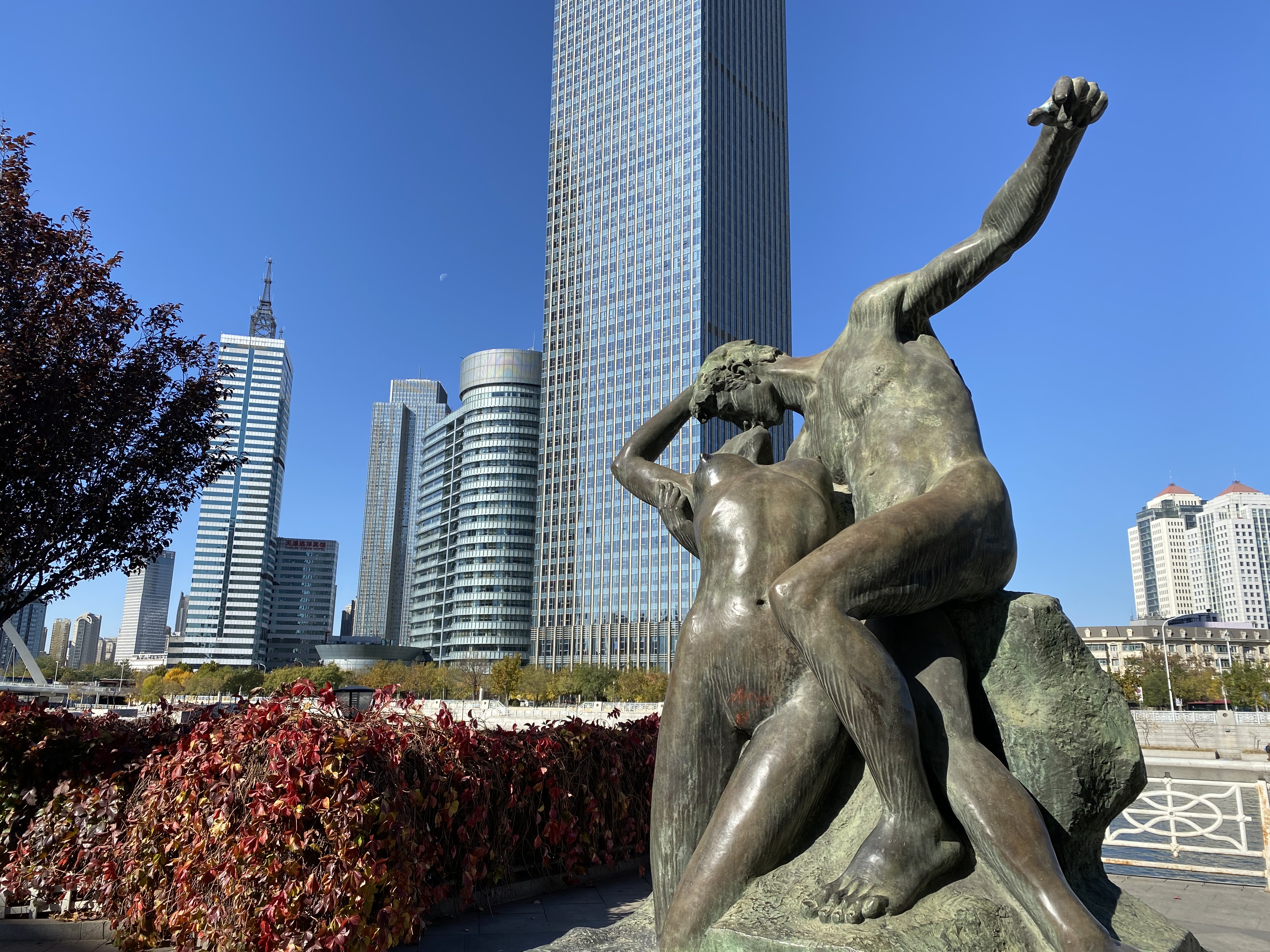 Ce fût une très bonne introduction à ce que je l’allais voir ensuite, une ville immense, impossible à parcourir à pied et à peine en vélo, qui a gardé une enclave ancienne, autour de quartiers formés par les anciennes concessions anglaise, française et japonaise enserrés par une ville chinoise qui surgit en forme de buildings modernes et impersonnels pour faire contrepoint aux constructions de cette ère révolue. Le long de la rivière Haihe, de splendides points de vue se déploient, rythmés là par un pont et ici par des statues que ni Gustave Eiffel, ni Auguste Rodin n’auraient pu renier tout à fait. Le temps splendide de ce week-end augmentait sûrement la beauté de ces promenades qui me faisaient croiser un pont très inspiré du Pont Alexandre III à Paris, adossé à de rutilants gratte-ciel avec quelques mètres plus loin l’ancienne Ambassade d’Autriche-Hongrie, que nous imaginerions bien en plein Salzbourg, ornée de la splendeur des arbres d’automne. Edgar Hoover, qui y a séjourné avant de devenir Président des Etats-Unis a noté dans son journal : « C’est une cité universelle, comme le monde en miniature. S’y côtoient toutes les nationalités, tous les styles architecturaux, toutes les cuisines ». C’est à peu près l’impression que j’y ai eue.