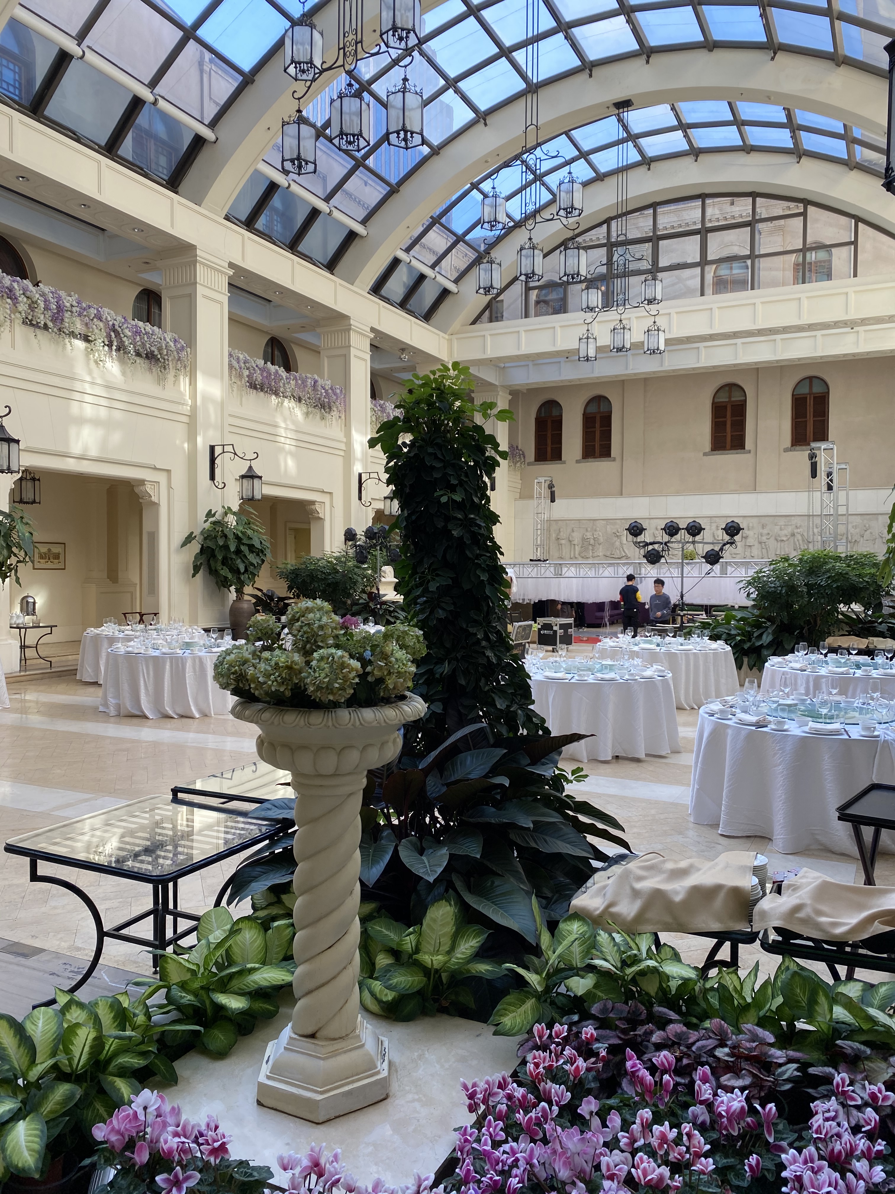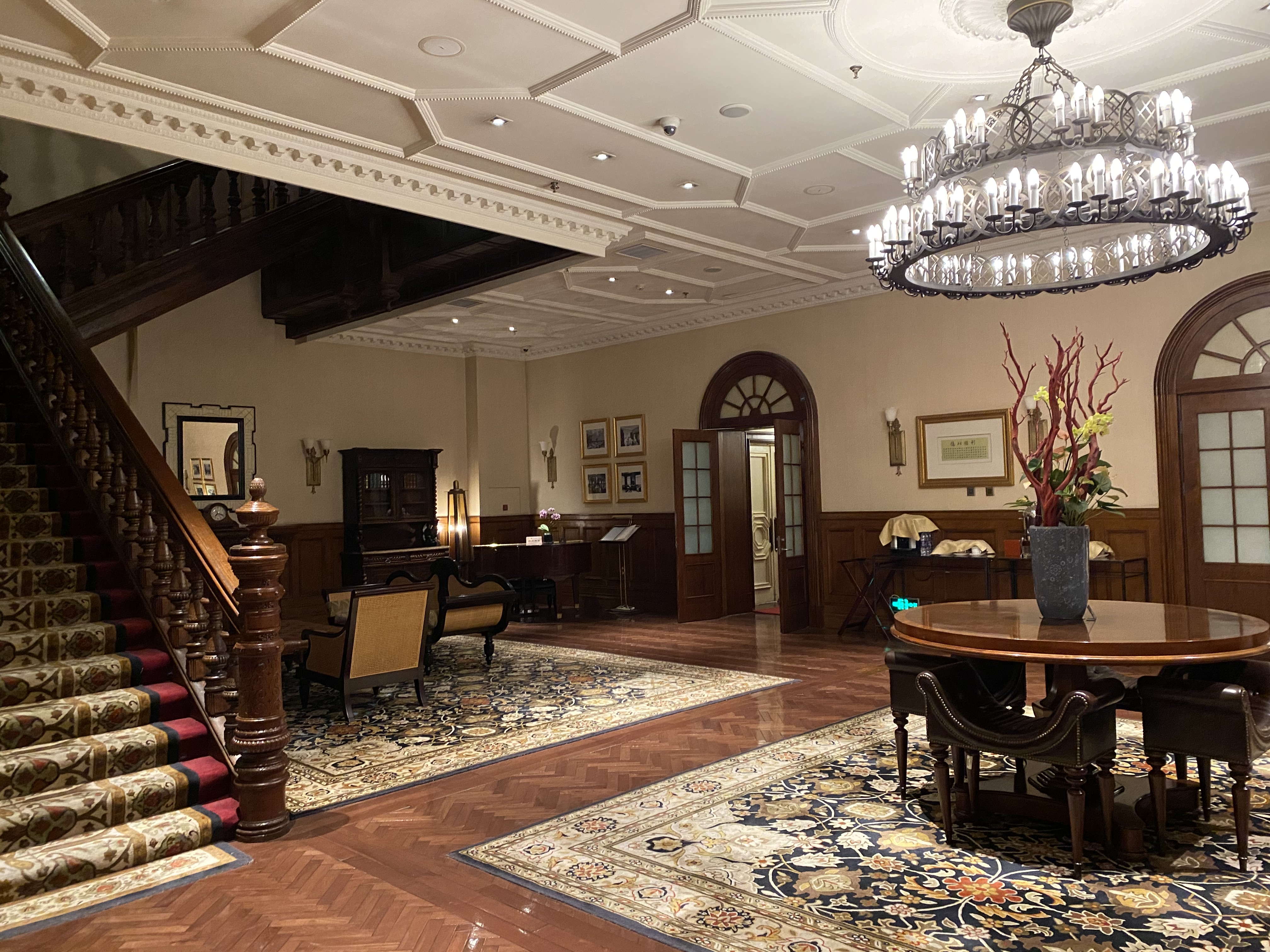 Après un voyage au travers de paysages en devenir, la Chine de ce que je vois pour le moment est faite de cela, de territoires qui bougent à une rapidité digne des sept jours de la création du monde. En moins d’une nuit, la semaine dernière, des ouvriers ont goudronné un kilomètre de trois voies devant mon appartement et en ont refait le marquage. Vous imaginez ces forces à l’oeuvre sur cet immense territoire, qu’il faut conquérir pour faire la place à l’homme. Tout au long du trajet, des excavations béantes, des terrains vagues, des immeubles en construction par dizaines, qui ne laissent en rien présager de ce que je vais découvrir en arrivant dans cet hôtel. Comme un arrêt dans le temps, épargné par les pelleteuses et autres machines, il mêle tradition anglaise (il est situé au coeur de l’ancienne concession de ce pays) et chinoise (ces mariages fastueux au coeur du bâtiment). Comme pour nous dire combien au siècle dernier, l’esprit occidental avait un temps soufflé sur ce pays. Une de mes amies m’a dit qu’il ressemblait à un subtil mélange entre « Shining », « Tintin en Syldavie » et « Las Vegas » ; j’ajouterai pour ma part une bonne dose de Royaume-Unis et nous y sommes 🙂 !