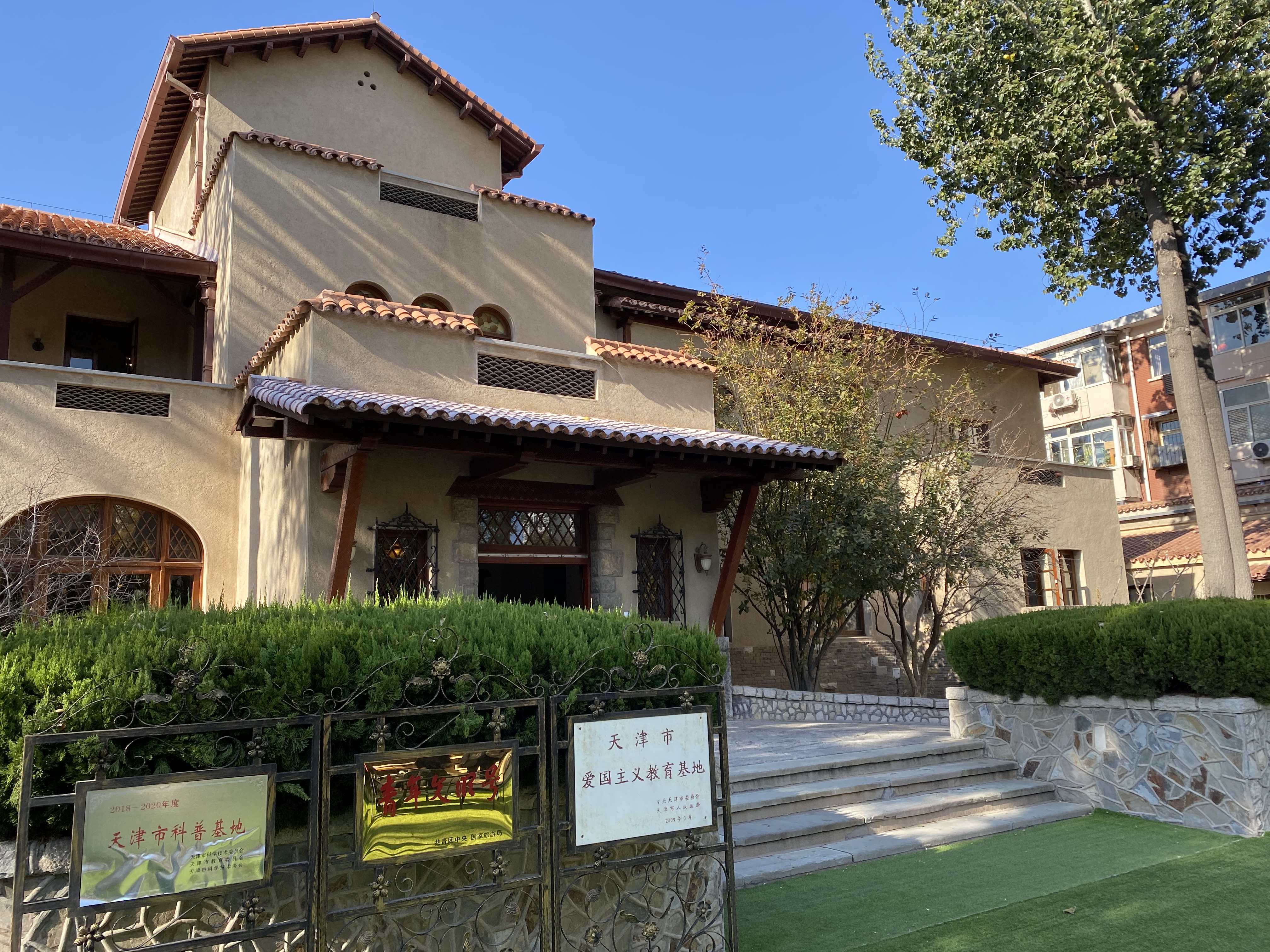 Ville d’histoire, elle a vu l’installation des Européens et des Japonais dans la deuxième partie du XIXe siècle, dont les constructions ont plus ou moins été épargnées pendant l’occupation japonaise à partir de 1937 ainsi que lors de la contre-offensive de l’Armée de libération populaire chinoise en 1949. Elle a également été le refuge de Pu Yi, le dernier Empereur chinois de la Dynastie Qing, qui après avoir abdiqué en 1912 (à l’âge de six ans) et après avoir passé 12 ans prisonnier dans la Cité interdite de Pékin, a obtenu des Japonais qu’ils l’hébergent dans leur enclave jusqu’en 1945, dans plusieurs villas, dont celle-ci.