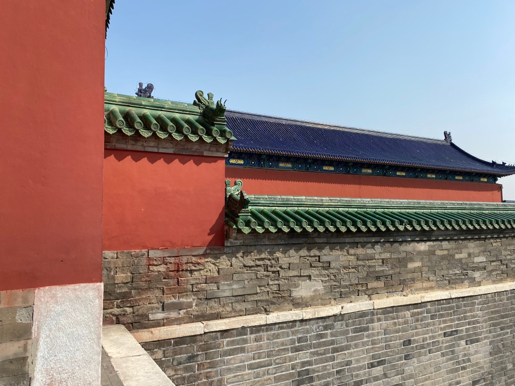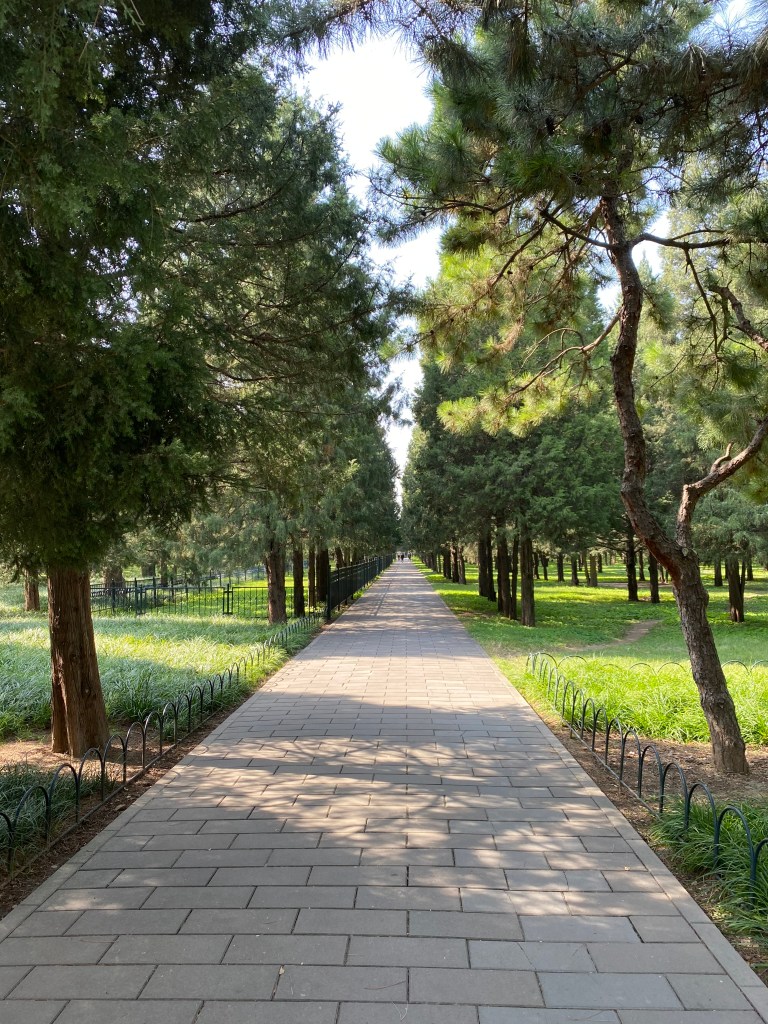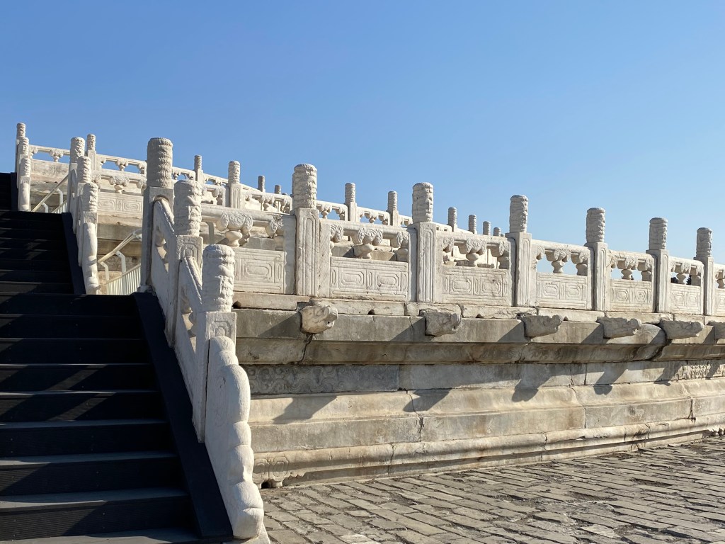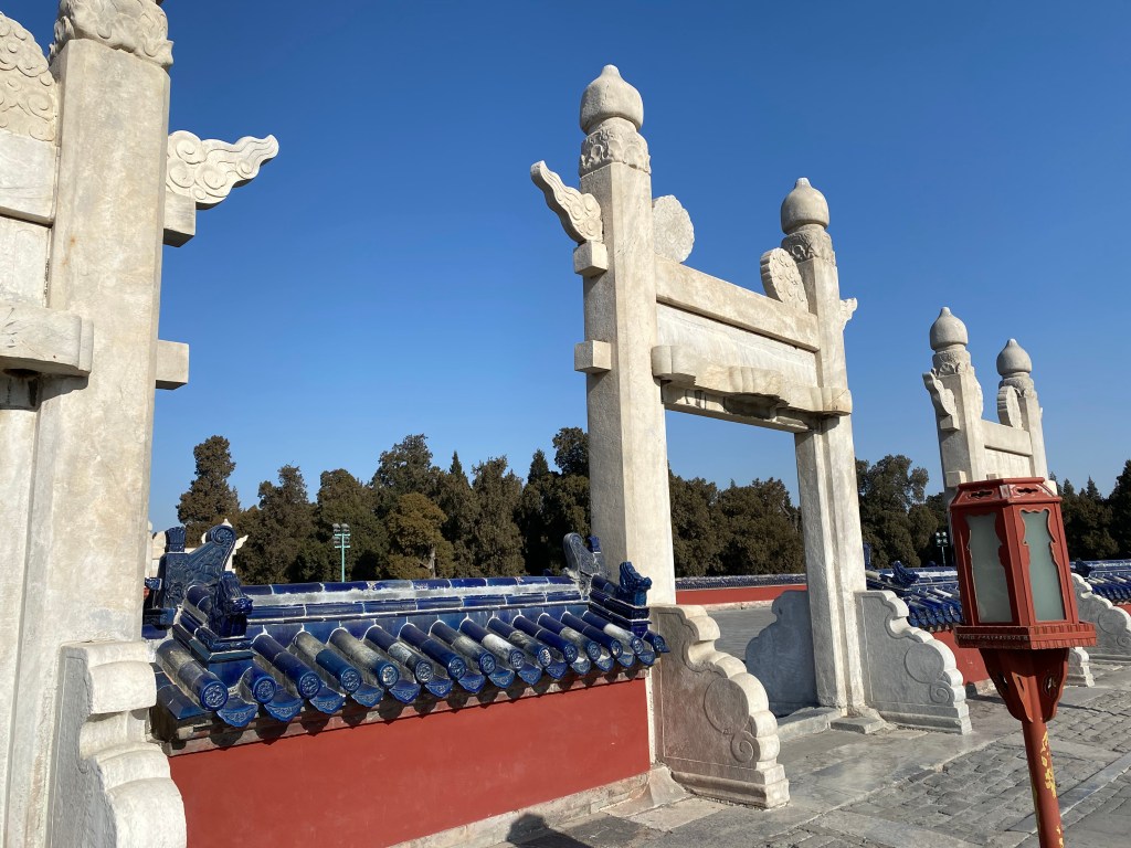 Je vais cependant vous mener directement au saint des saint, la Demeure du Seigneur du Ciel et l’Autel du Ciel. Normalement pleines de monde, ces espaces nous livraient ce jour-là leur vastitude esseulées. C’est absolument superbe, cet ensemble ancien qui surplombe la ville moderne, structure silencieuse et belle dans le bleu de cette journée.
