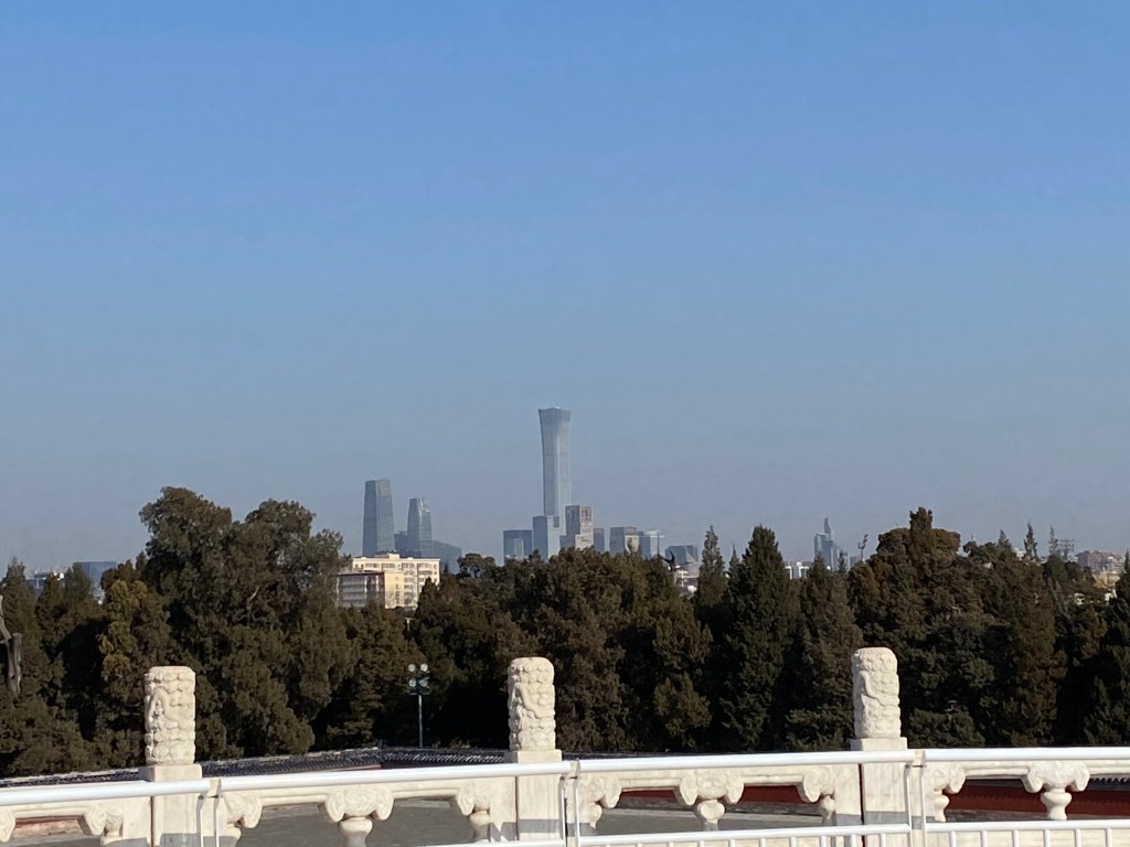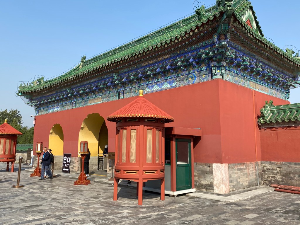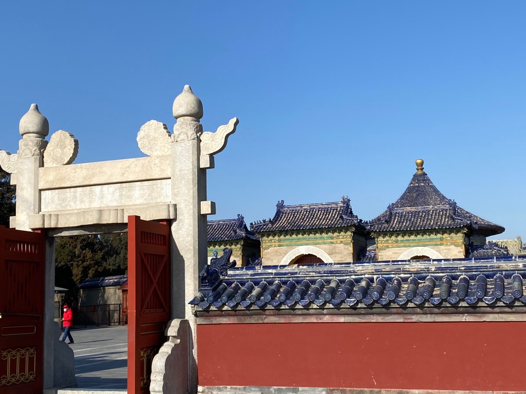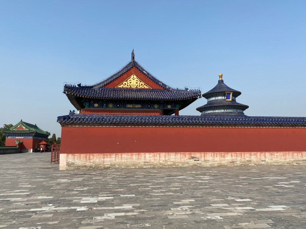 Parmi les monuments les plus impressionnants de la capitale chinoise, le Temple du Ciel vaut le détour. Pour moi ce n’est pas vraiment un « détour », de l’endroit où je réside, il me suffit d’enfourcher un vélo (我骑自行车) et de filer plein sud. Après 15 minutes de trajet, laissant sur ma droite un premier ensemble dédié aux achats, autour de la Rue Wangfujing, bordée de centres commerciaux tous plus grands les uns que les autres, un deuxième constitué de l’épicentre officiel de la ville qui aligne autour de la Place Tian An Men des édifices aux noms aussi exotiques que le Musée de la planification urbaine, le Parc de la Culture du Peuple, le Monument aux Héros du Peuple, j’arrive à cet immense parc superposant un demi-cercle sur un rectangle (ciel rond sur terre carrée), 273 hectares de nature jalonnée d’édifices, un ensemble équivalant à quatre fois la Cité interdite.