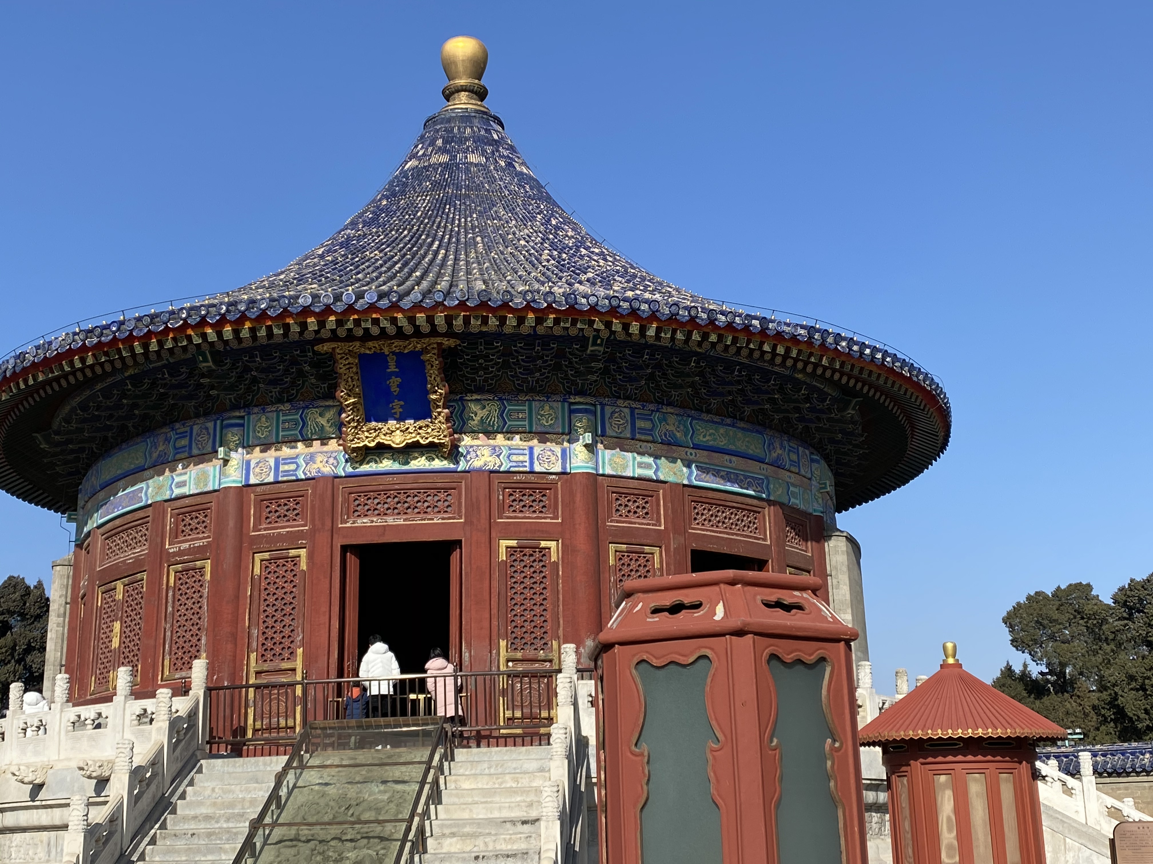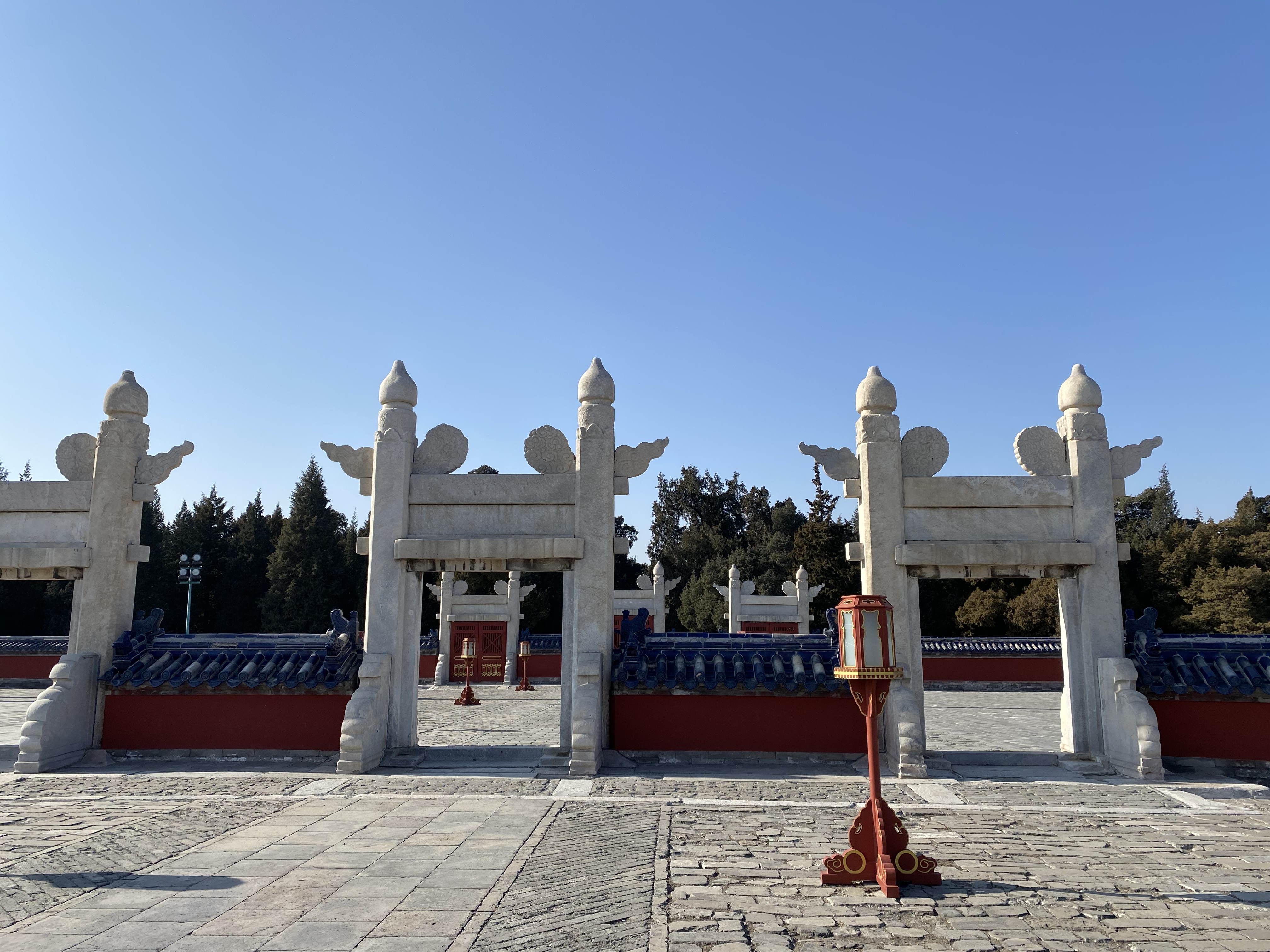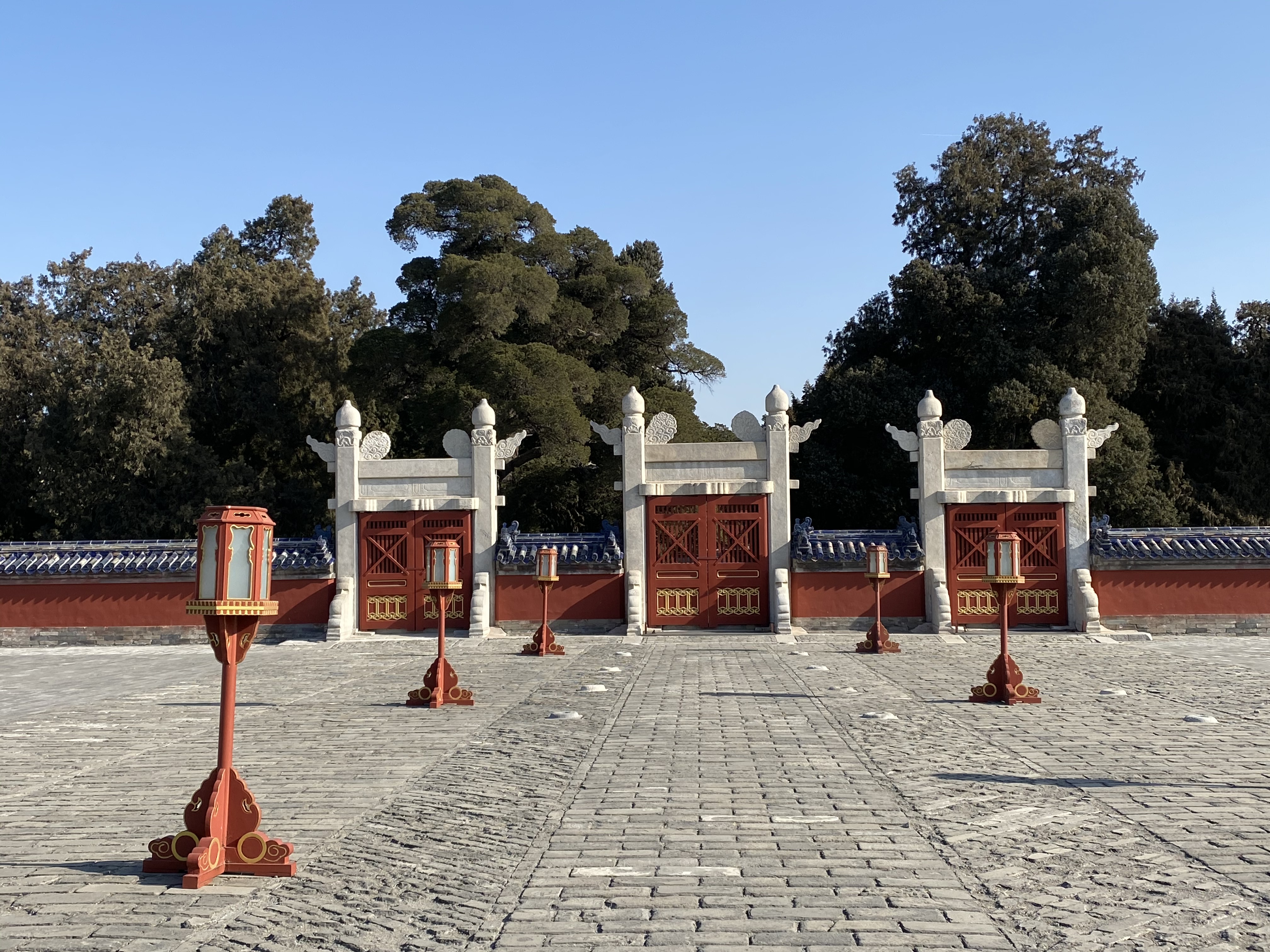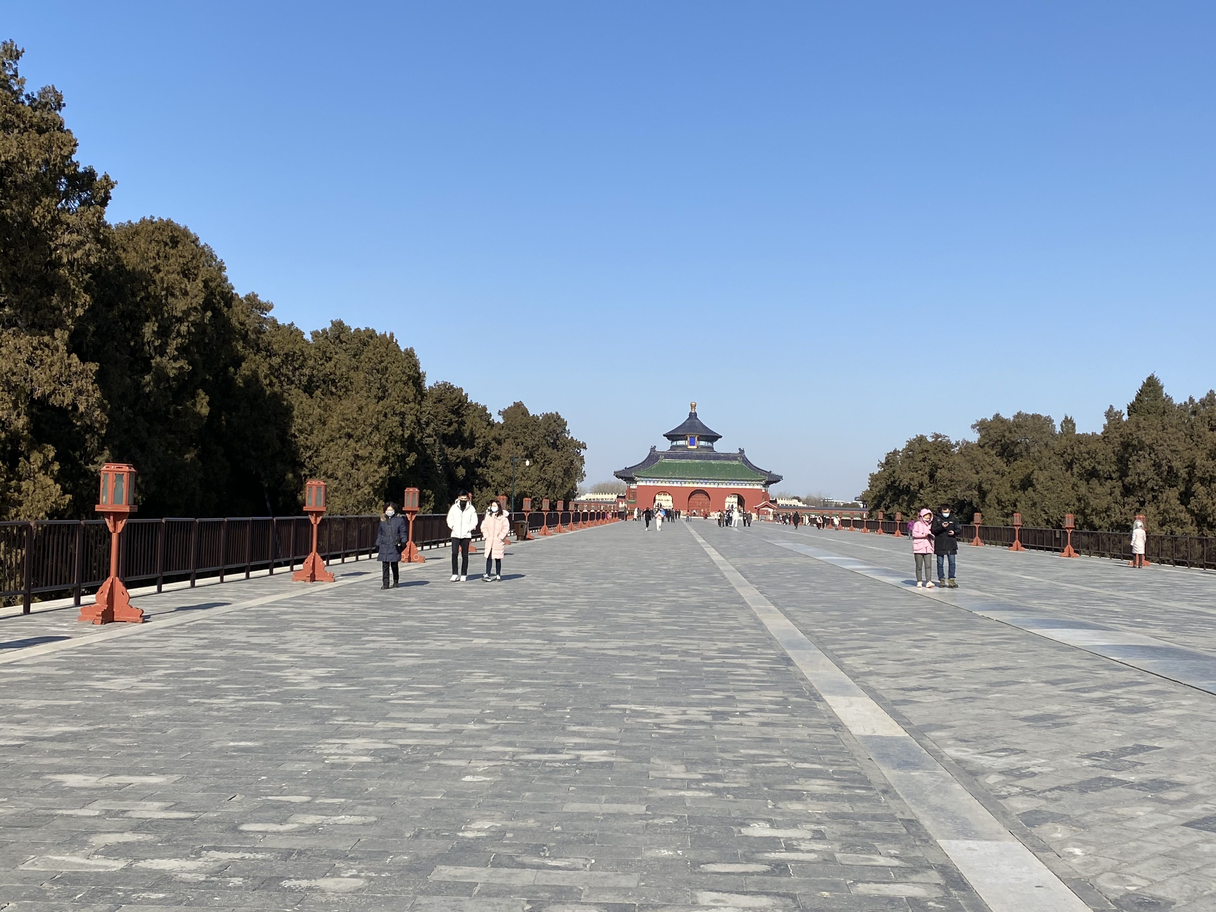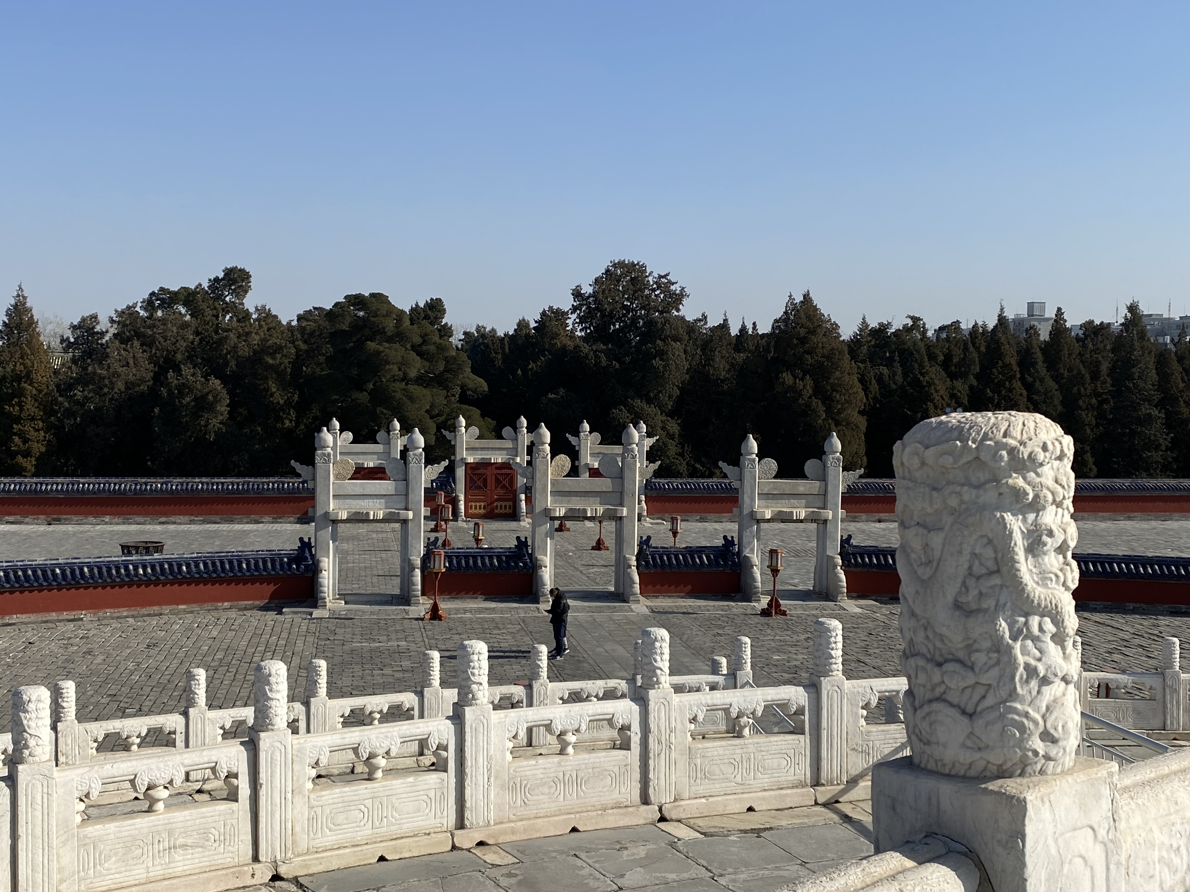 Je vais cependant vous mener directement au saint des saint, la Demeure du Seigneur du Ciel et l’Autel du Ciel. Normalement pleines de monde, ces espaces nous livraient ce jour-là leur vastitude esseulées. C’est absolument superbe, cet ensemble ancien qui surplombe la ville moderne, structure silencieuse et belle dans le bleu de cette journée.