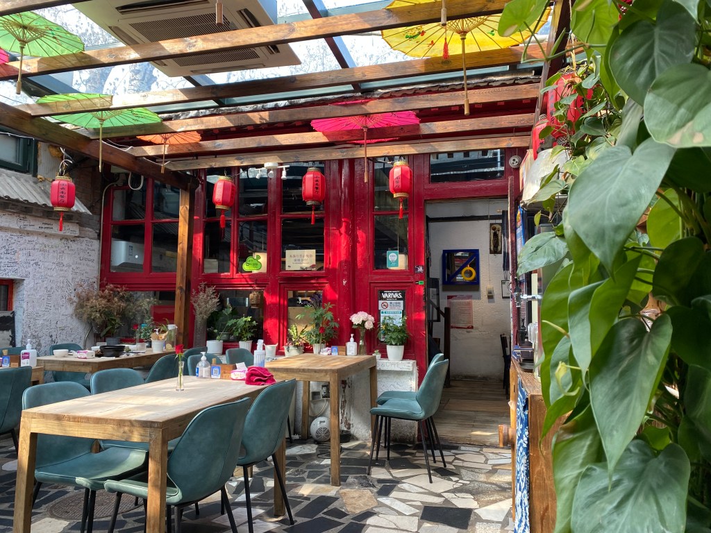 Le lieu était à la fois foisonnant/foutraque et diablement sympathique. Une ancienne cour de Hutong au toit vitré, qui laissait entrer la lumière partout. Des fleurs et des lanternes ponctuaient ce pimpant ensemble.