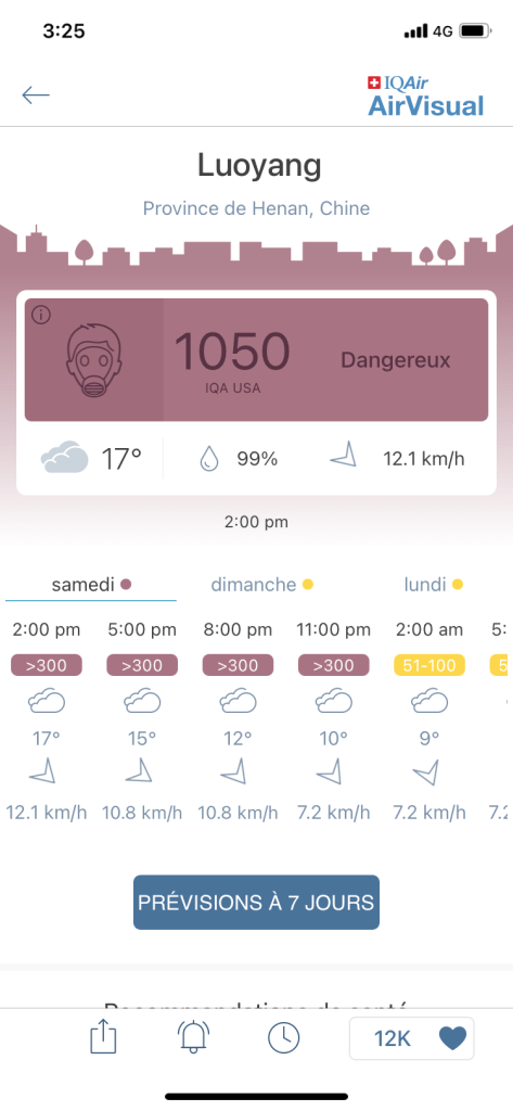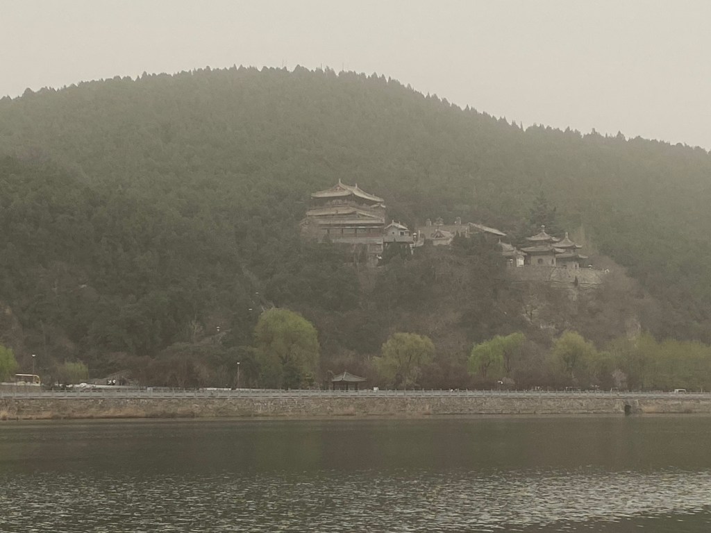 Il y a deux semaines, je suis partie pour un court week-end (7h30 de train en deux jours, une paille) pour me rendre à Luoyang (洛阳市 – littéralement « ville au nord de la rivière Luo »- située dans la province du Henan (« fleuve du sud »). Nous avions suivi bien malgré nous la tempête de sable qui avait flagellé Pékin le lundi précédent et étendait ses rets sur le centre du pays. Cela a donné à notre première journée une apparence bien nébuleuse.