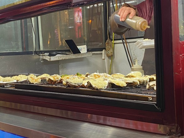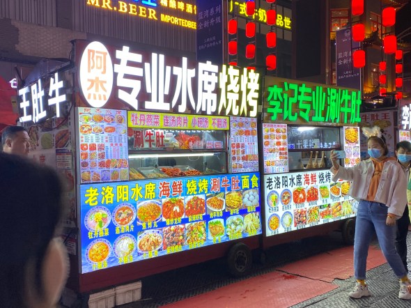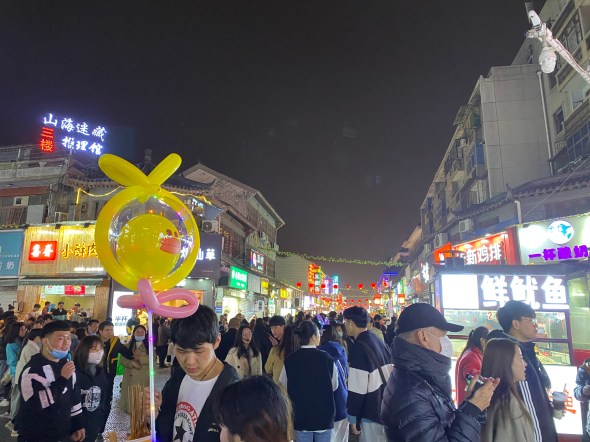 Les masques se font rares, bien que la foule soit compacte, nous sommes loin de Pékin et de sa rigidité en la matière, et l’époque est plus détendue aussi. Des passants d’un samedi soir qui arpentent les rues pour se restaurer, dans une ébullition joyeuse et entraînante.