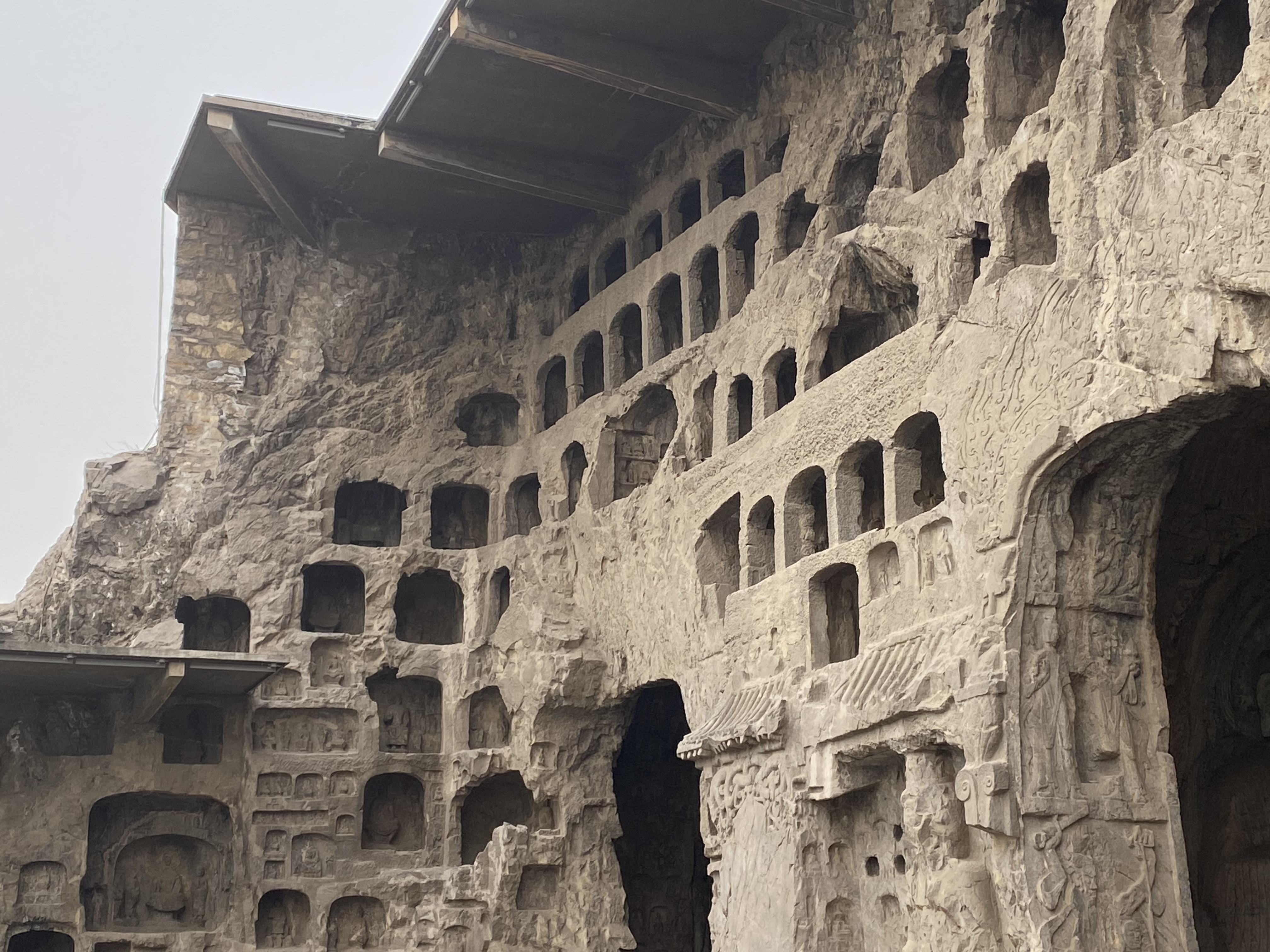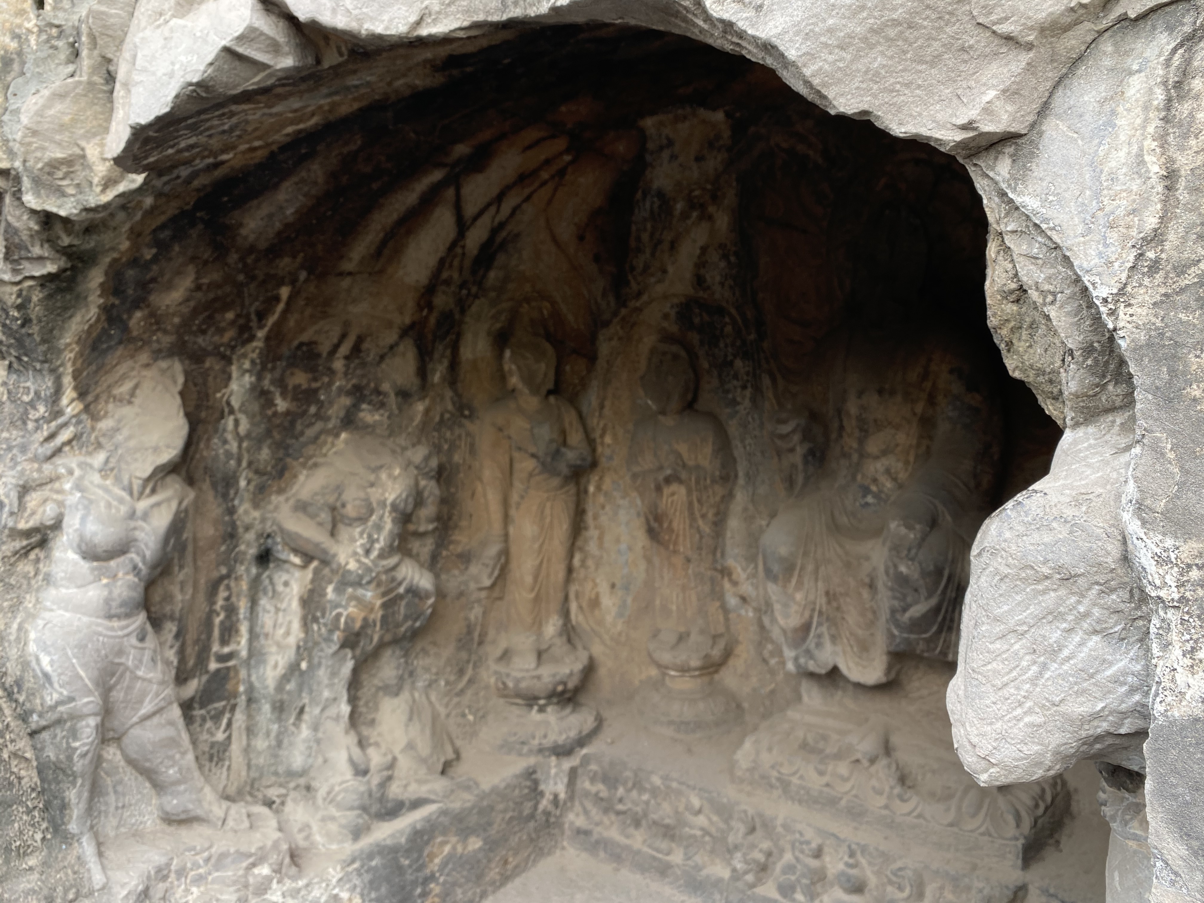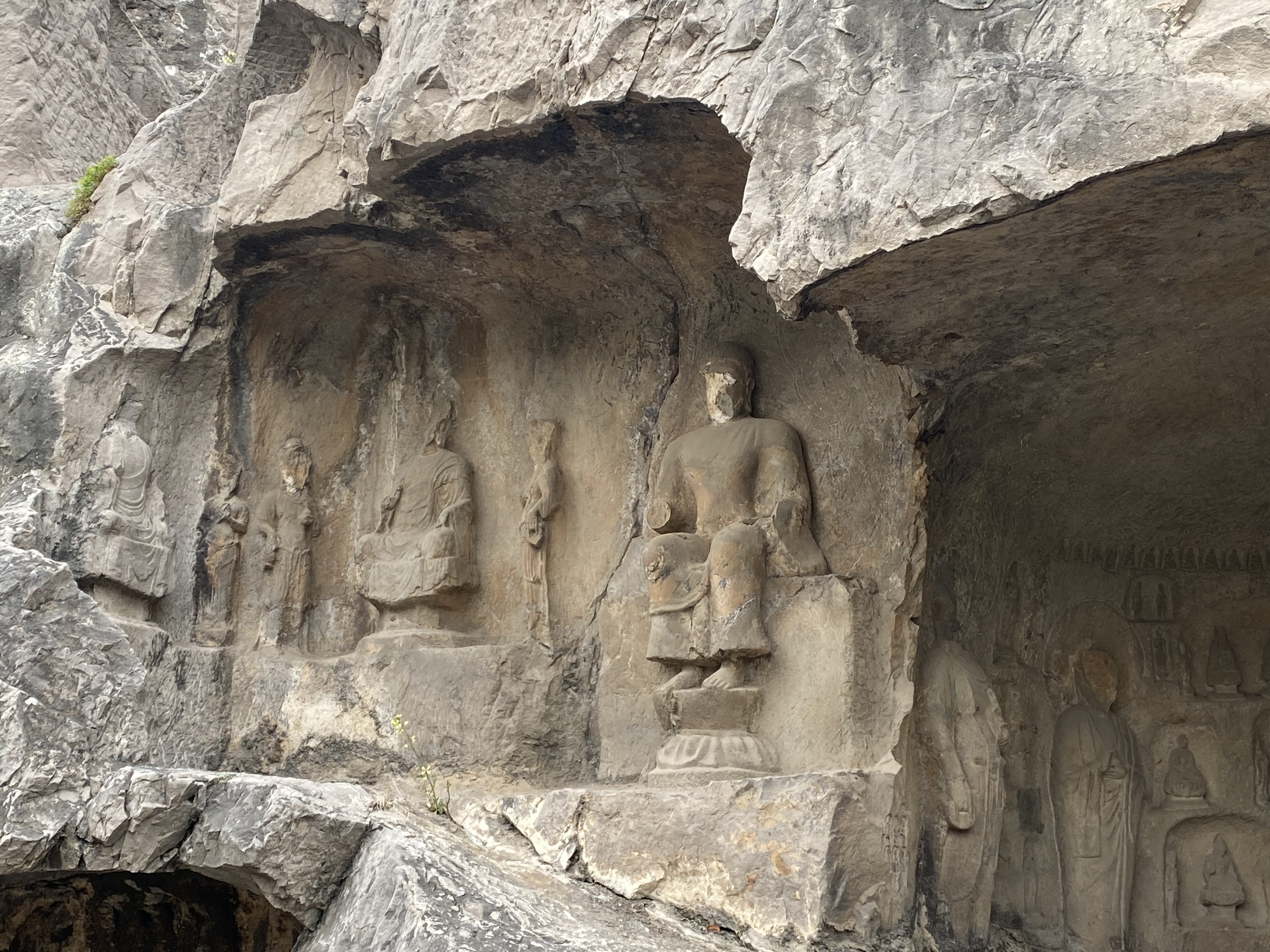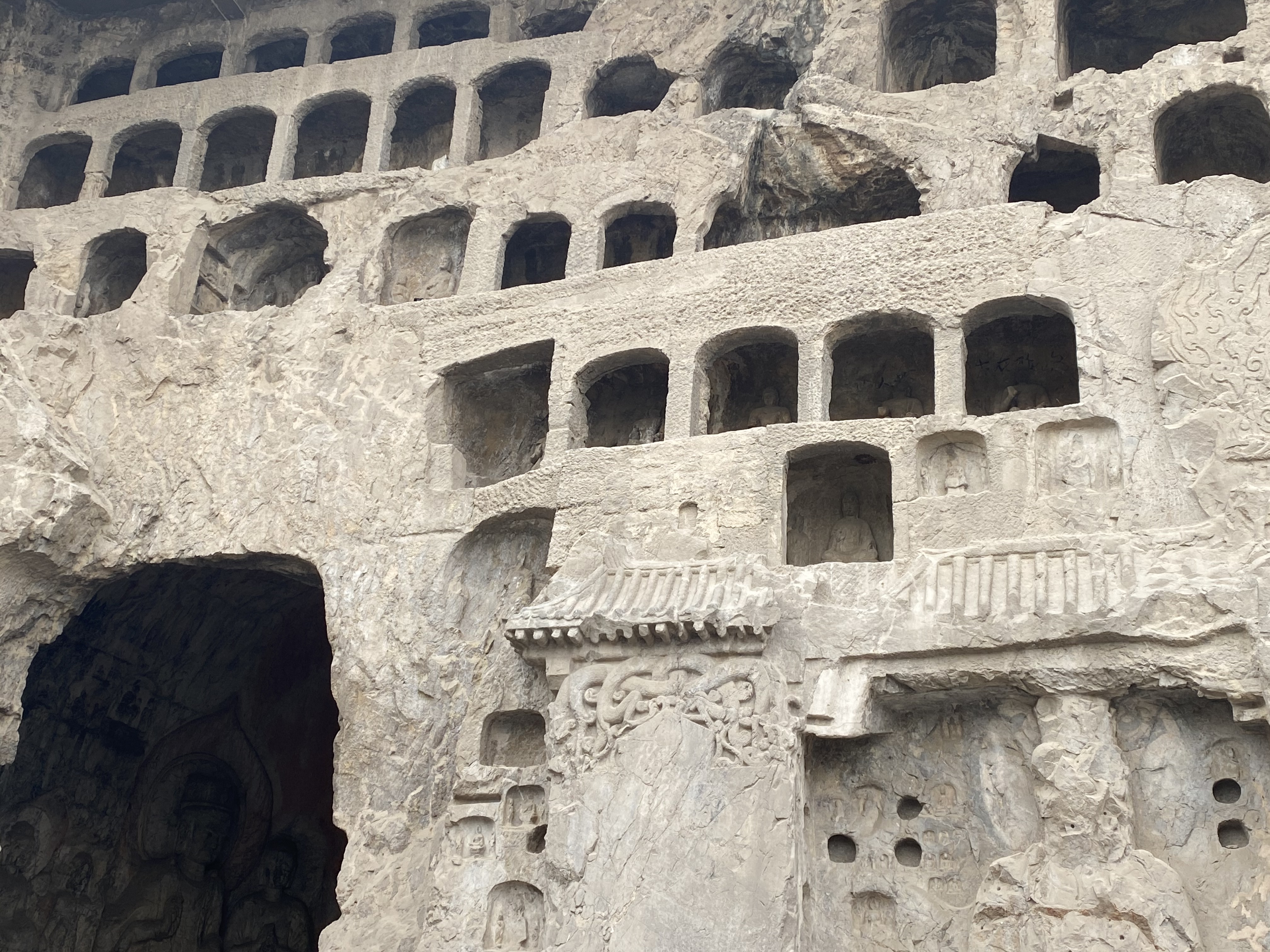 Notre périple a commencé par les grottes de Longmen (Porte du dragon), un ensemble de grottes bouddhistes excavées entre le Ve et le Xe siècle au flanc d’une falaise qui surplombe la rivière ; les chiffres donnent le vertige, plus de 2300 grottes et plus de 100 000 images ou sculptures bouddhistes.