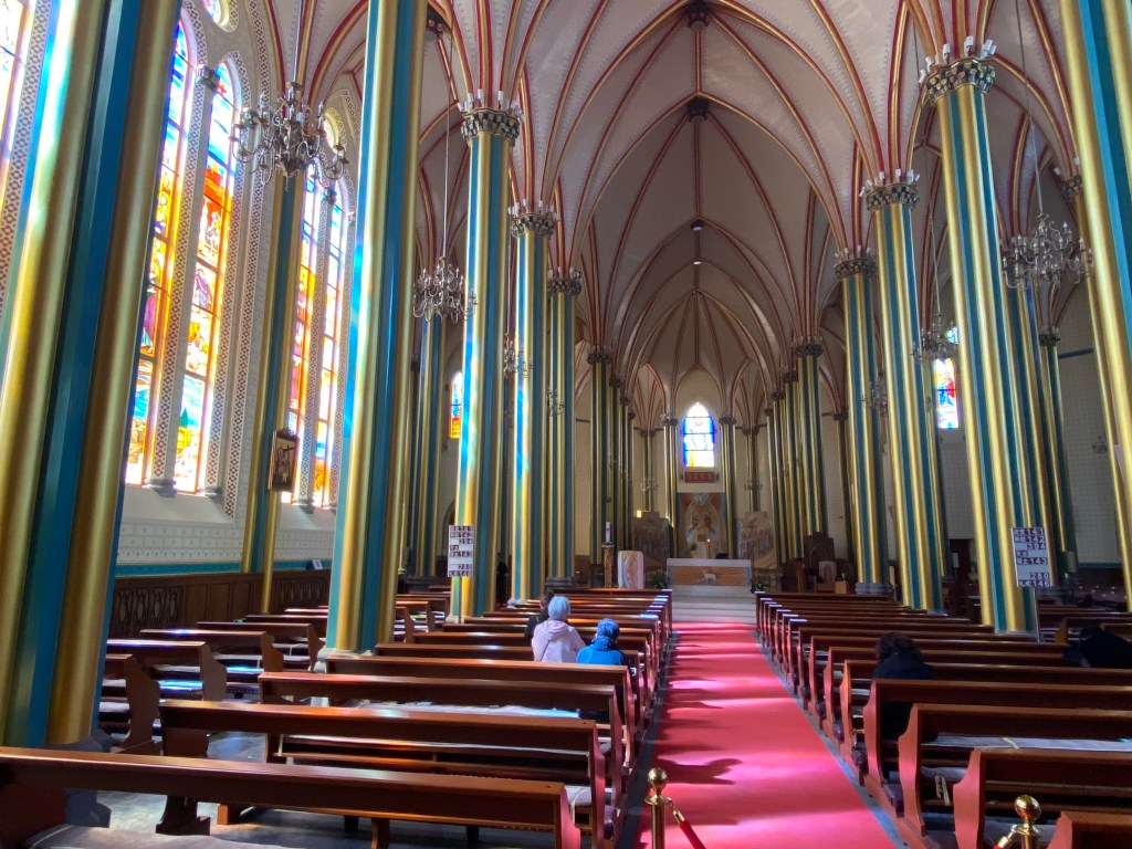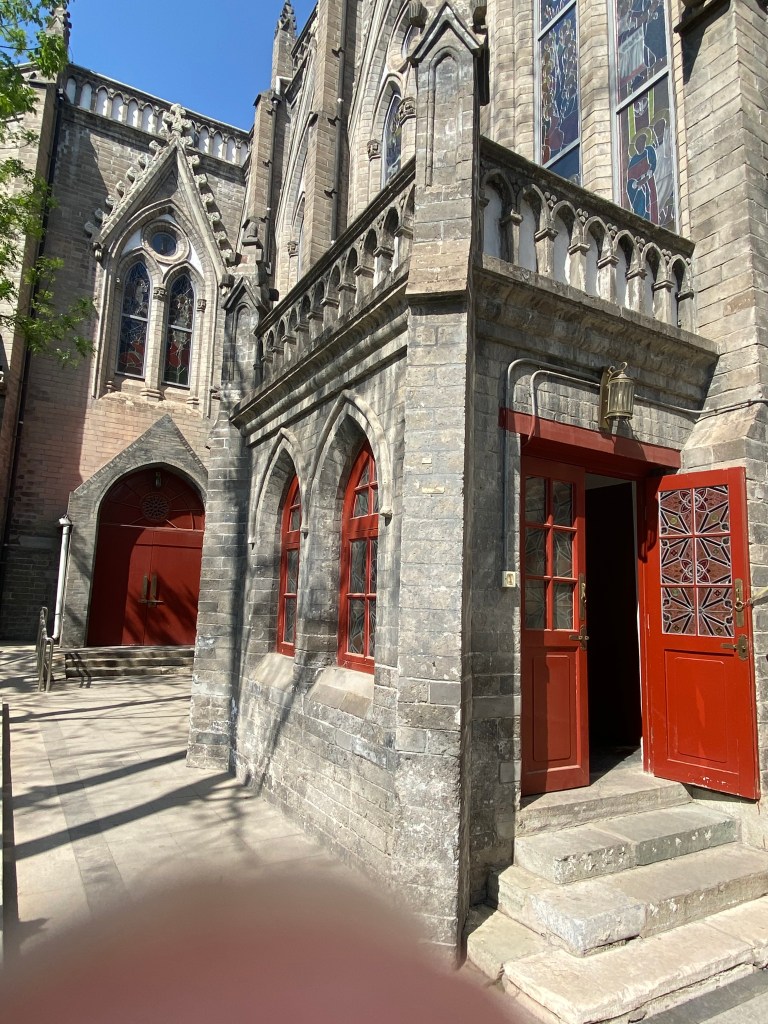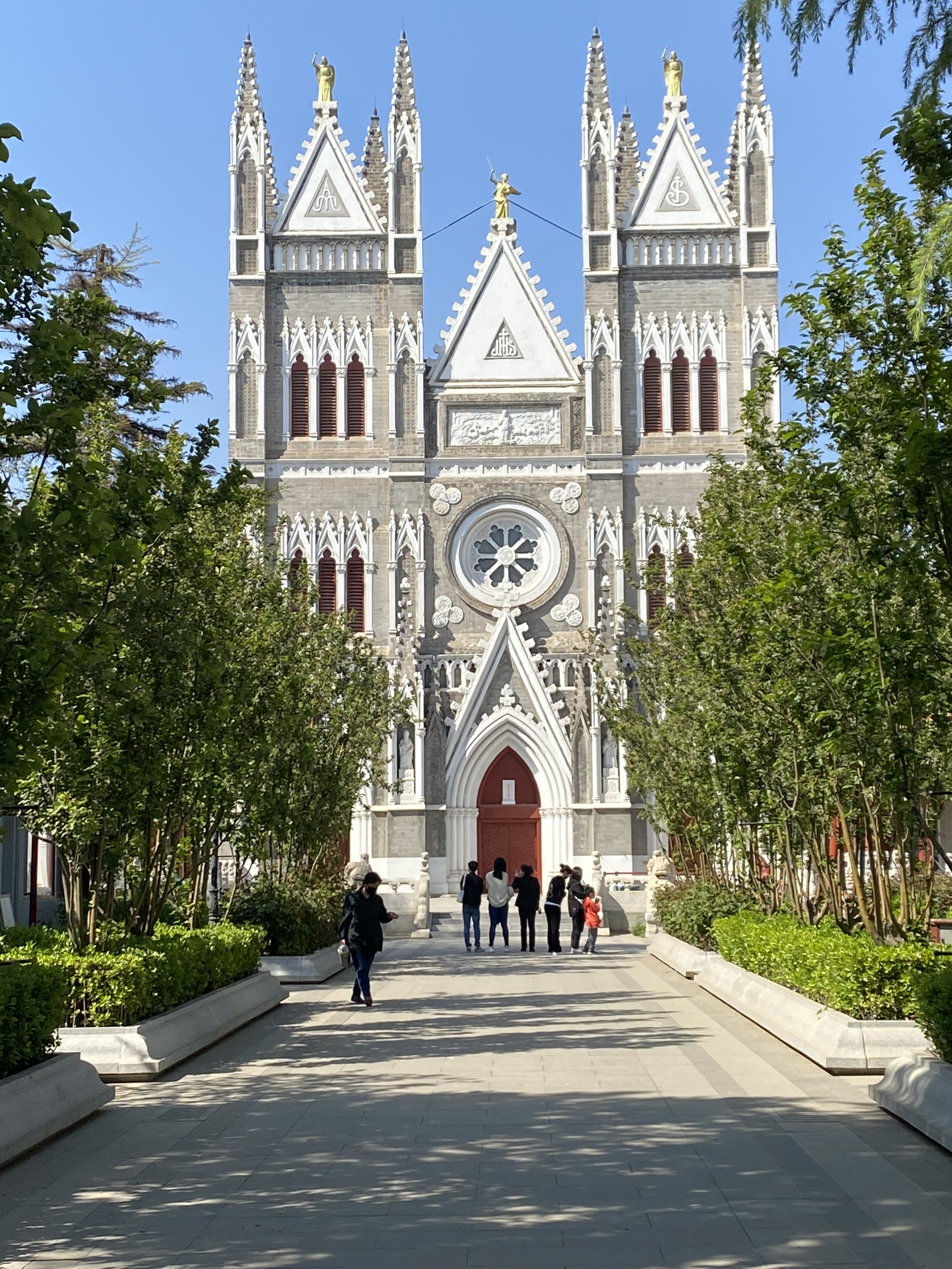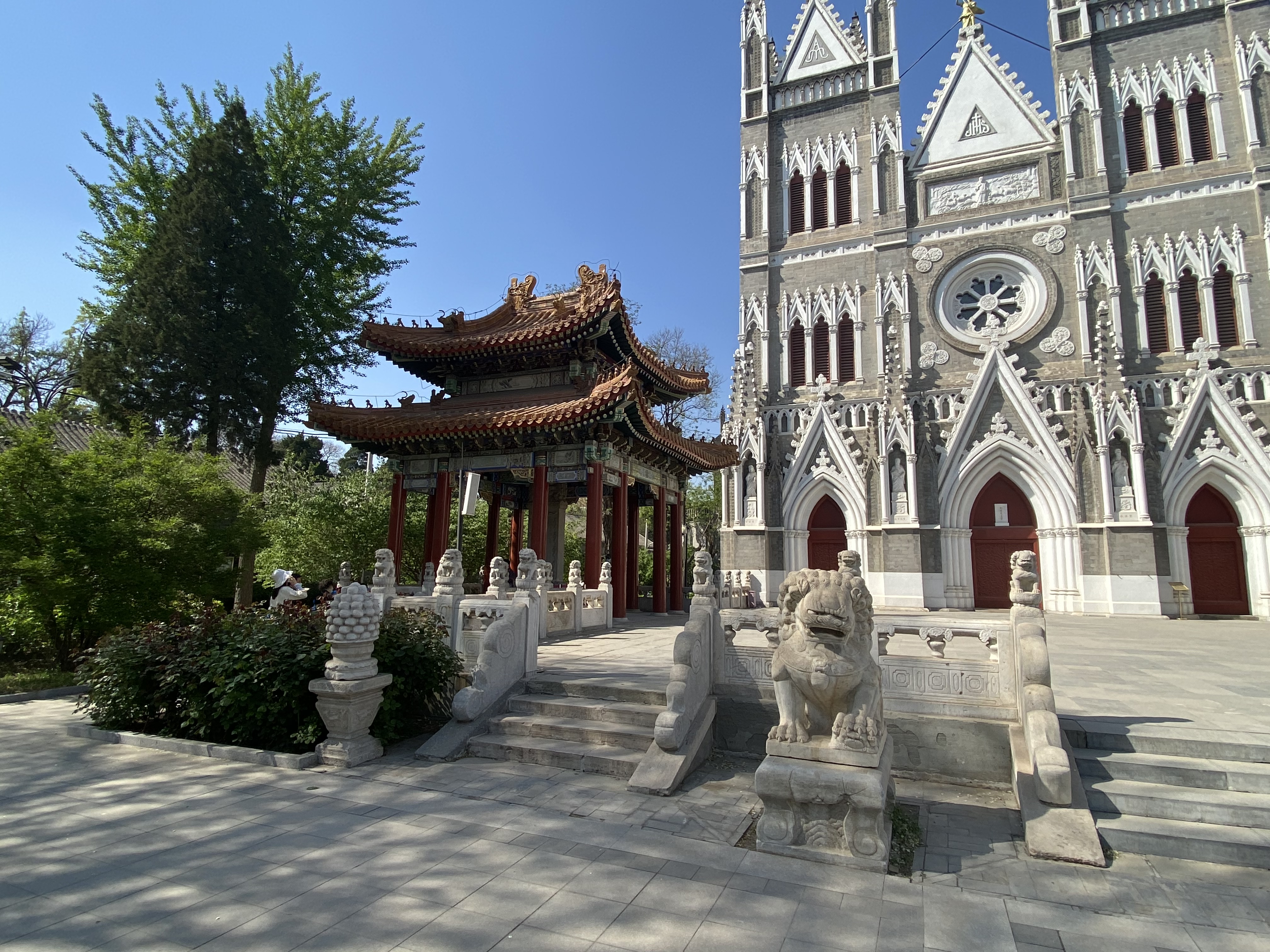 L’Eglise du Sacré Coeur, inspirée par la Cathédrale de Reims, construite au XVIIIe siècle par les Jésuites dans la Cité Interdite, a été détruite et reconstruite à l’identique plus loin à la fin du XIXe siècle. Elle a été entièrement rénovée au tournant du XXIe siècle, d’où son apparence pimpante. La Chine abrite 70 millions de Catholiques, soit 5% de la population environ, qui ont leurs églises, leurs diocèses et leurs dignitaires religieux.