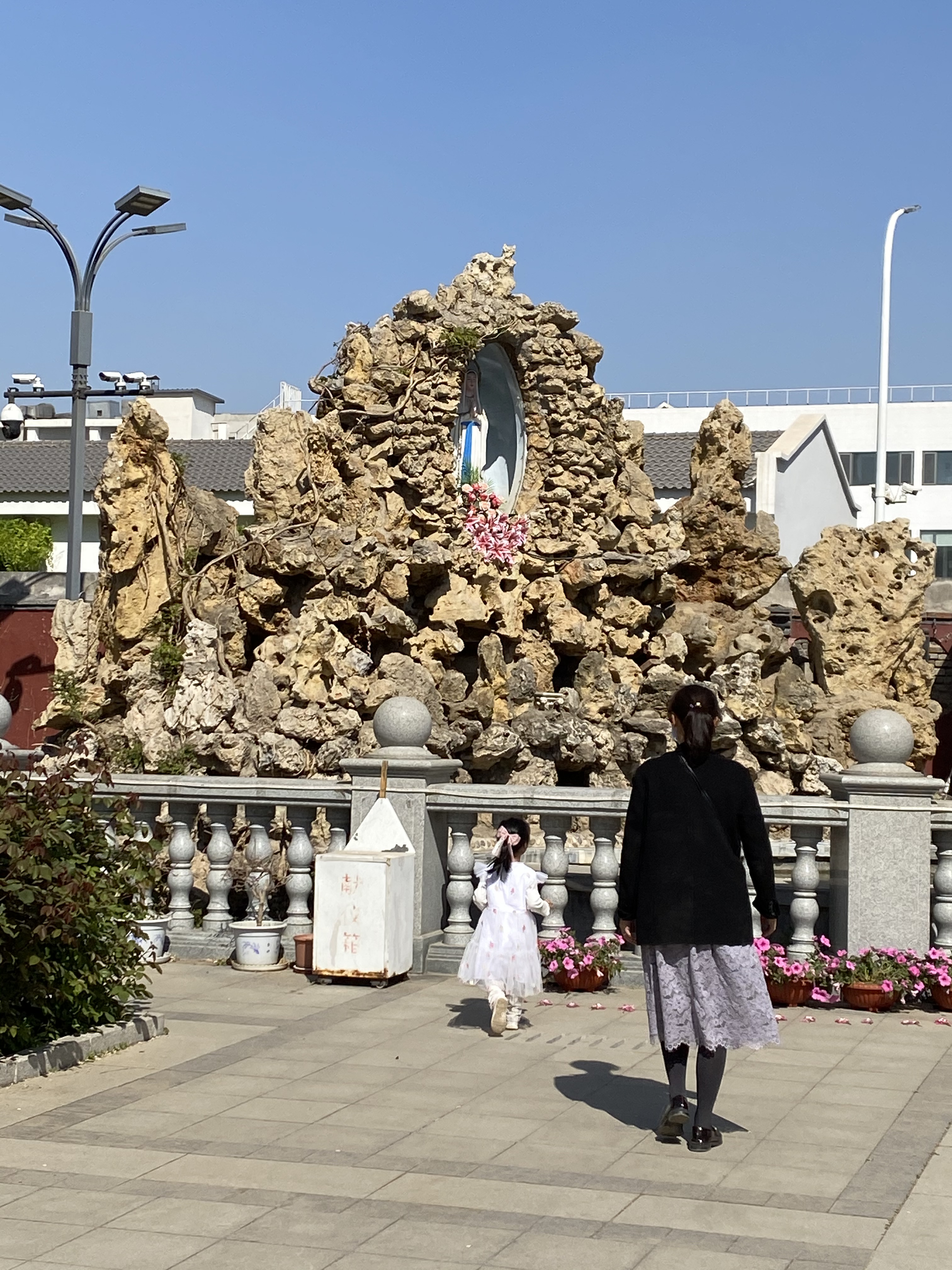 Une grotte artificielle directement inspirée de Lourdes, s’adossait à un environnement moderne éclectique, juxtaposition bizarre… Je dois dire que la conception chinoise n’est pas plus enthousiasmante que la conception française.
