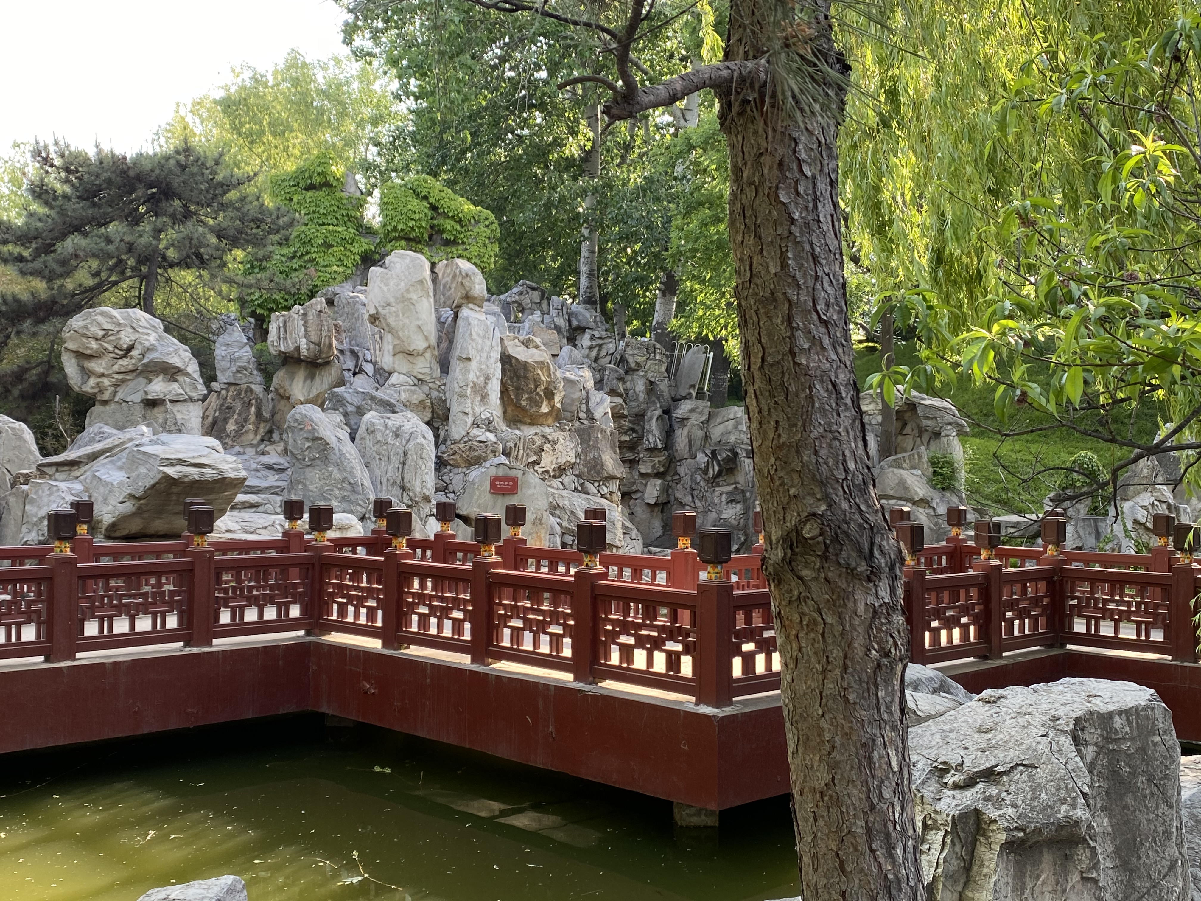 L’intérêt était de parcourir ces chemins sinueux qui vous mènent d’un pavillon à l’autre, sur les pas des héros de ce roman, dans une architecture de l’époque Qing reconstituée ; sur des ponts de bois longeant des rocailles artificielles, du plus bel effet malgré leur caractère factice.
