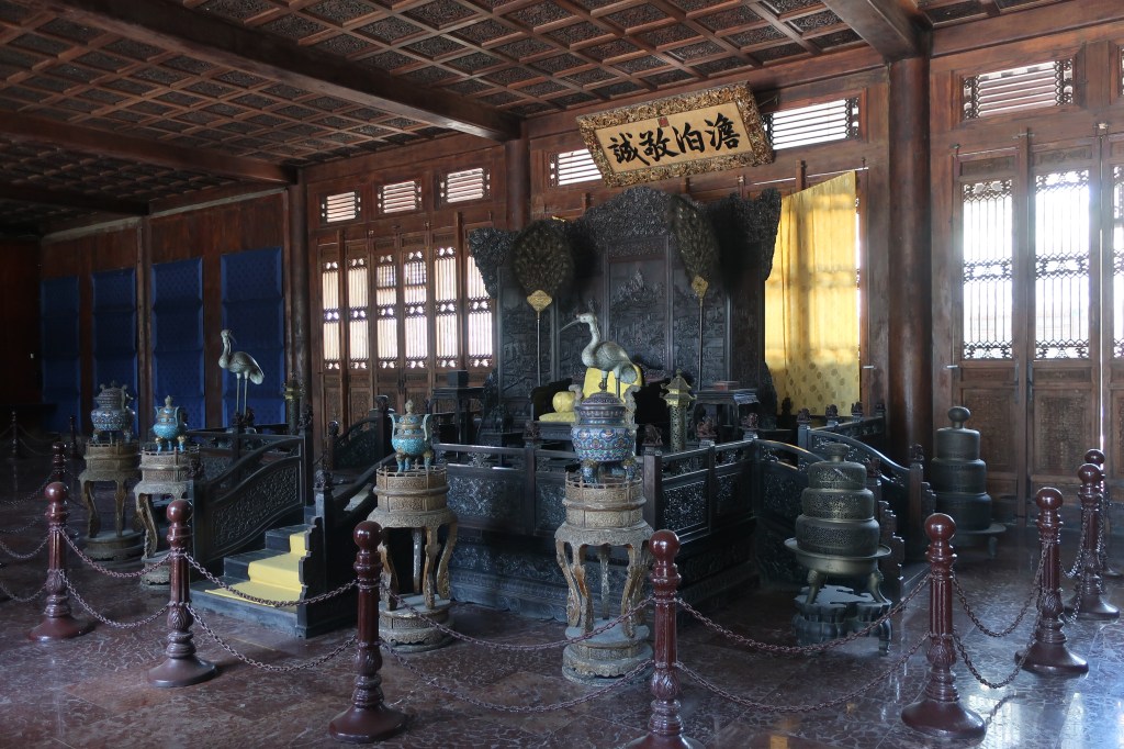 Vient ensuite le palais proprement dit, transformé en musée, avec de bien belles choses, des horloges que l’Empereur a fait réaliser en Europe (je ne vous montrerai pas de photo, les reflets étaient trop importants pour arriver à en tirer quelque chose), des gravures sur ivoire ou jade de toute beauté également.