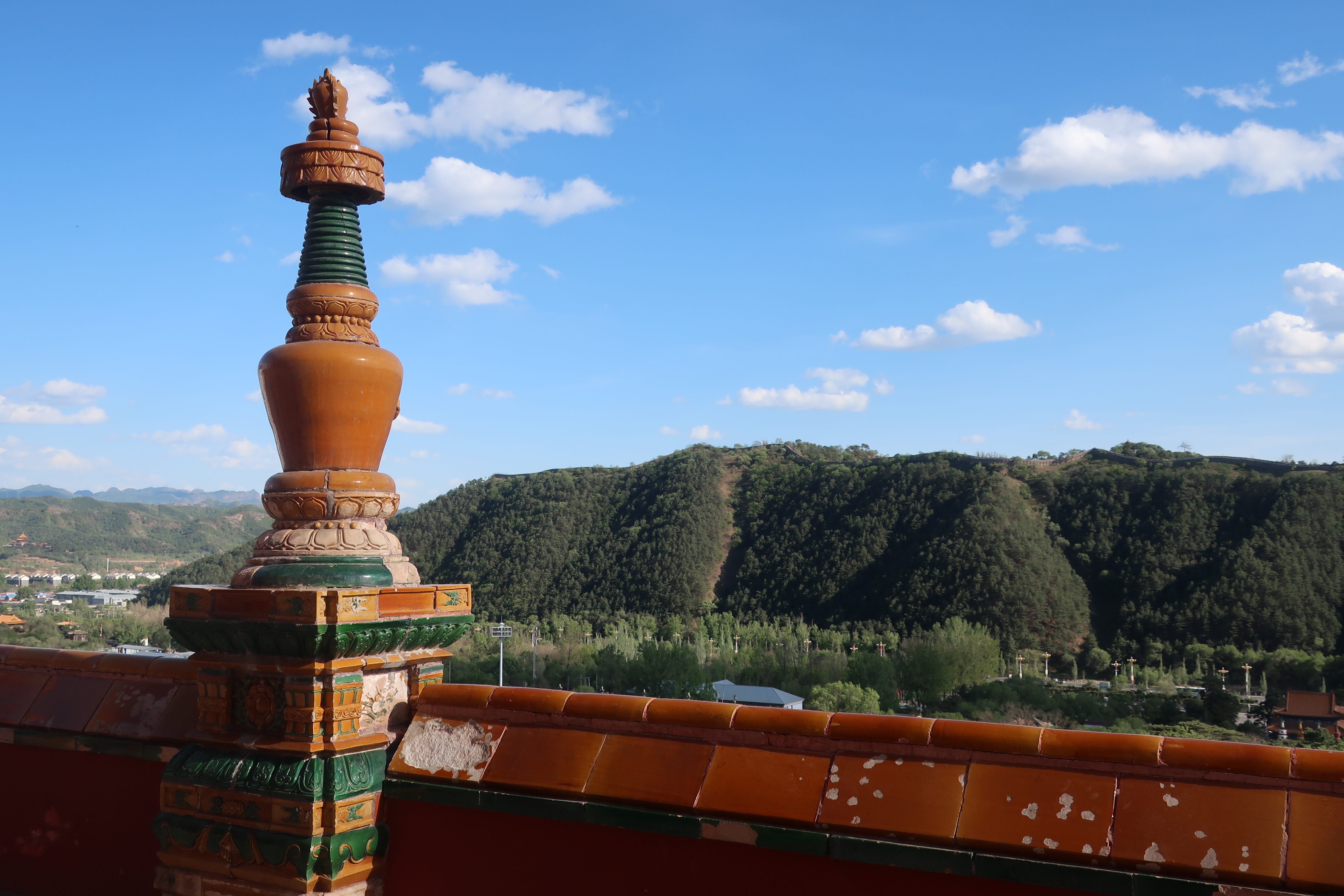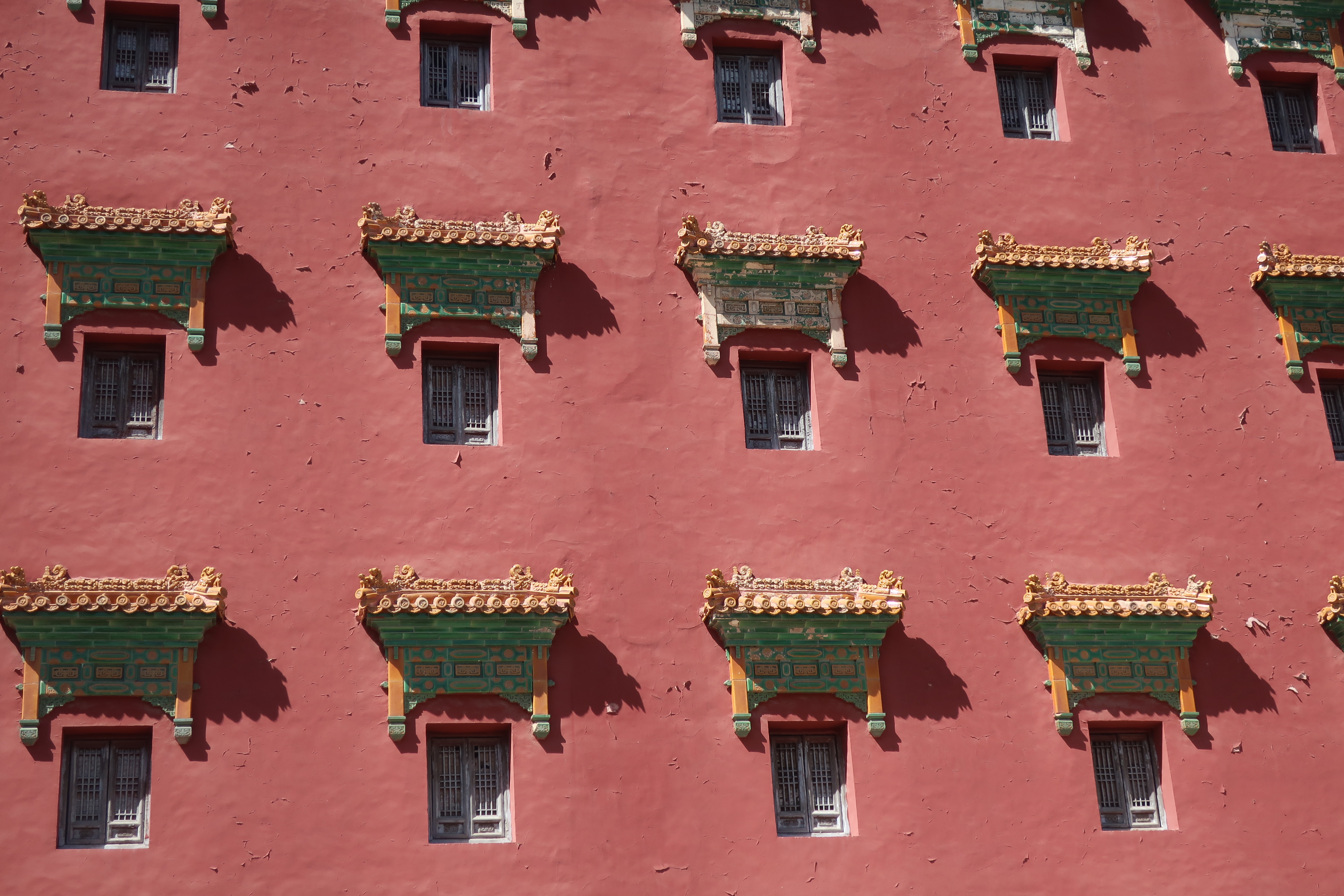 Là encore, la même distribution que dans le temple précédent, en première façade des édifices de type Han, qui laissent ensuite la place à des constructions tibétaines. Nous pourrions faire un jeu des sept erreurs en comparant ces premiers édifices avec ceux du Temple Xumi Fushou, le parallèle entre les deux constructions est étonnant…