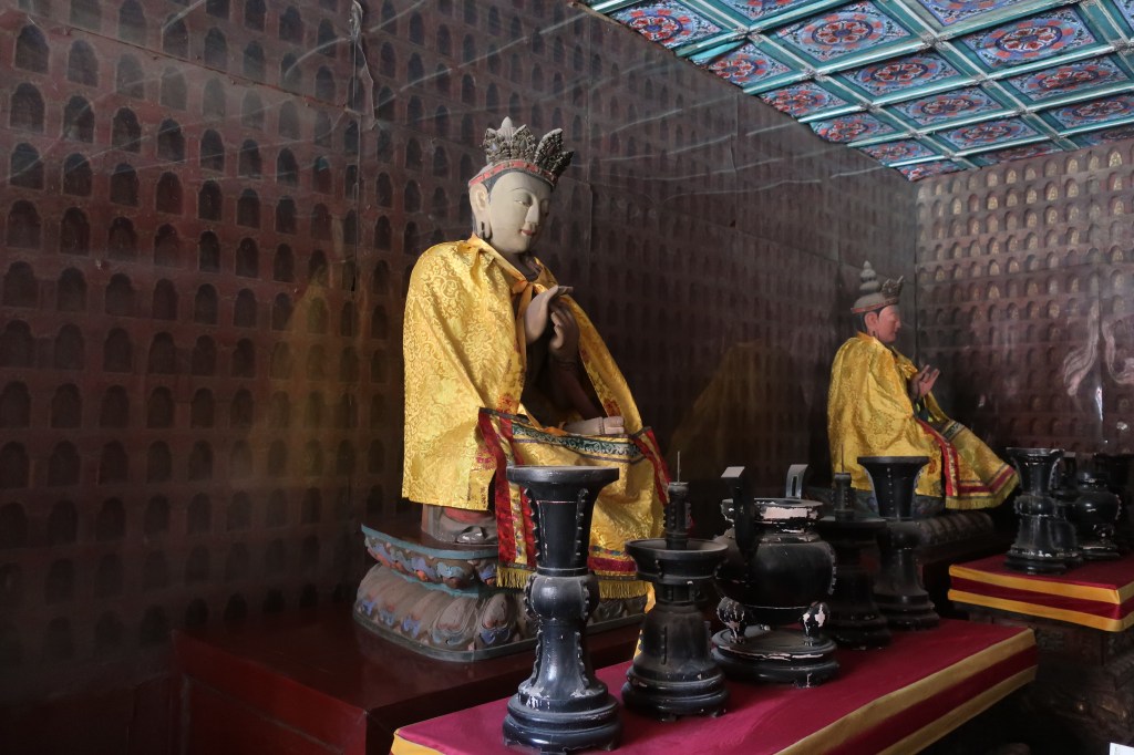 Nous avons comme franchi une frontière culturelle en quelques mètres pour nous retrouver sur le toit du monde, dans un monastère tibétain comme égaré ici. Préciosité des plafonds cloisonnés bleu azur et innombrables niches abritant autant de figurine de Bouddha, qui entourent les statues immuables habillées de brocart jaune.