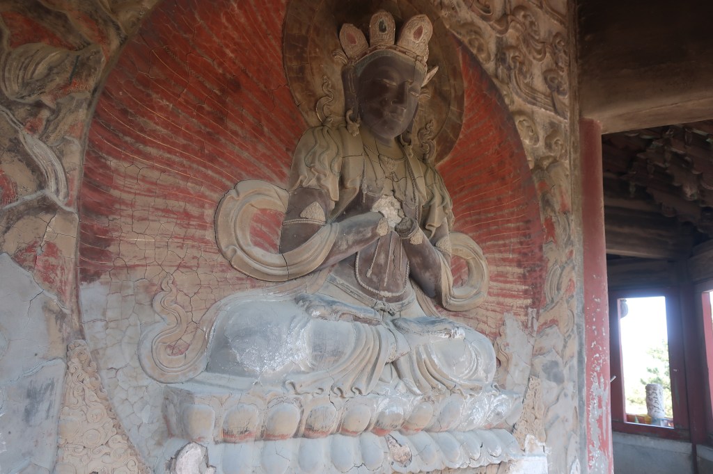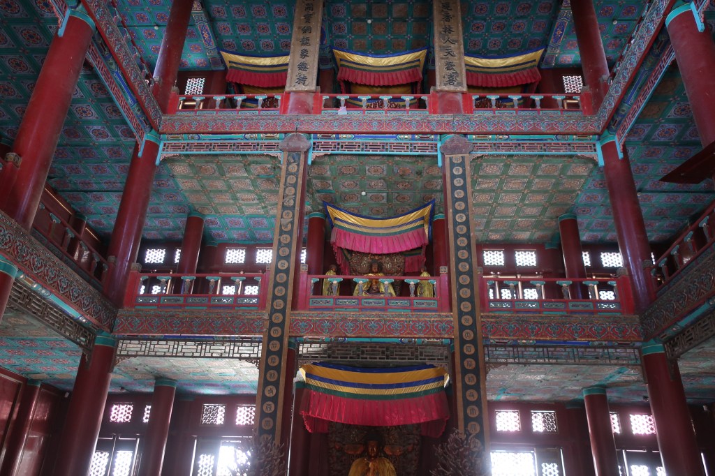 Et nous voilà arrivés au bâtiment le plus haut, le Temple de la longévité, destiné à promettre et souhaiter une longue vie à l’Empereur. Orné de tuiles vernissées jaunes et vertes, il abrite de superbes statues de bouddhas en ronde-bosse.