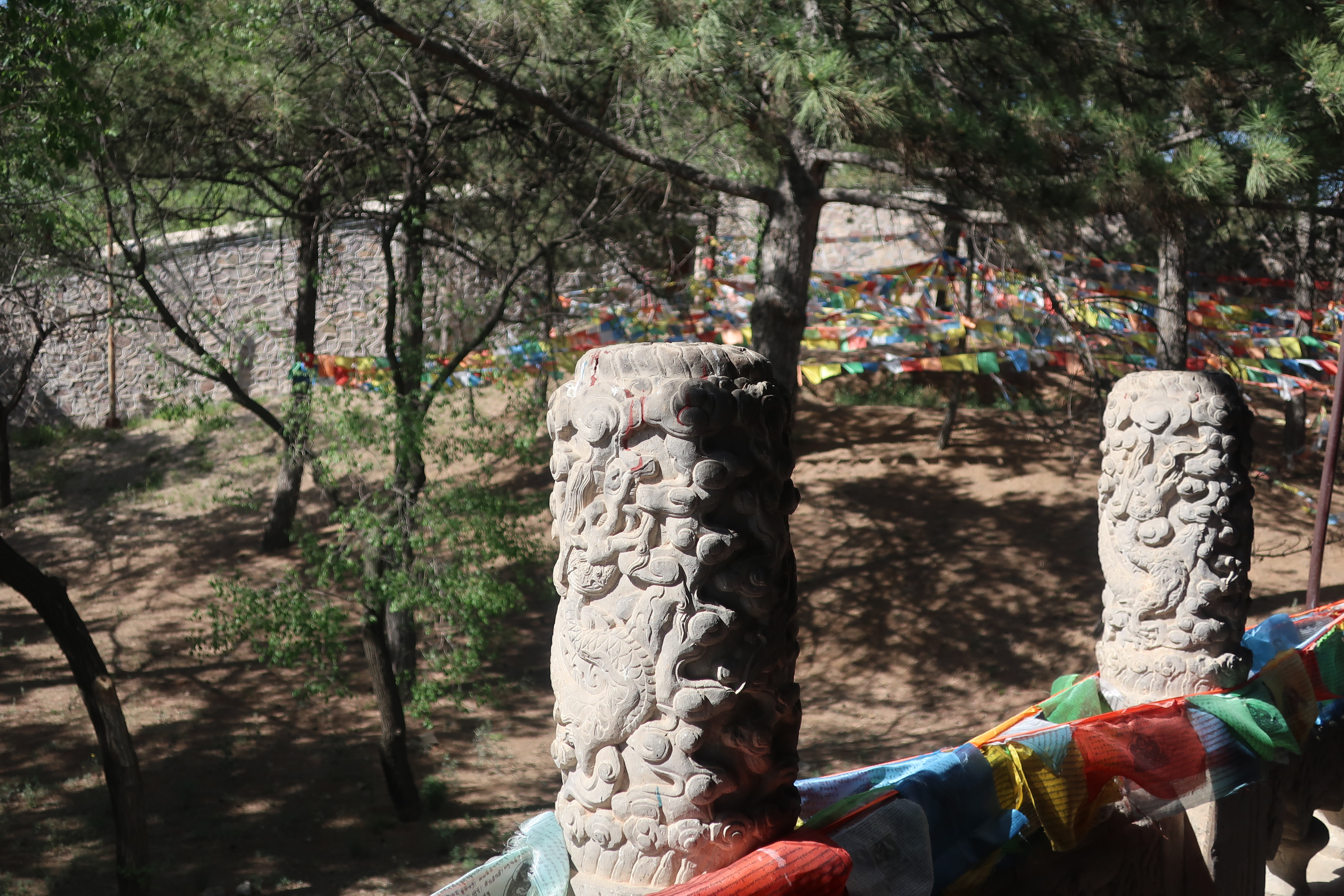Des carrés de tissu votifs colorés s’accrochent à la balustrade de pierre et à la forêt alentour. Cette promenade au coeur de ce lieu paisible, sans personne (à l’aune de la Chine), avec ce temps idéal nous a enchantés.