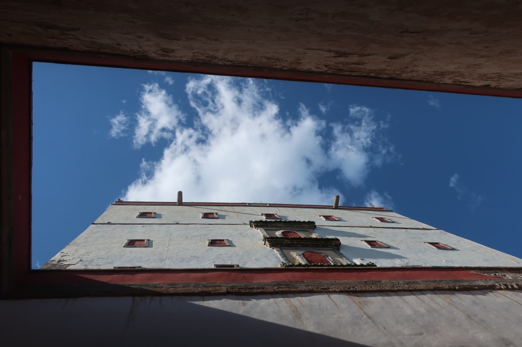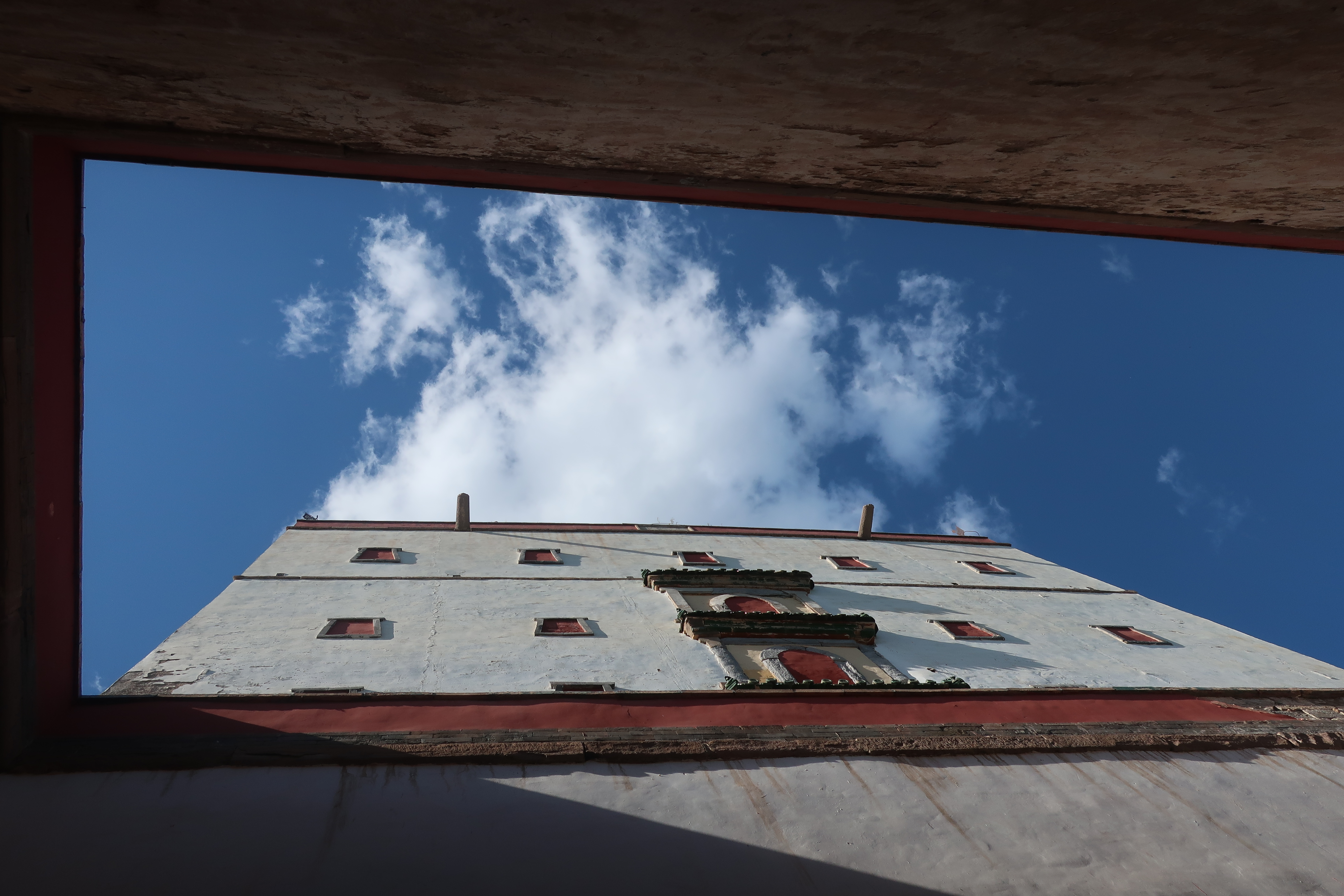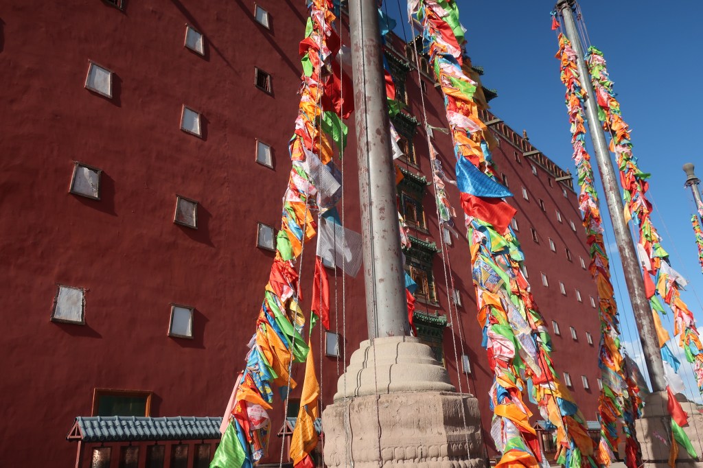 C’est un ensemble bien plus aéré que le précédent, des arbres, des chemins qui serpentent et vous amènent d’un bâtiment à l’autre. Le style a drastiquement changé, constructions austères aux fenêtres typiques du Tibet, stupas en forme de bulbes colorées sur les toits