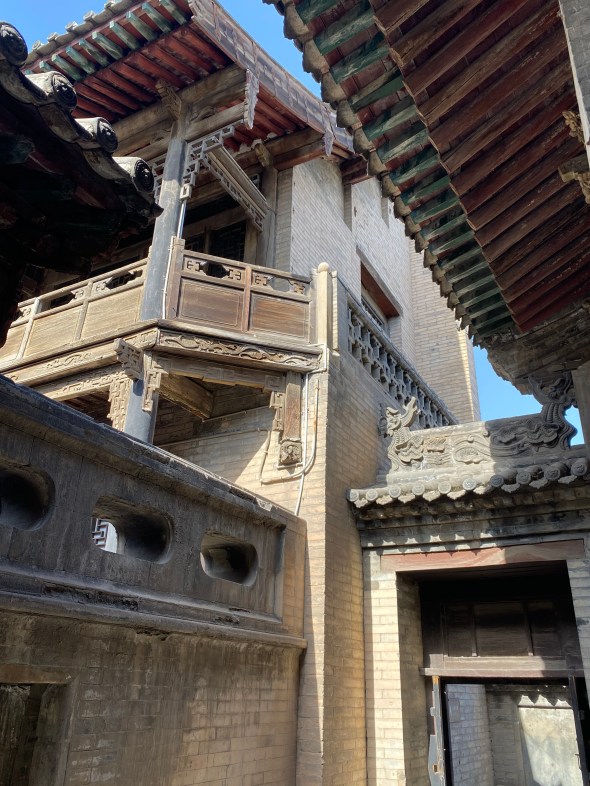 Nous voilà arrivé à la « Maison du Clan Qiao », bâtie par Qiao Zhiyong, le fondateur d’une dynastie de marchands célèbres du Shanxi, à partir du milieu du XVIIIe siècle ; les bâtiments ont été agrandis peu à peu pour loger toute la descendance de cette famille et l’ensemble a atteint 26 000 m² avec 730 pièces réparties autour de 18 grandes cours et d’innombrables cours secondaires. Les affaires du Clan Qiao ont été florissantes pendant presque deux siècles, banque (avec deux grandes enseignes, Da De Tong et Da De Heng, qui avaient des succursales dans tout le pays et à l’étranger), mais aussi commerce du thé, la famille fait partie de ces aventuriers qui ont parcouru la route du thé (茶马古道 – la route du thé et des chevaux), allant jusqu’au Tibet au nord ou au Népal au sud, pour rapporter les essences les plus rares. L’histoire a pris fin dans les années 1950 avec la liquidation des deux banques principales.