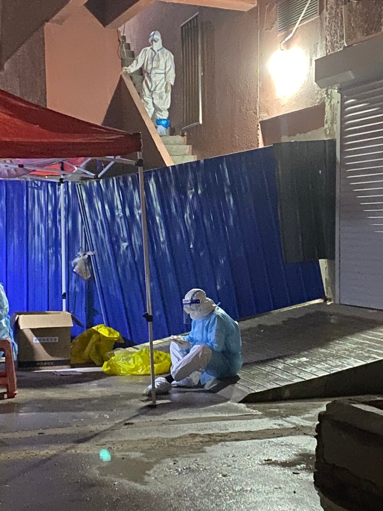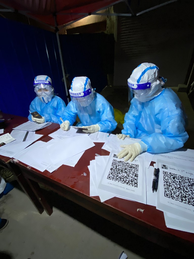 Nous débarquons à 16 h à Tianjin, à 100 kms de la capitale, puisque Pékin est fermée aux vols internationaux entrants jusqu’à nouvel ordre. Et là commence un parcours dans ces espaces sans lumière que j’ai expérimentés il y a un an, au milieu de fantômes blancs zébrés de bleu. Entretien avec un employé via caméra, montrer le code Q/R vert, le passeport, un papier vert rempli dans l’avion. Puis test PCR musclé, dans le nez et la gorge. Passage de la douane, je suis restée debout avec mon sac à dos 20 minutes devant une employée vraiment consciencieuse.