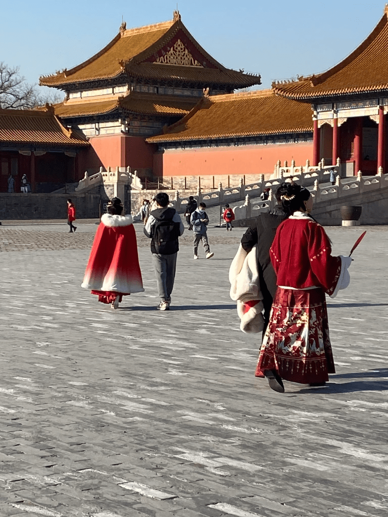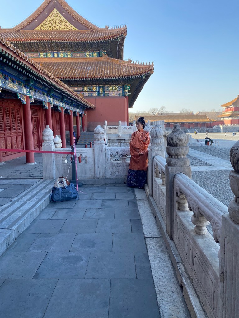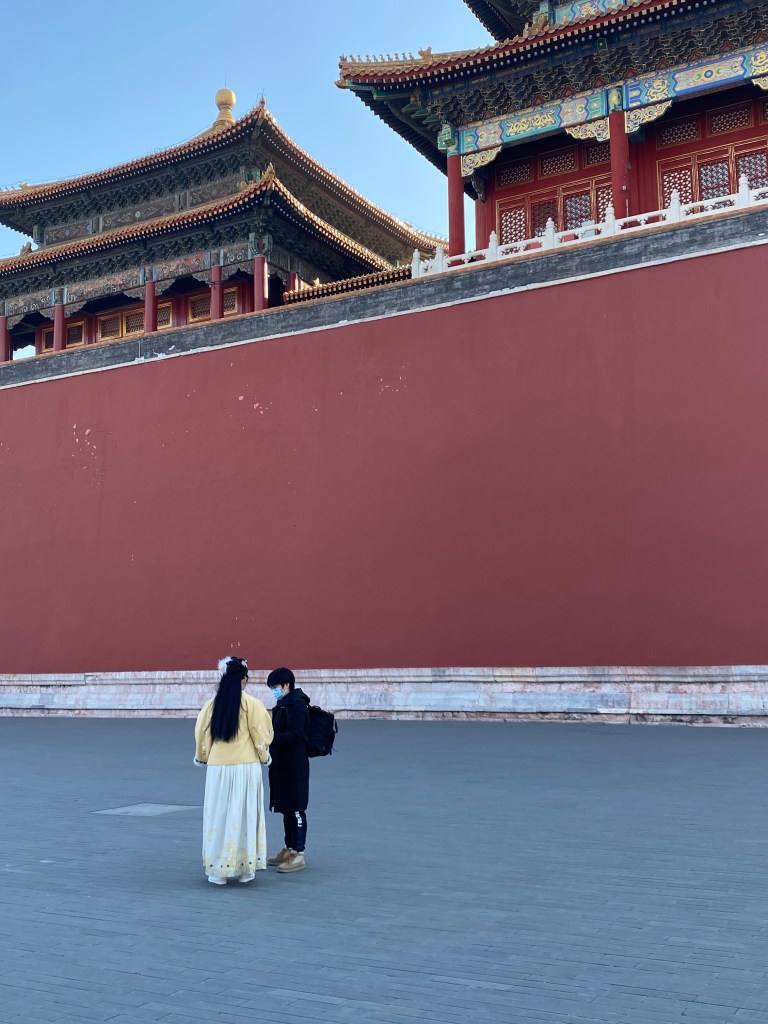 Ces couples, ou plus souvent ces femmes, revêtus de costumes de l’ancien temps, j’en ai croisé souvent dans les monuments historiques de Pékin. La Cité Interdite les rassemble plus qu’ailleurs ; faut-il y voir un nationalisme grandissant ou simplement l’envie de faire de beaux clichés/selfies (ce qui est un sport national ici, par exemple sur la photo ci-dessus, l’homme a un appareil photo XXL pour photographier sa compagne) ? Je ne sais… Sûrement un mixte des deux.