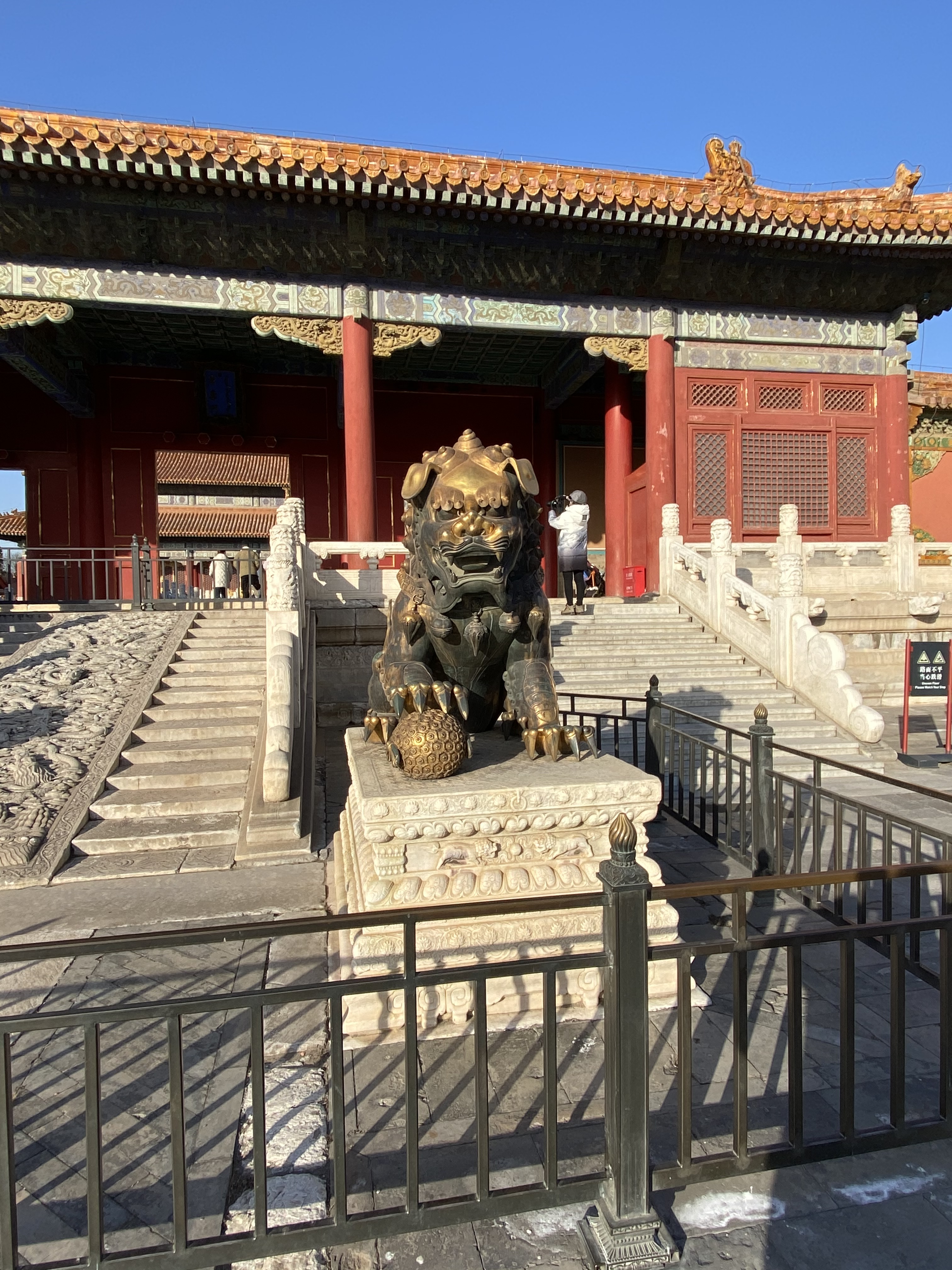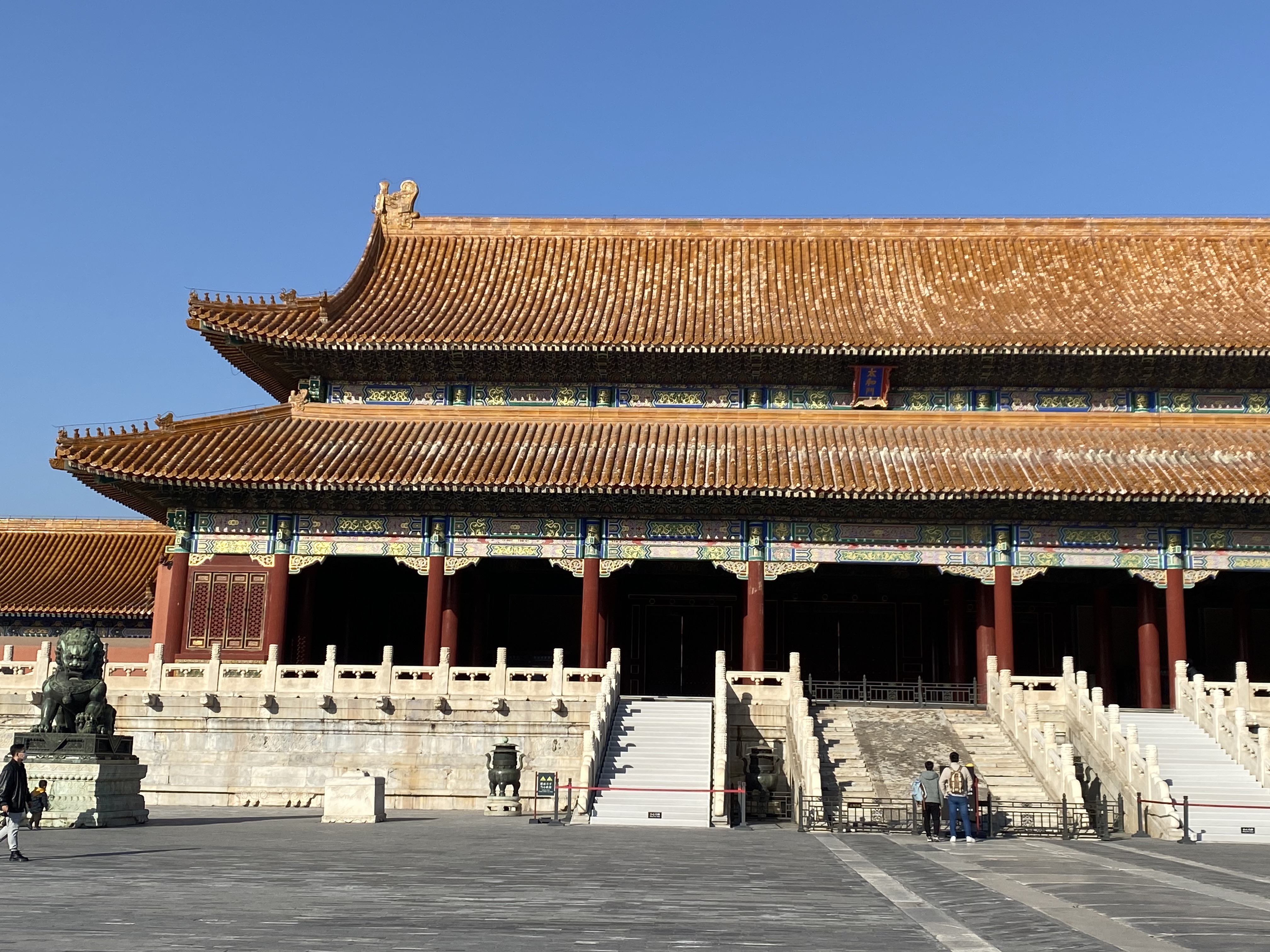 Au sud, là où se trouve l’entrée actuelle, est la partie où l’Empereur vaquait à ses occupations officielles, cérémonies et affaires politiques. Empreinte de grandeur et d’immensité, destinée à frapper l’imagination des visiteurs, elle se compose de trois bâtiments principaux en enfilade, le Pavillon de l’Harmonie Suprême, le Pavillon de l’Harmonie Parfaite et le Pavillon de l’Harmonie Préservée.