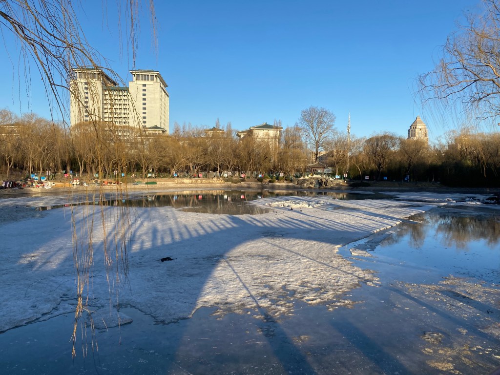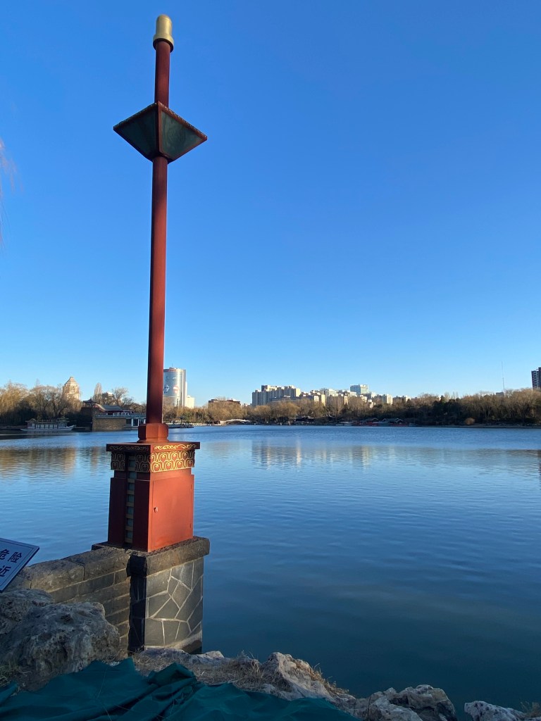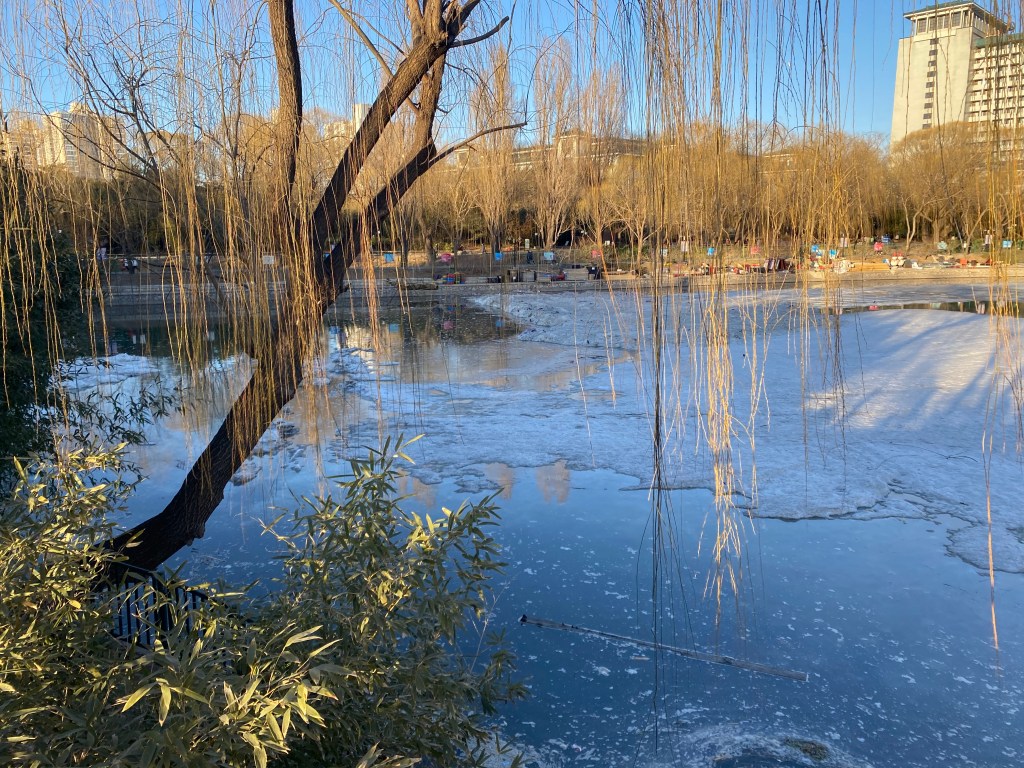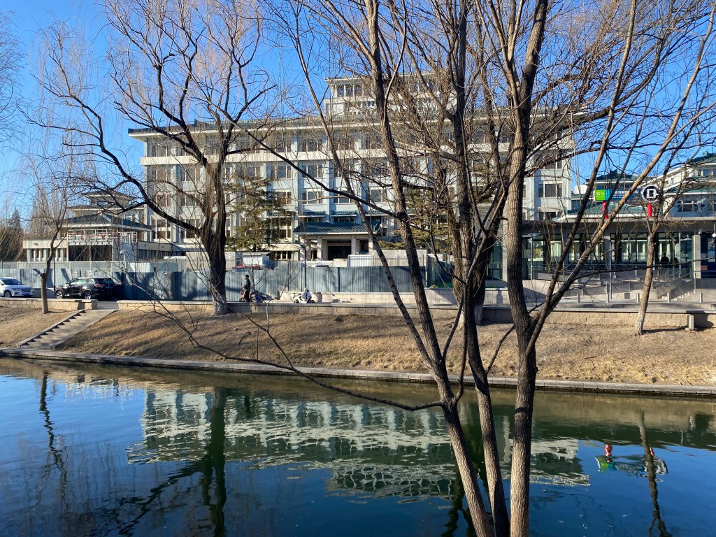 Le jardin est bordé sur sa face nord par un cours d’eau où la belle lumière de l’après-midi faisait des reflets superbes, notamment de l’édifice de la Bibliothèque nationale de Chine sur l’autre rive.
