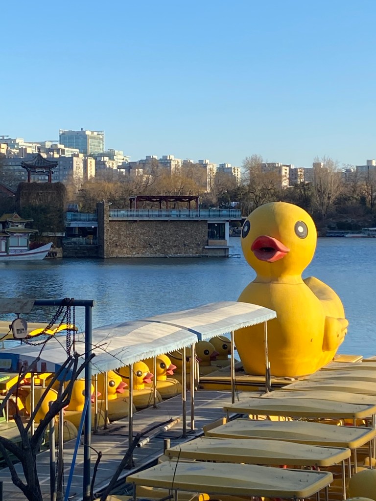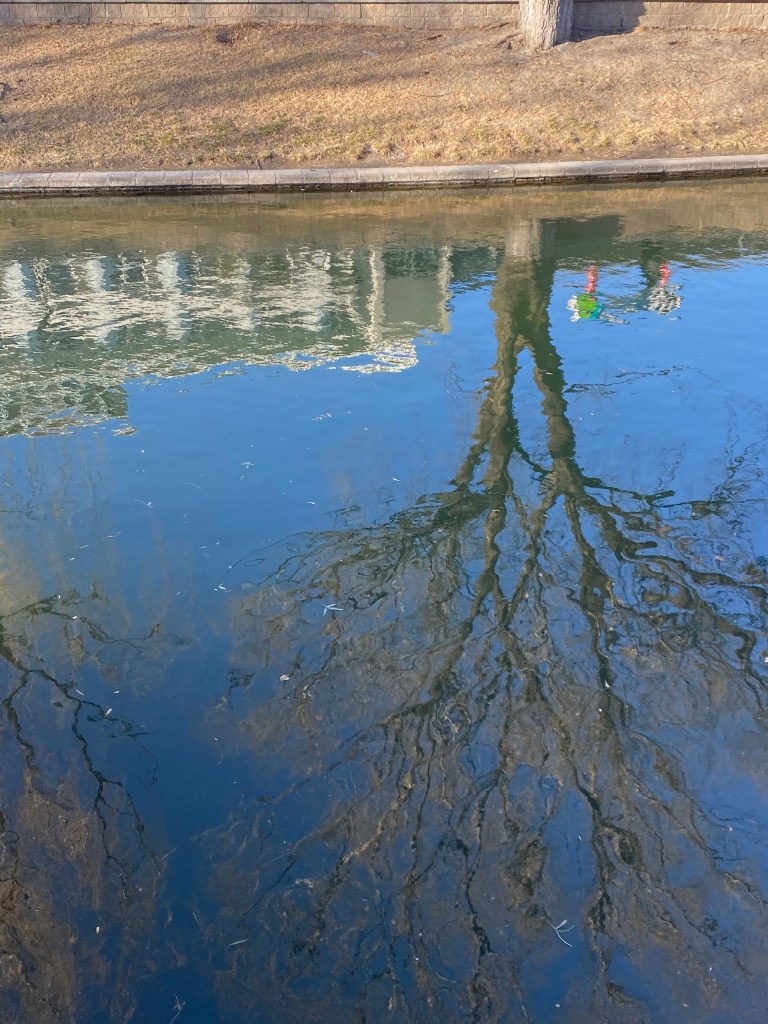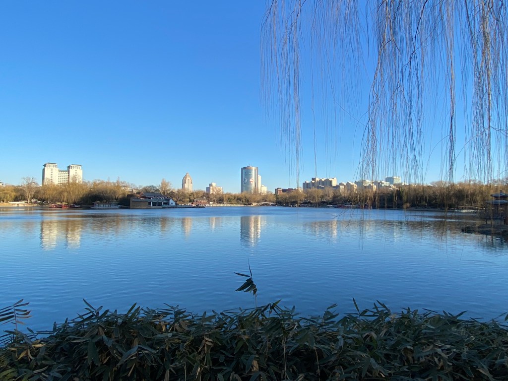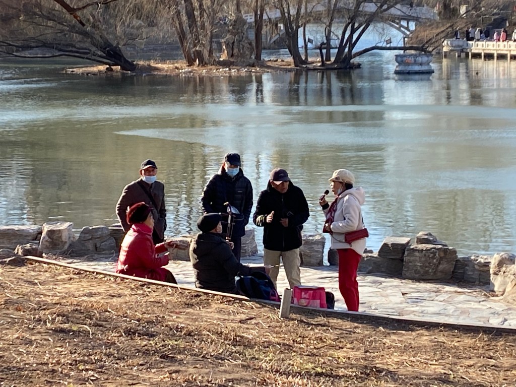 Le jardin est bordé sur sa face nord par un cours d’eau où la belle lumière de l’après-midi faisait des reflets superbes, notamment de l’édifice de la Bibliothèque nationale de Chine sur l’autre rive.