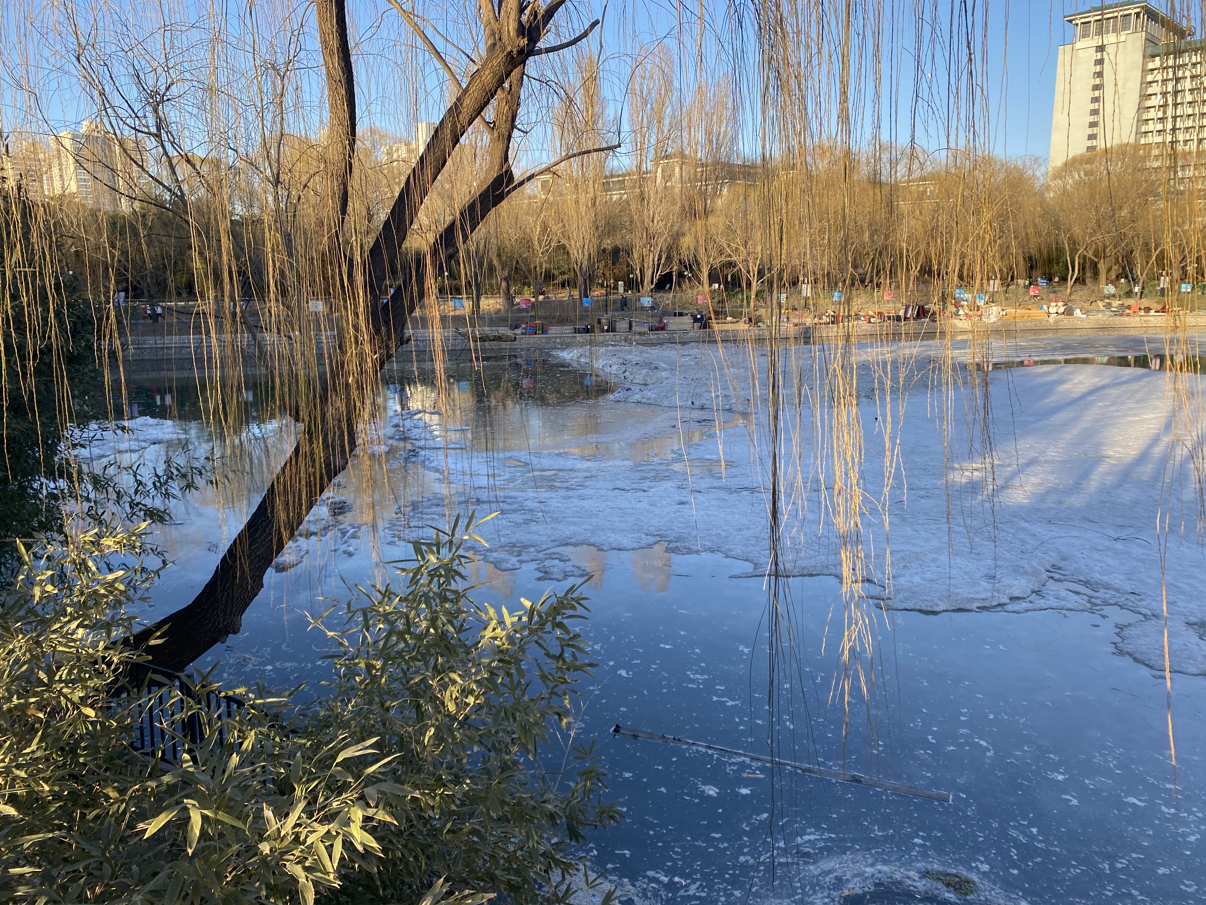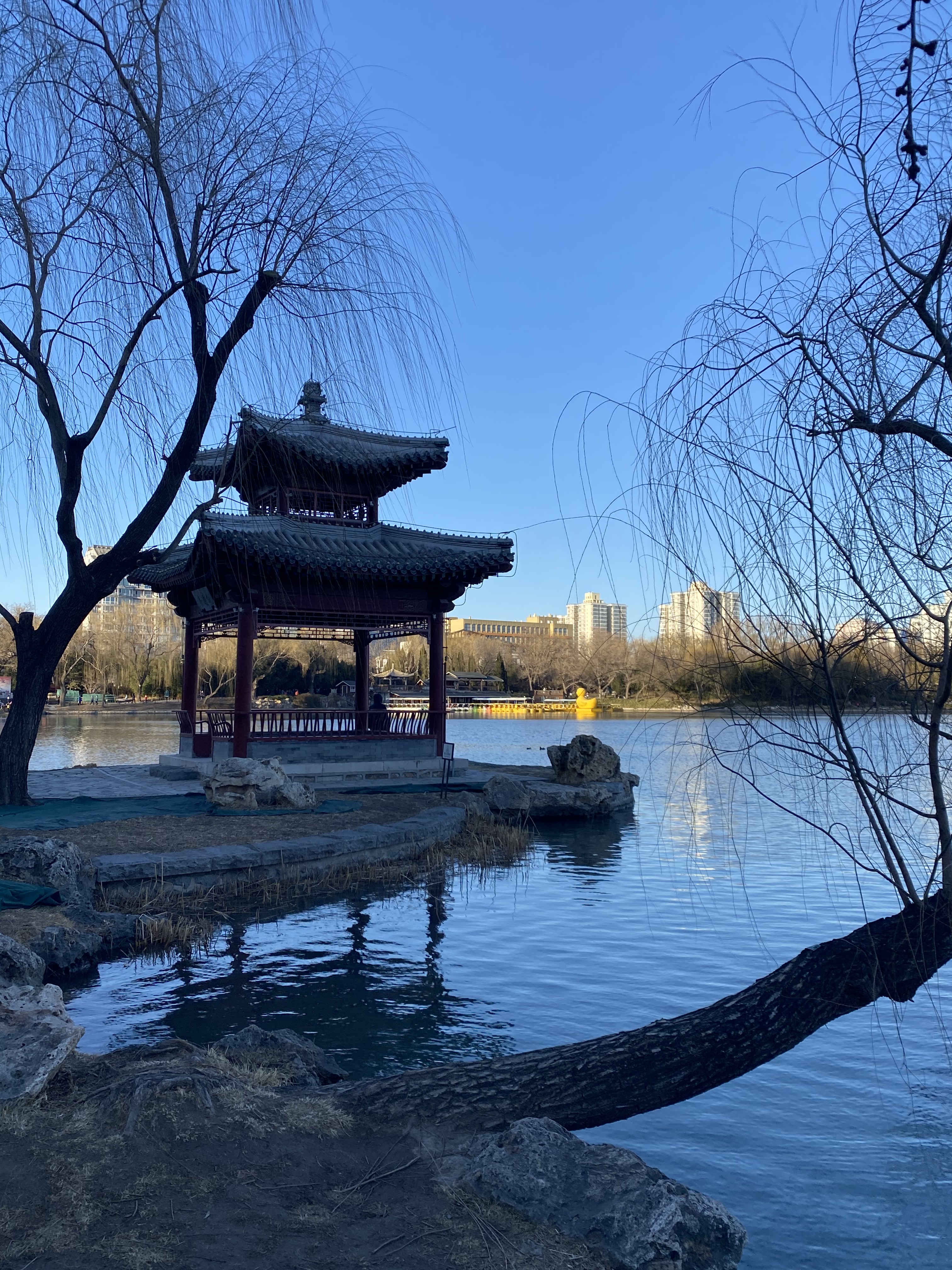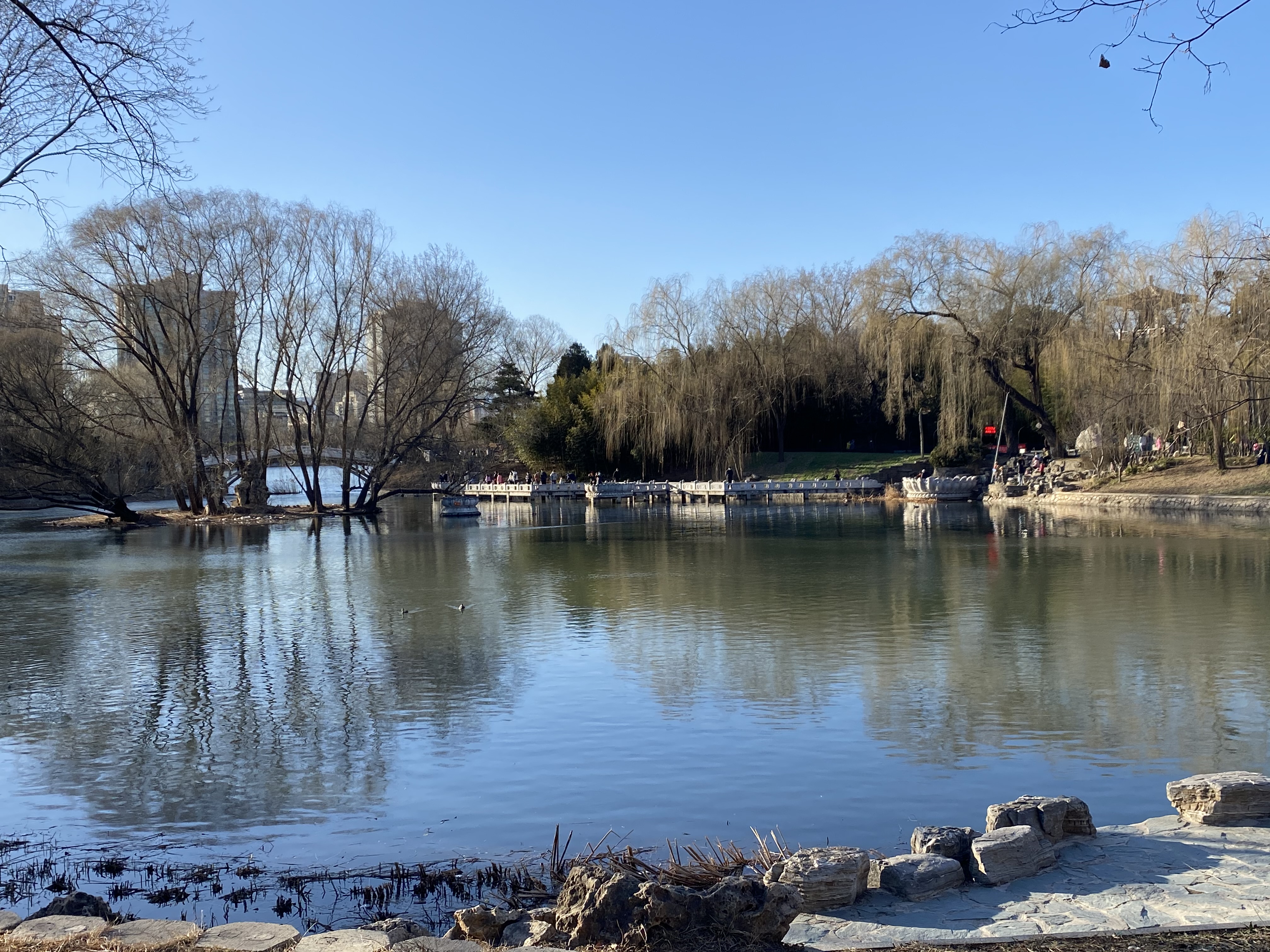 Le jardin est bordé sur sa face nord par un cours d’eau où la belle lumière de l’après-midi faisait des reflets superbes, notamment de l’édifice de la Bibliothèque nationale de Chine sur l’autre rive.