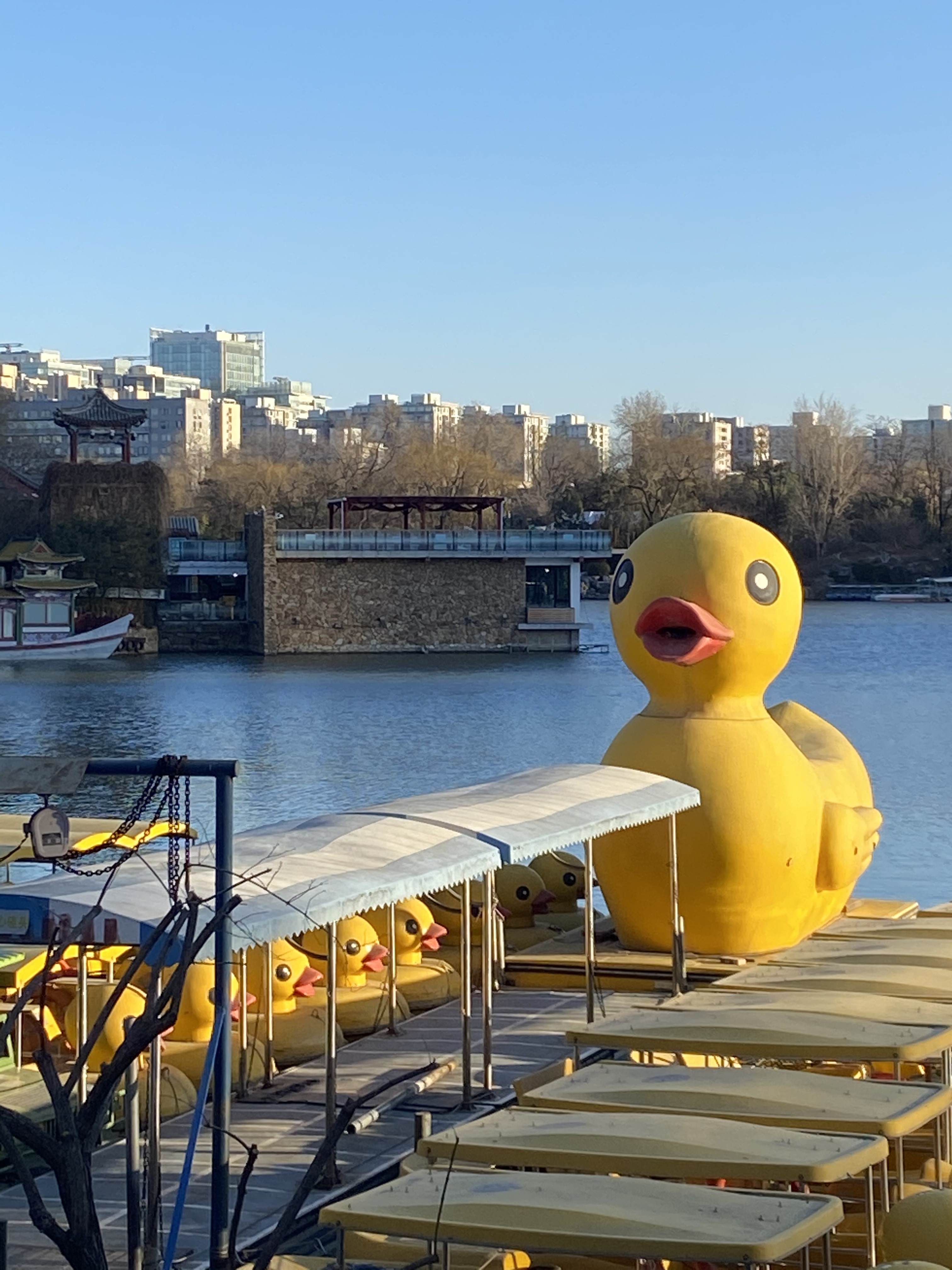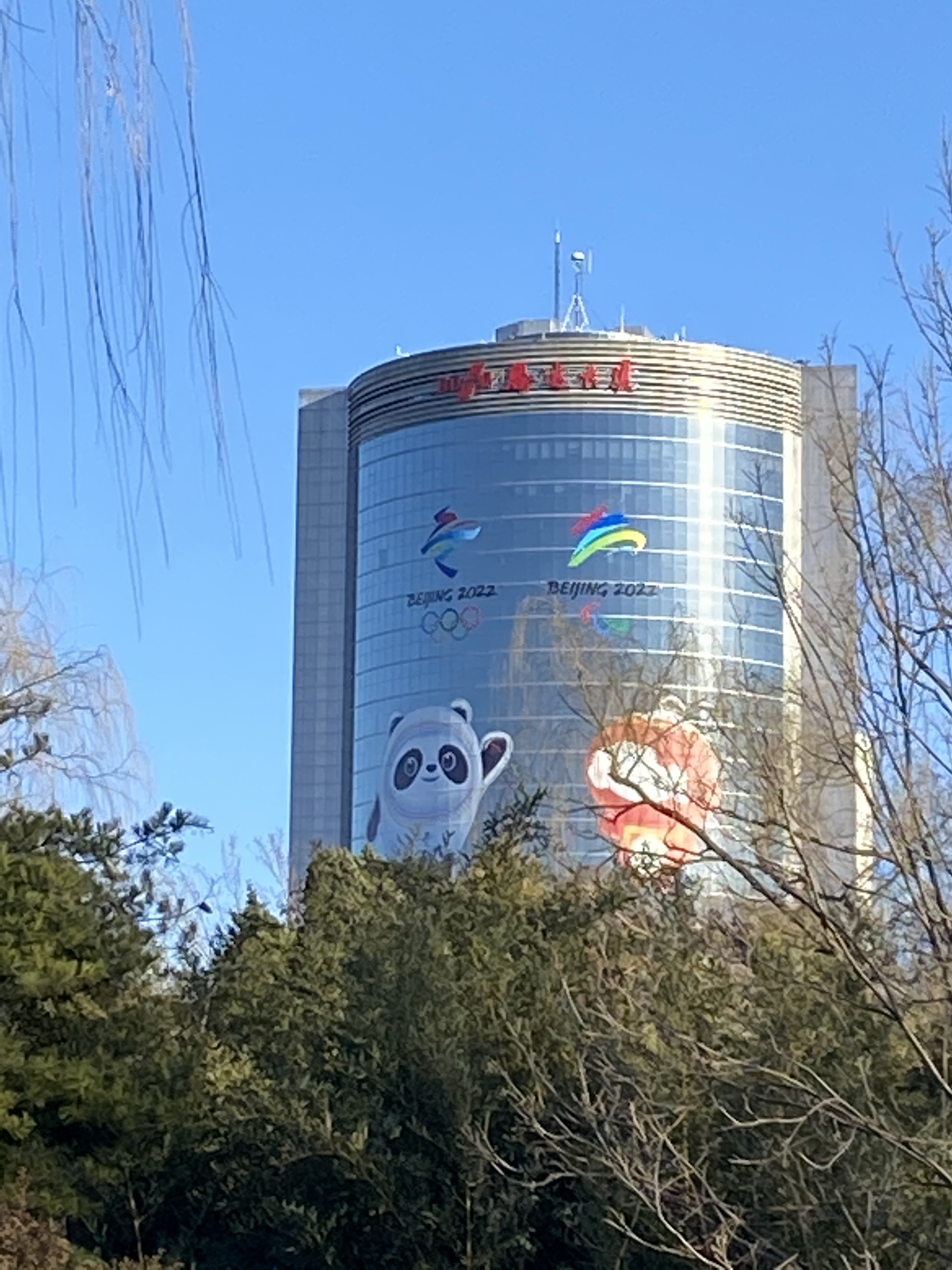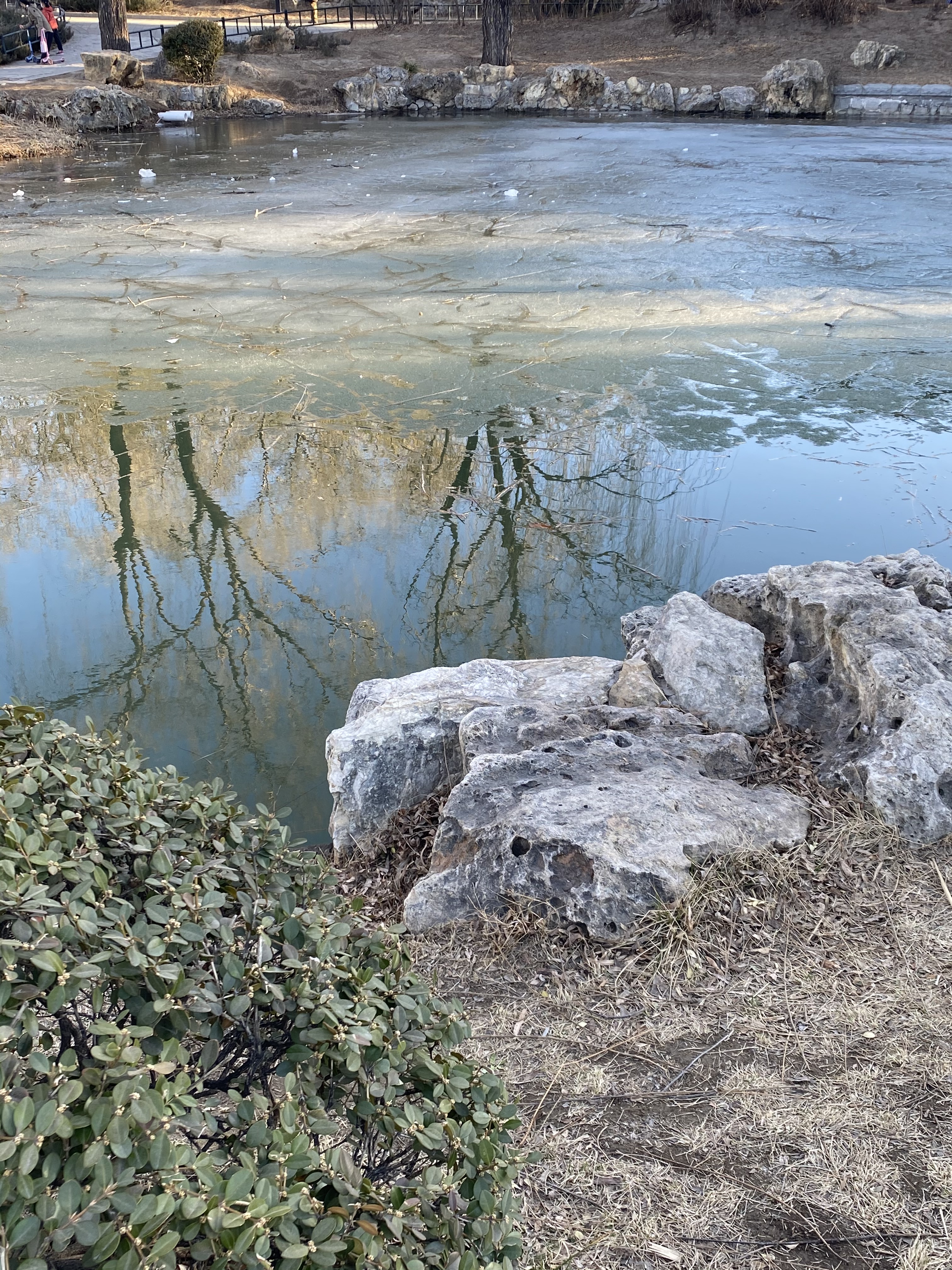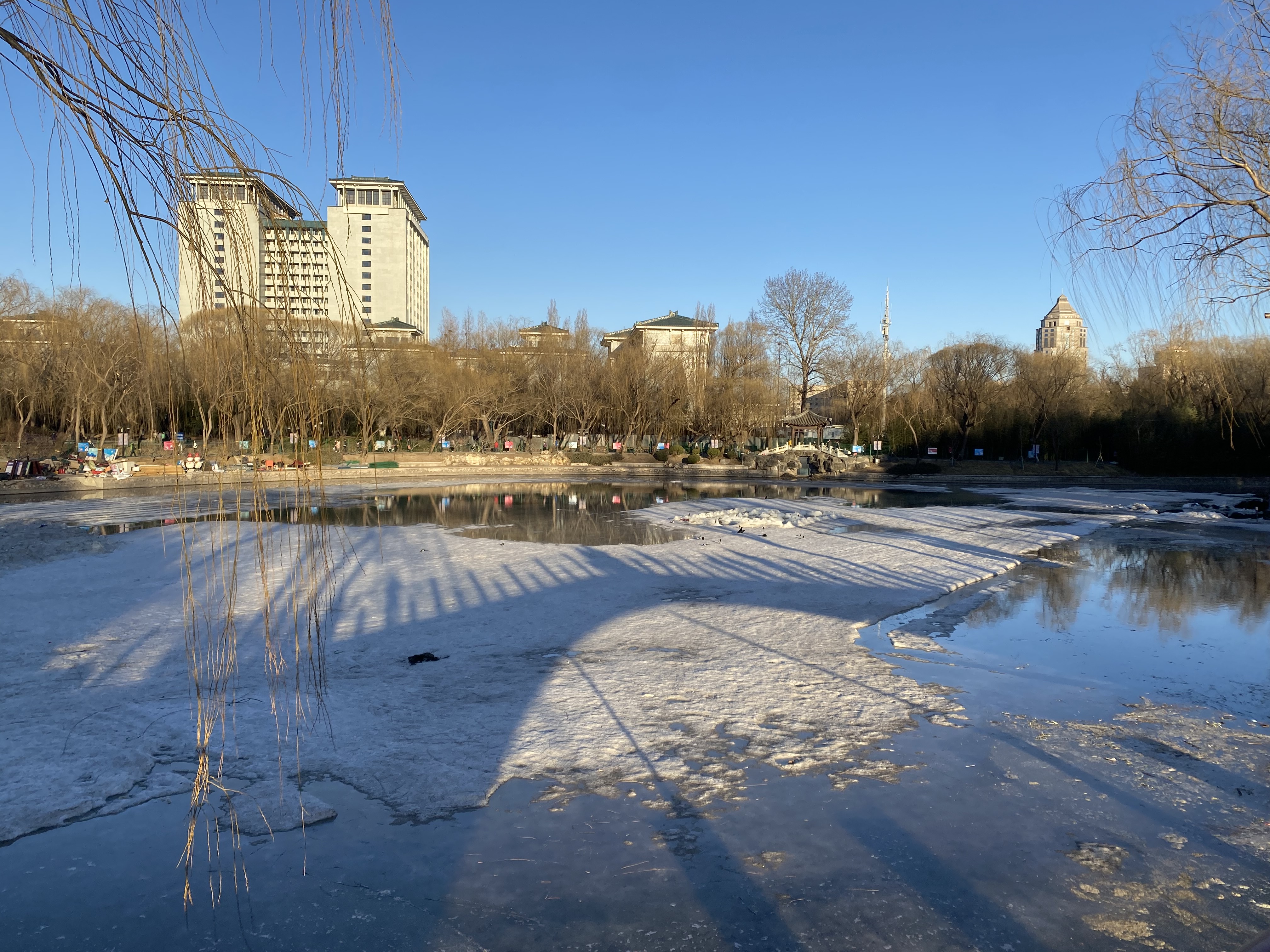 Le jardin est bordé sur sa face nord par un cours d’eau où la belle lumière de l’après-midi faisait des reflets superbes, notamment de l’édifice de la Bibliothèque nationale de Chine sur l’autre rive.