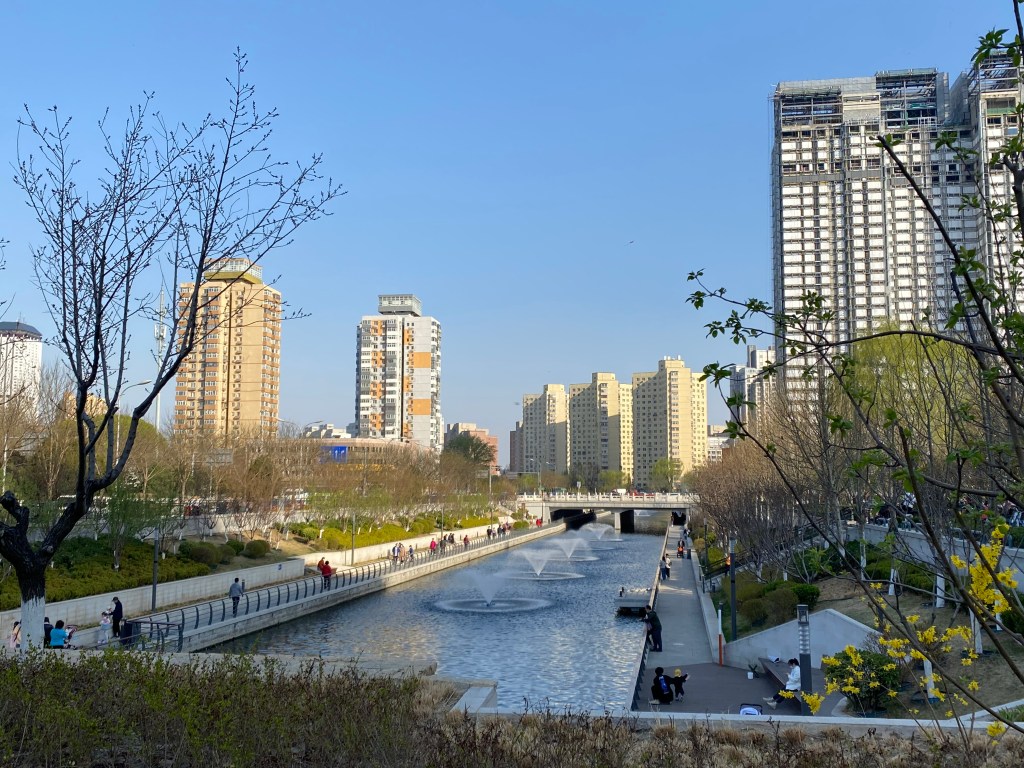 Après être sortie de chez ma couturière, je file vers l’est pour suivre à nouveau la rivière, dans sa partie rénovée. En 2019, la ville a décidé de tout revoir, pour créer des rives accessibles aux promeneurs. Bien des expatriés y font leur footing ou leur promenade.