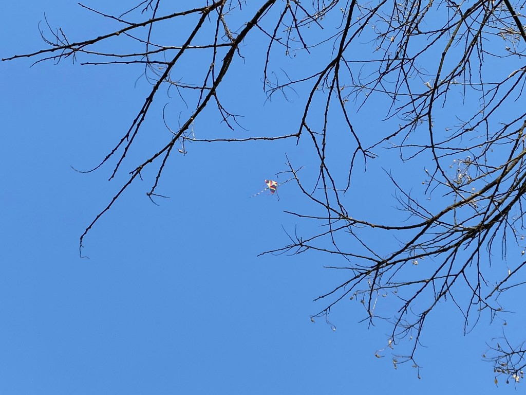En chemin je croise un cerf-volant qui se déploie dans l’azur du ciel.