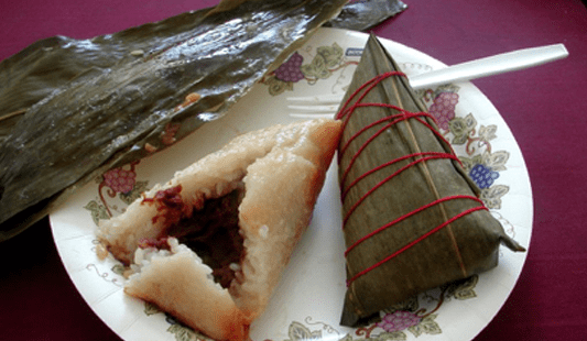 Les Zongzi (粽子) accompagnent la Fête des bateaux dragon (Duanwu 端午), du riz gluant garni de fruits secs, haricot rouge ou haricot mungo, enveloppés dans des feuilles de bambou, avant d’être cuits à la vapeur.