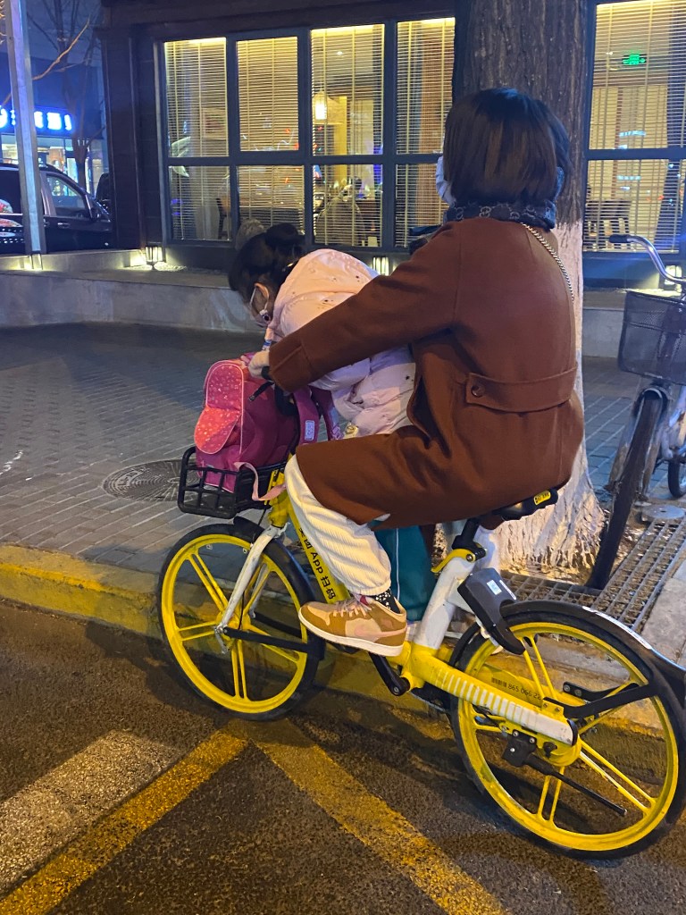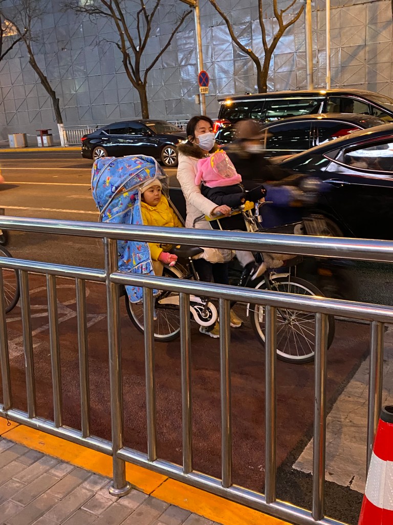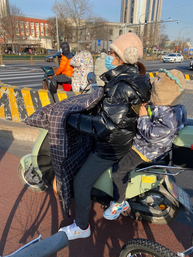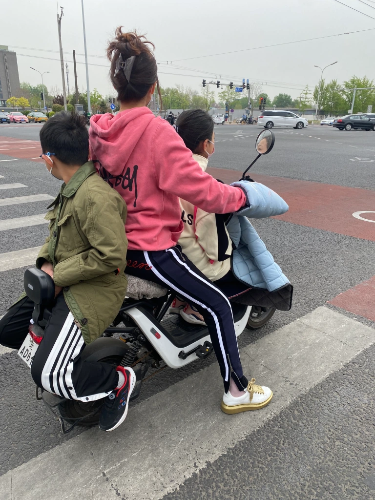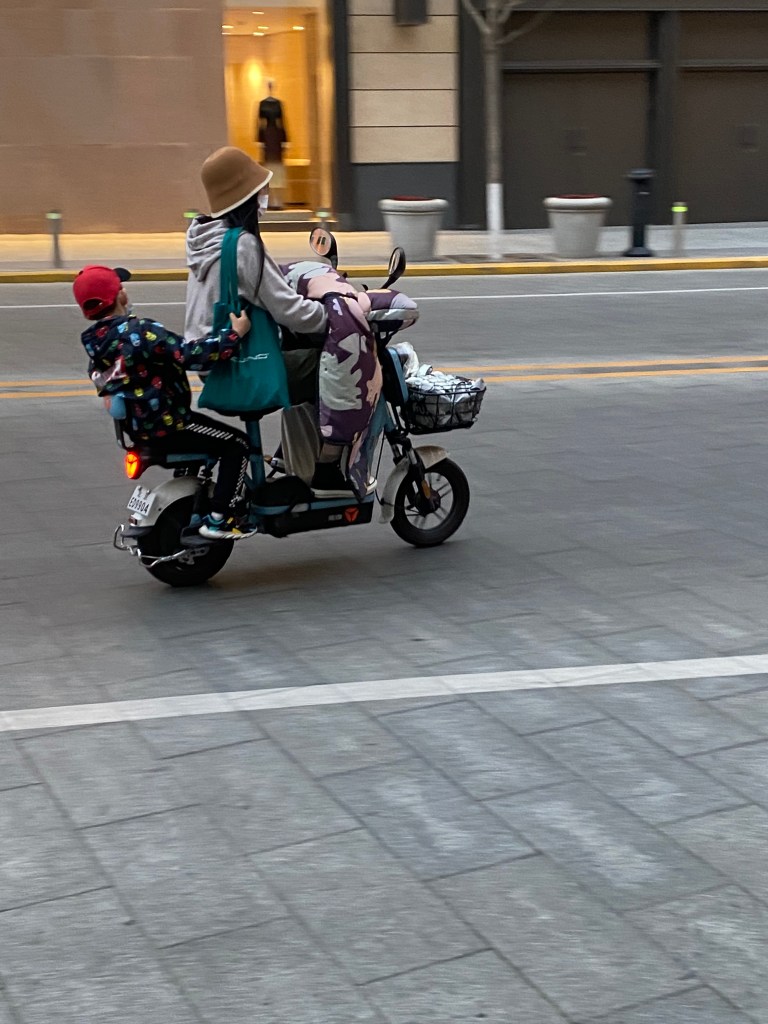 Au milieu de cette foule de deux-roues traçant leur route aux heures de pointe, nous voyons souvent des mères/pères avec enfant, sur un vélo ou un scooter, le plus souvent sans casque (pour les deux, ou trois), affronter la rue. Ce qui serait impensable en France. Et qui même ici revient à faire prendre des risques importants à sa progéniture.