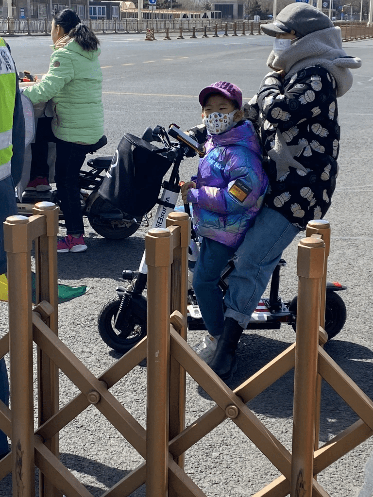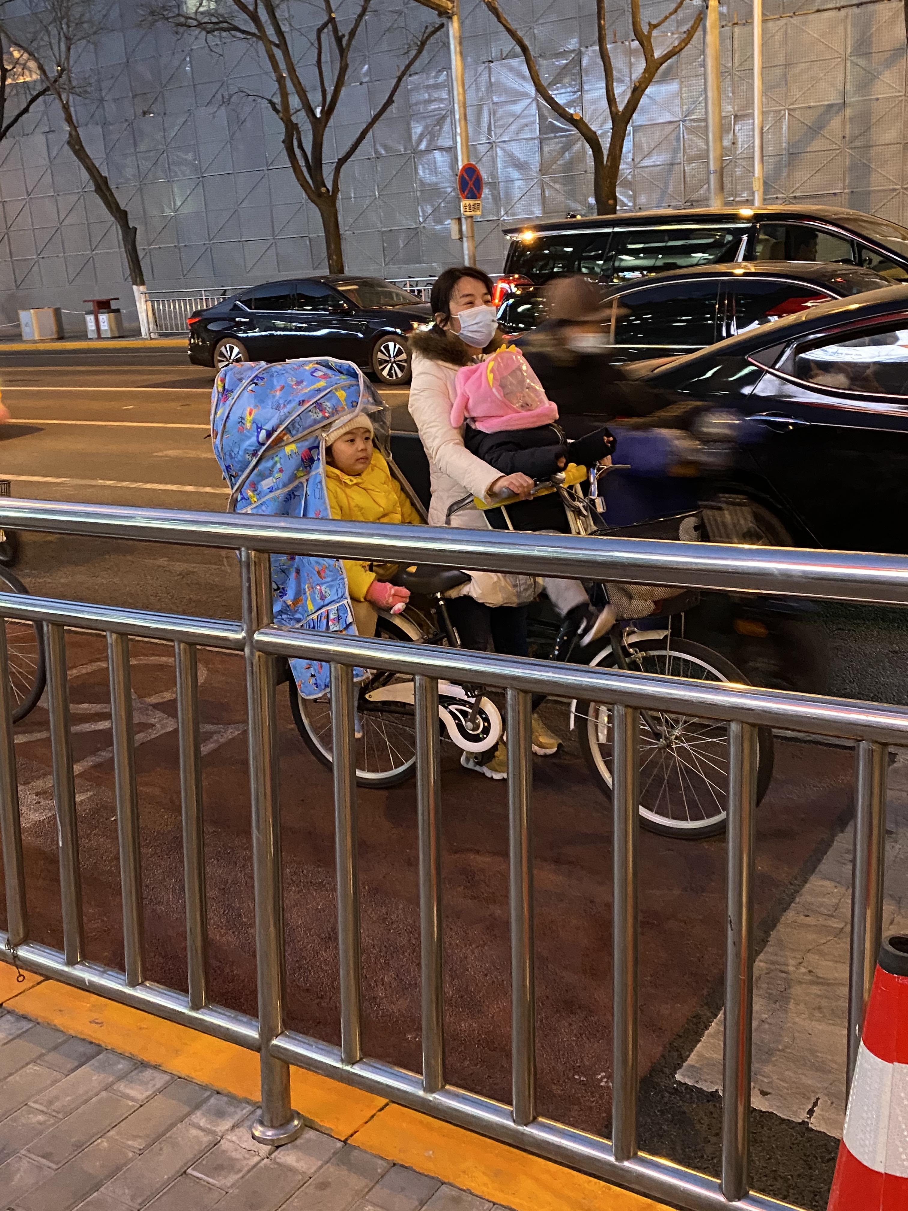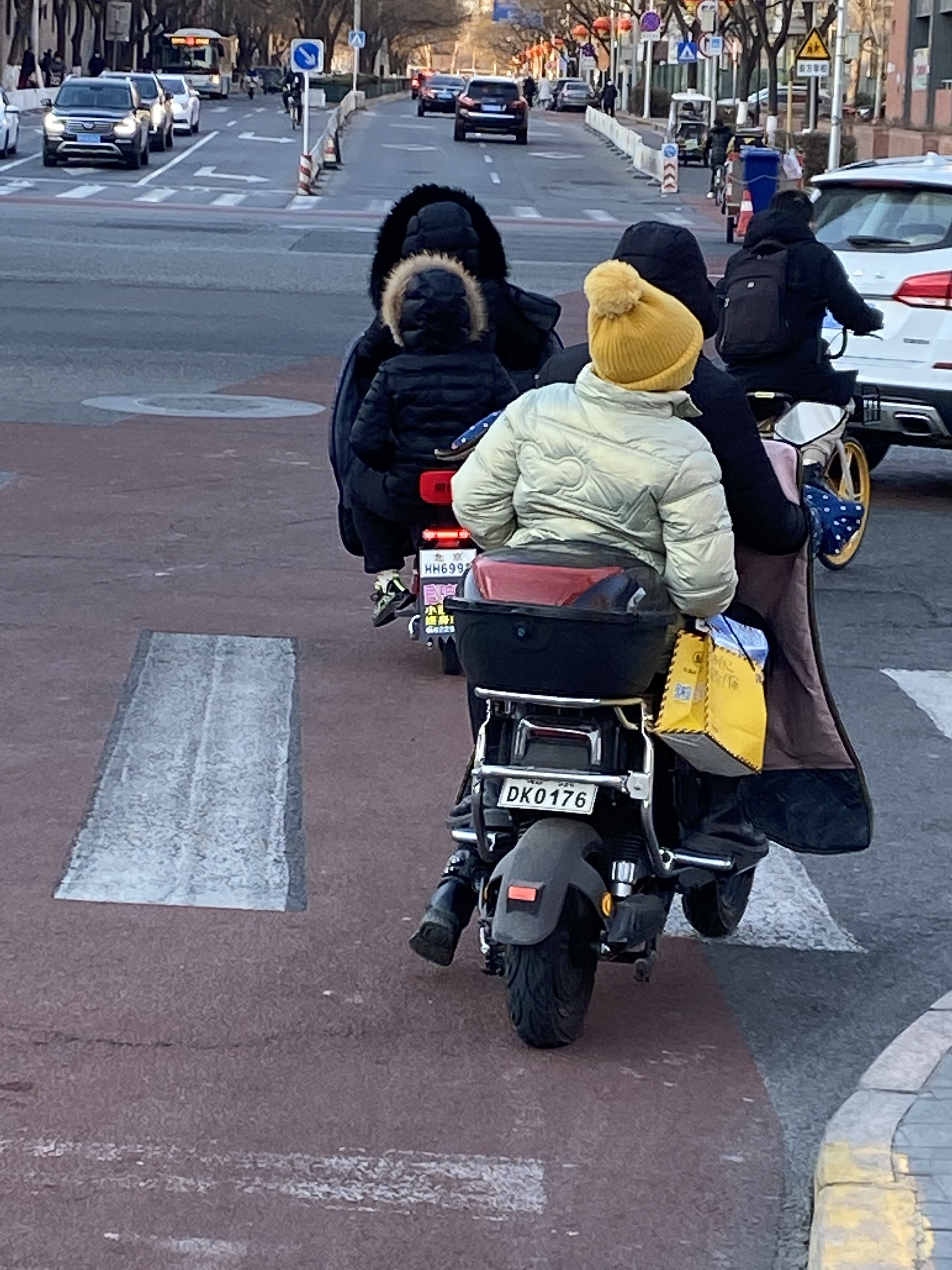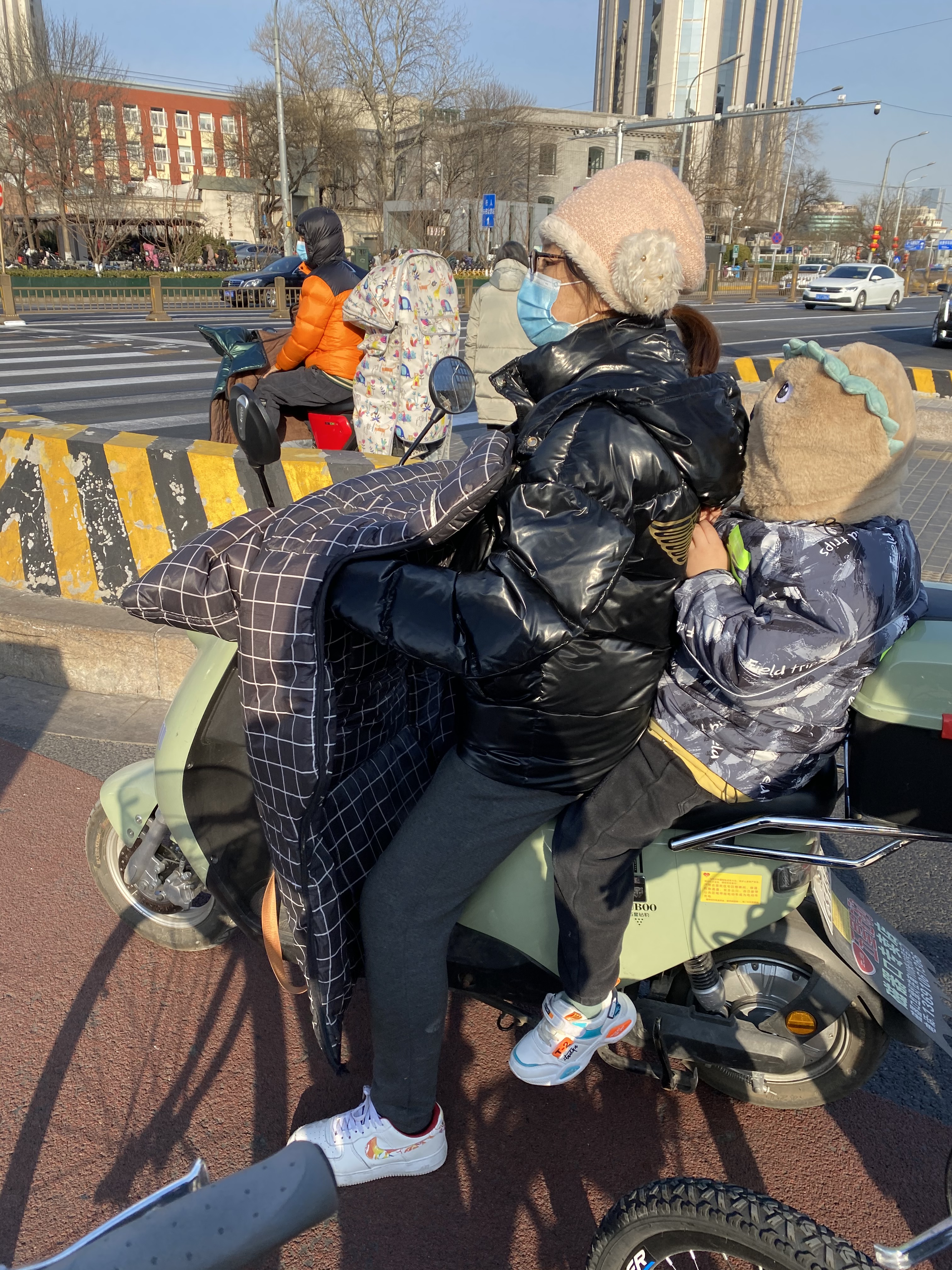 Au milieu de cette foule de deux-roues traçant leur route aux heures de pointe, nous voyons souvent des mères/pères avec enfant, sur un vélo ou un scooter, le plus souvent sans casque (pour les deux, ou trois), affronter la rue. Ce qui serait impensable en France. Et qui même ici revient à faire prendre des risques importants à sa progéniture.