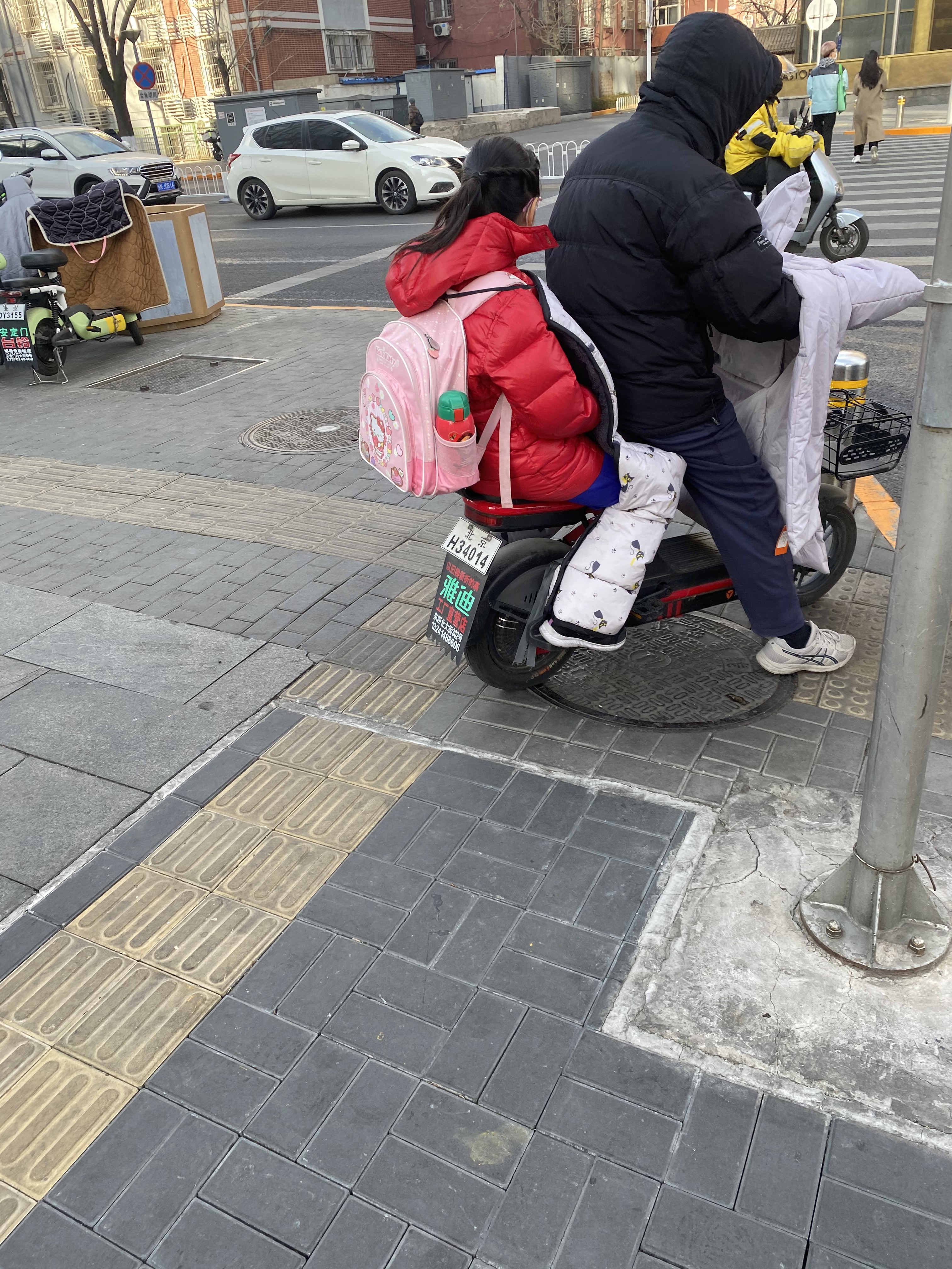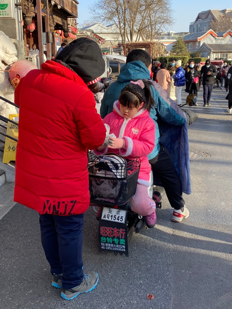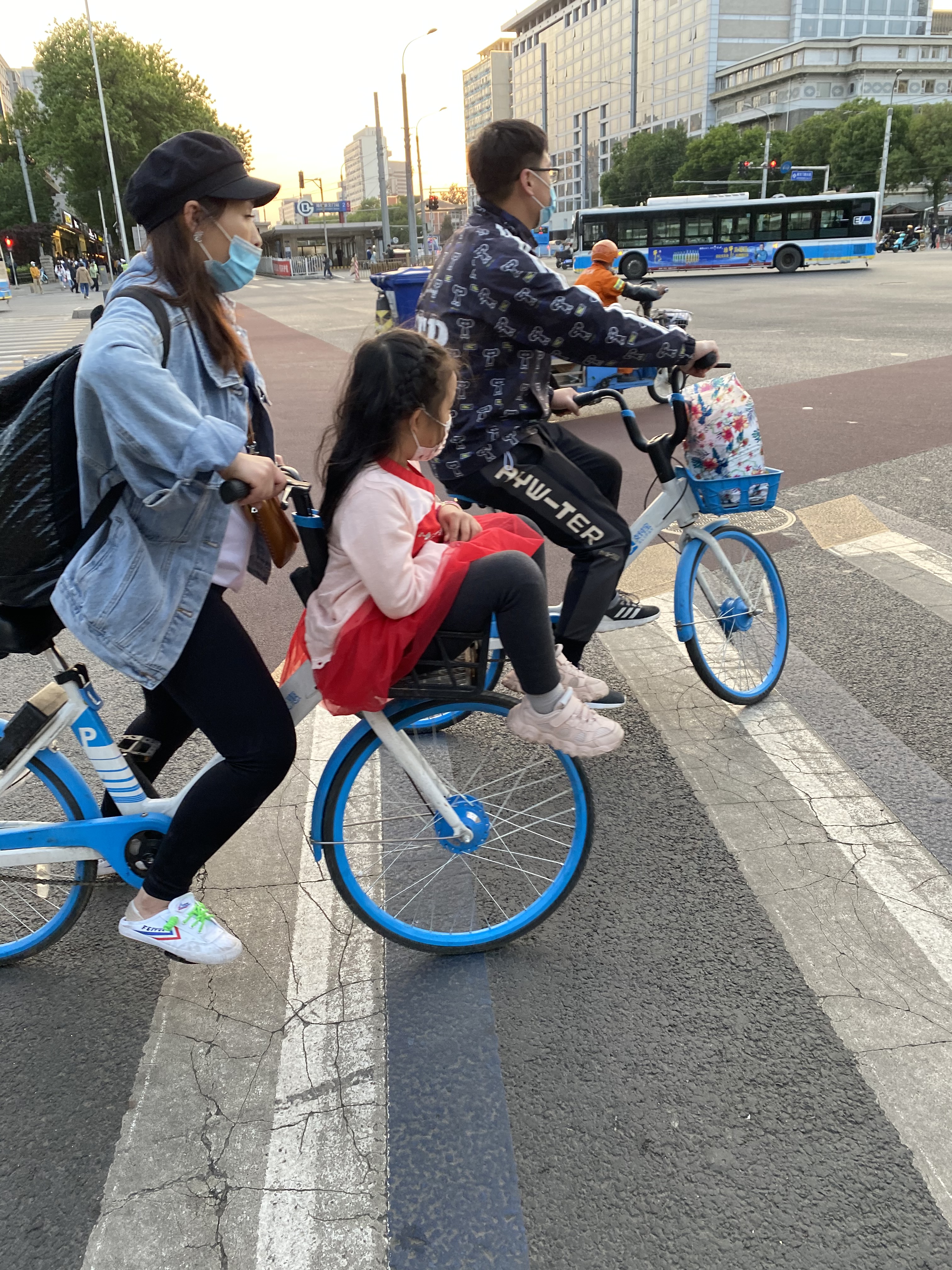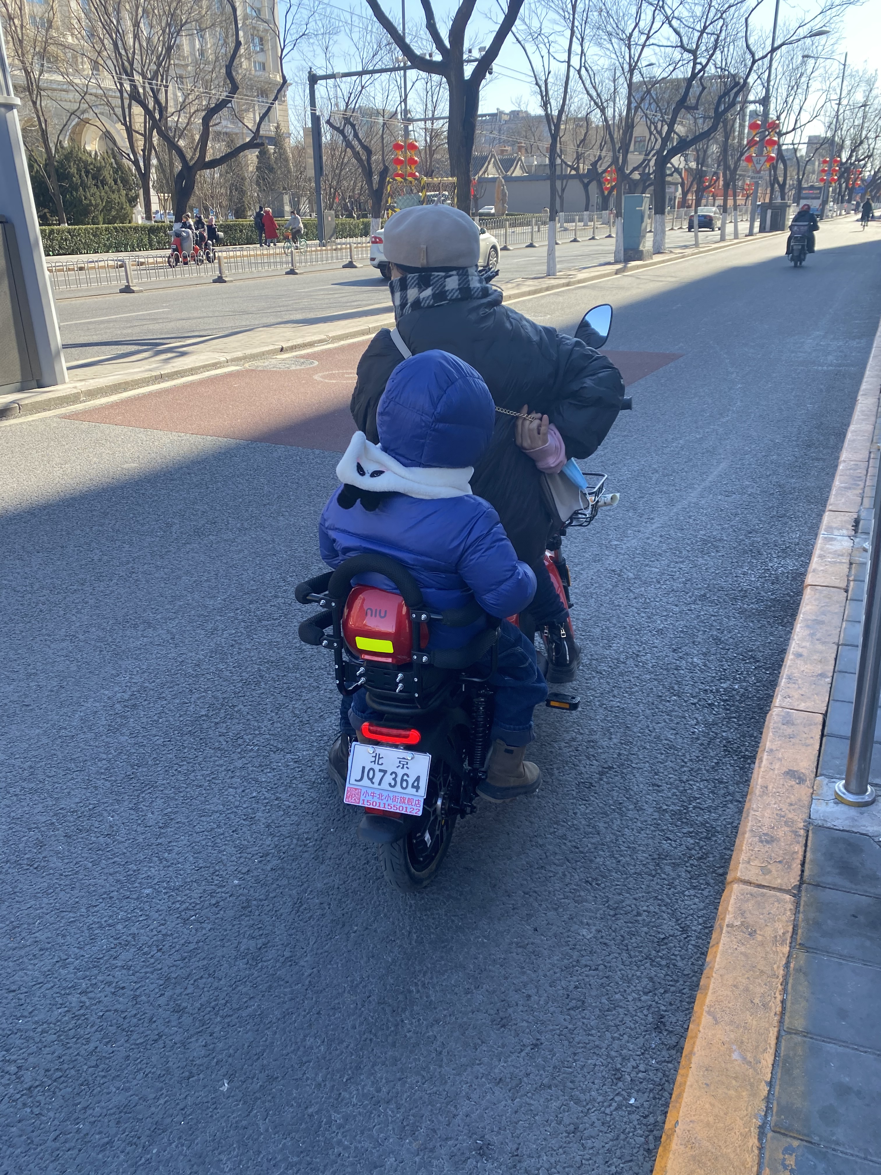 Au milieu de cette foule de deux-roues traçant leur route aux heures de pointe, nous voyons souvent des mères/pères avec enfant, sur un vélo ou un scooter, le plus souvent sans casque (pour les deux, ou trois), affronter la rue. Ce qui serait impensable en France. Et qui même ici revient à faire prendre des risques importants à sa progéniture.