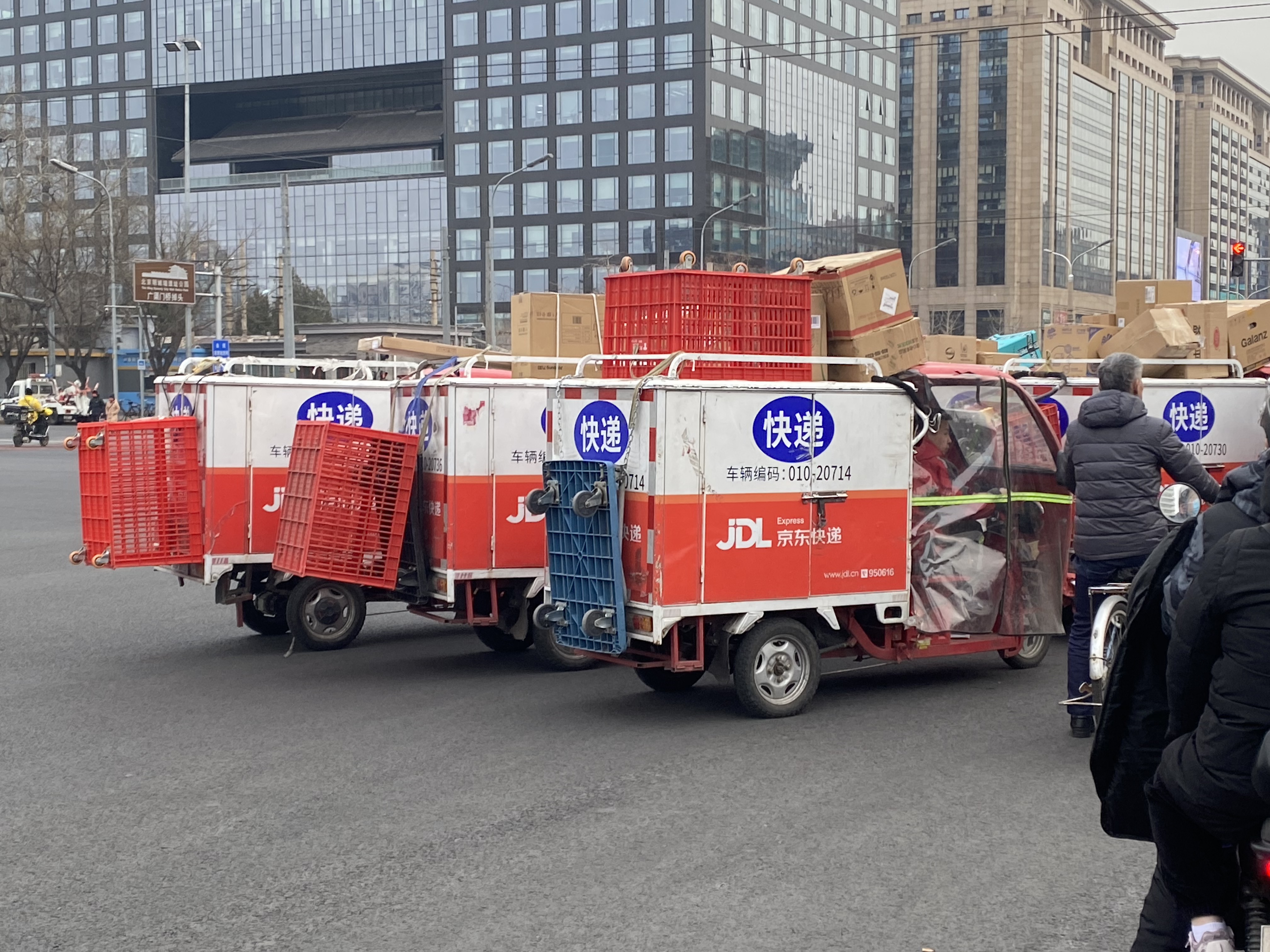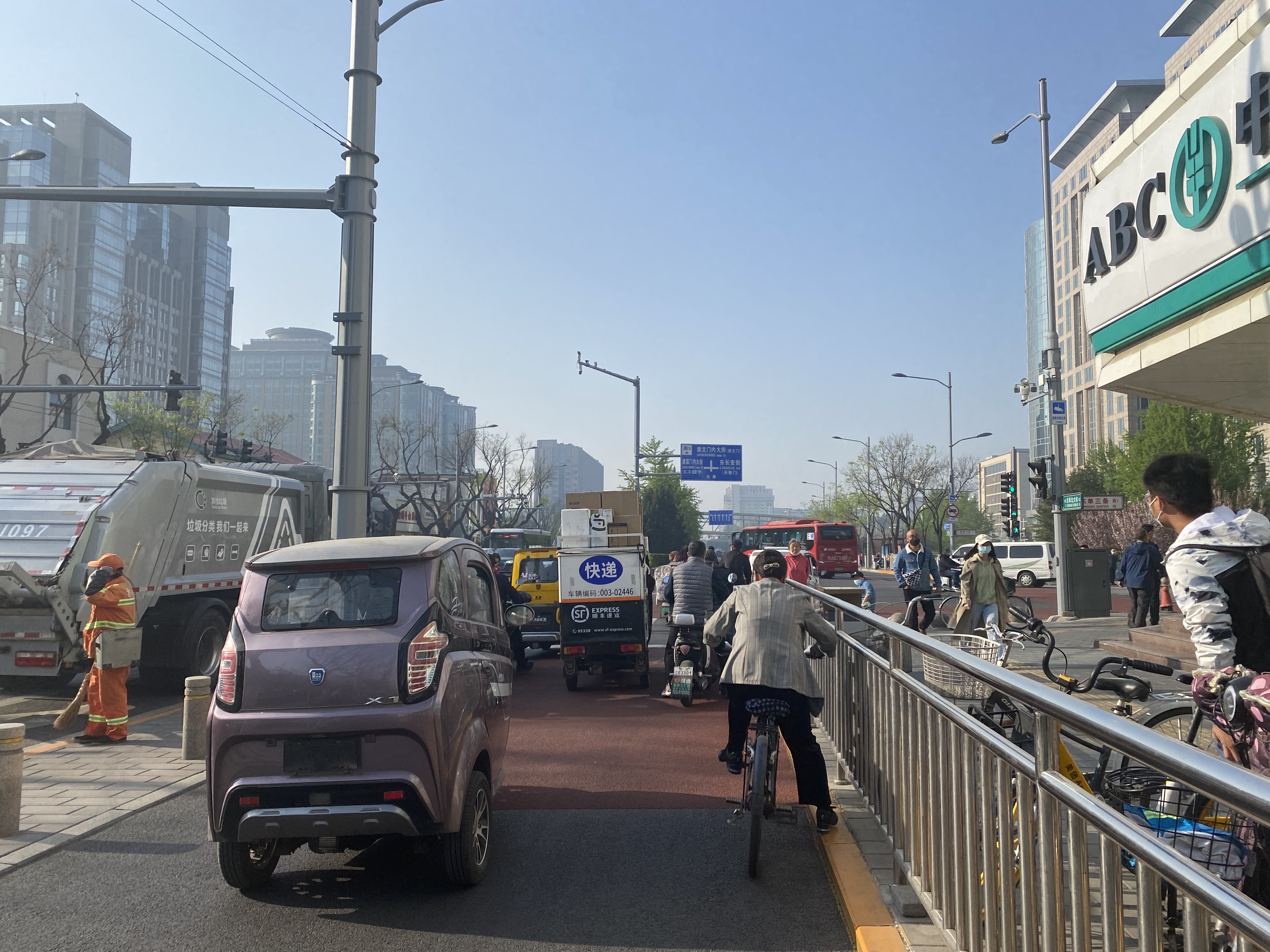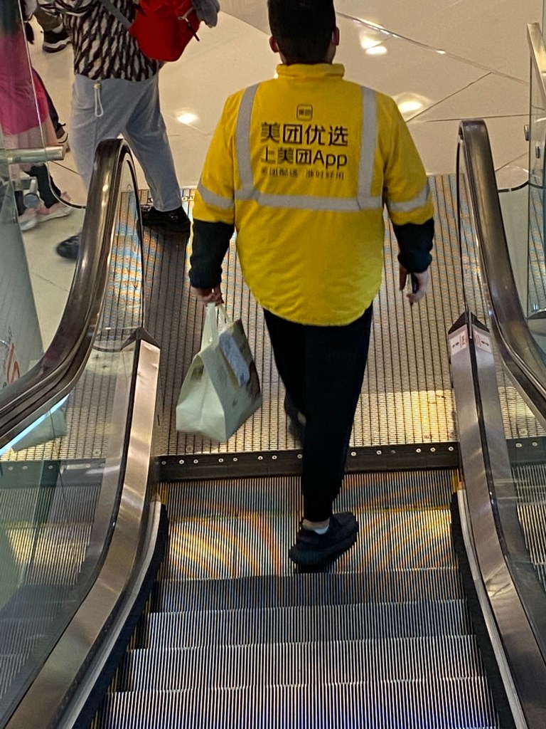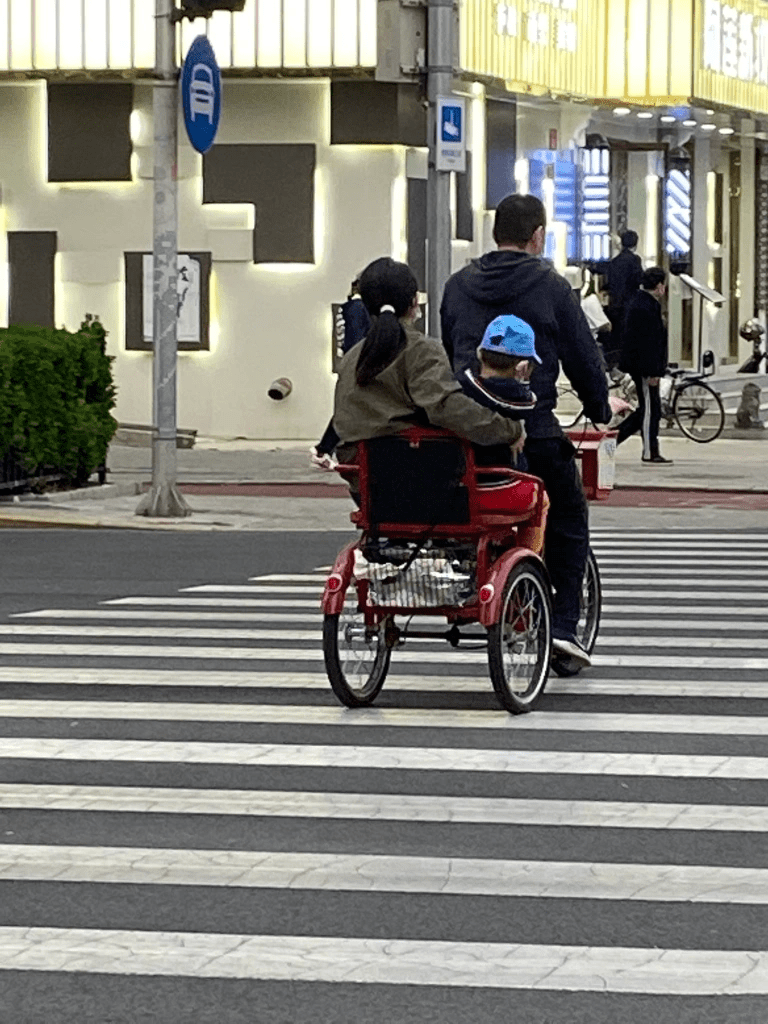 Beaucoup sont des livreurs qui filent à toute allure sur leurs scooters électriques, donc silencieux, et nous ajouterions : dangereux. Mais comme ici tout est considéré comme possible, tout le monde se méfie et se tient prêt à dévier sa trajectoire en cas d’événement imprévu. Et comme la vitesse globale est modérée, bien des accidents sont évités. Je maintiens quand même que toute cette conduite reste assez approximative et j’ai pu assister récemment à quelques chocs de véhicules.