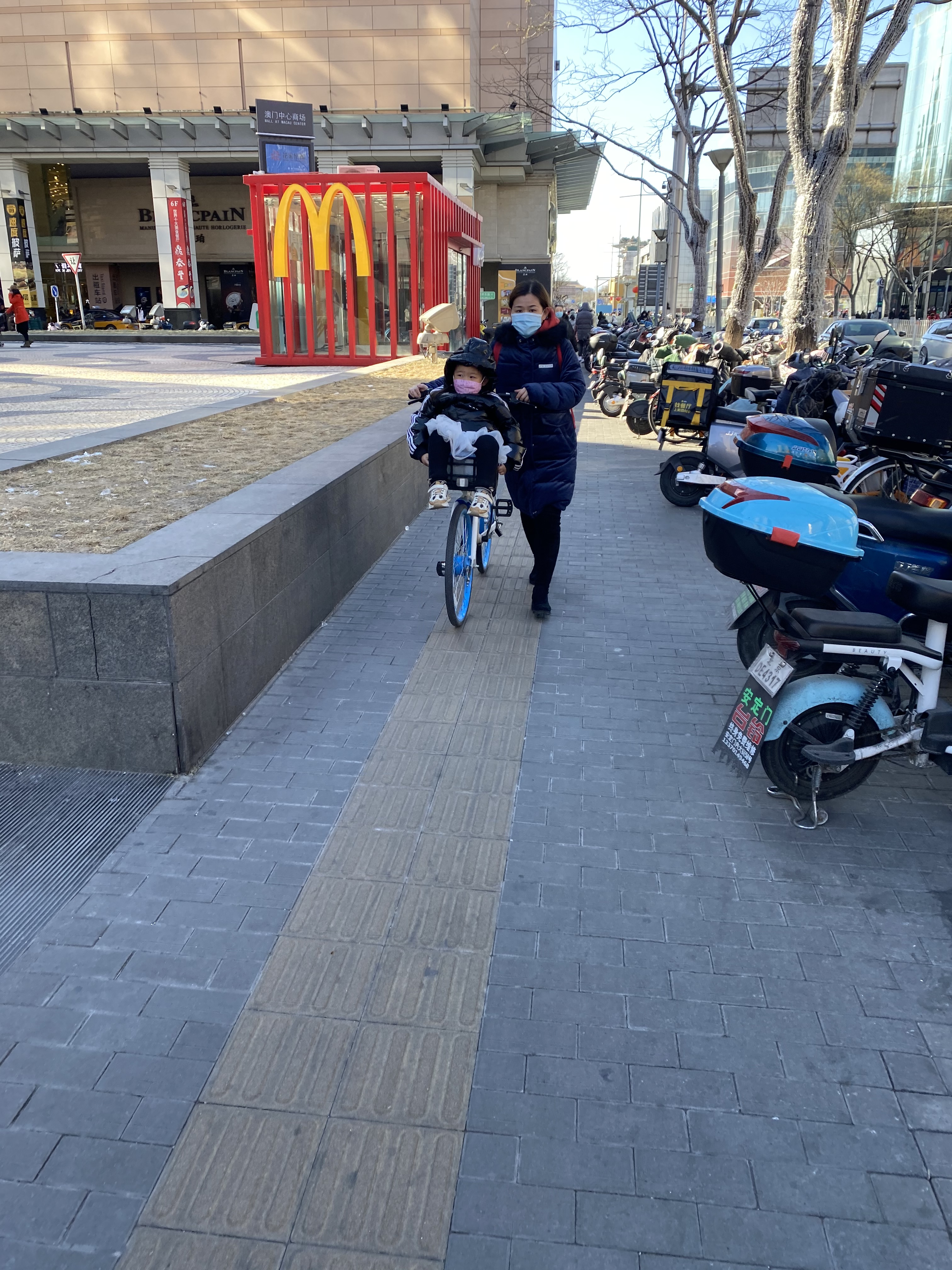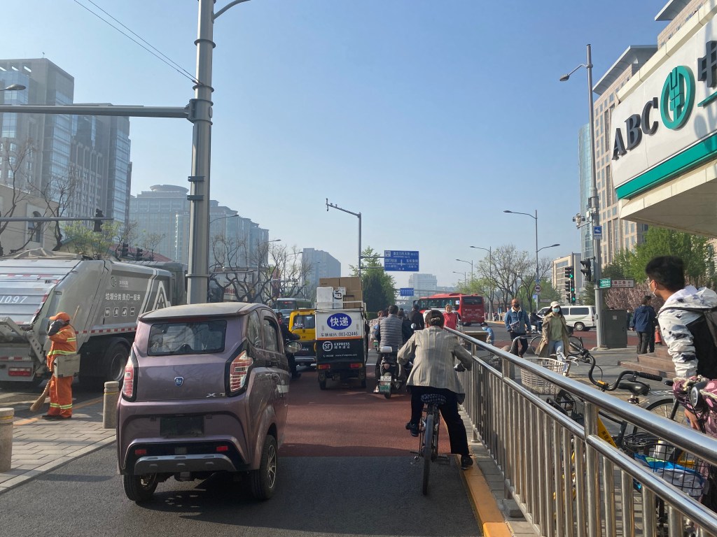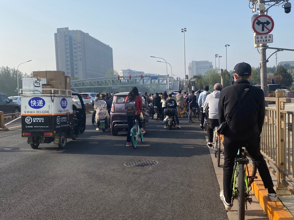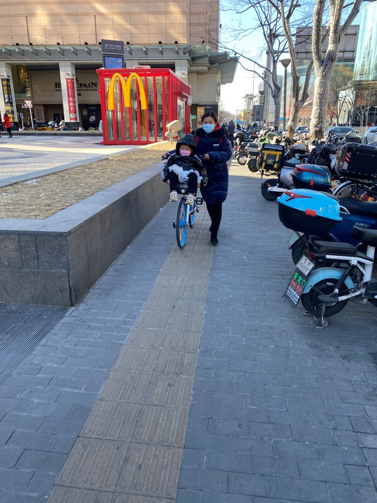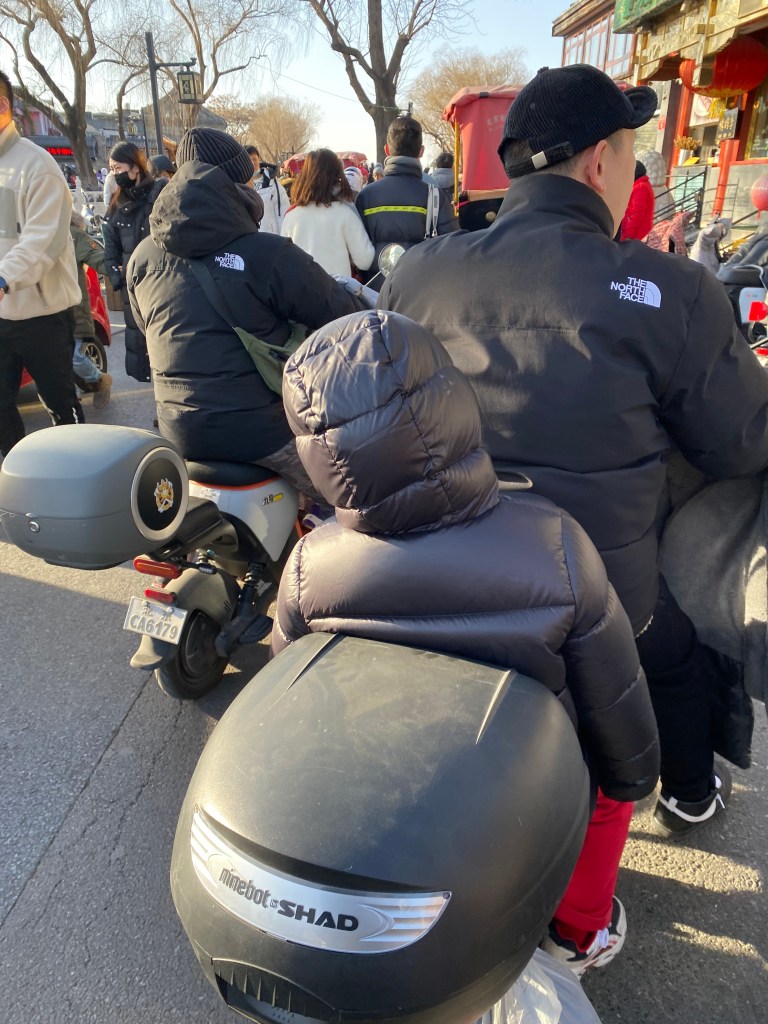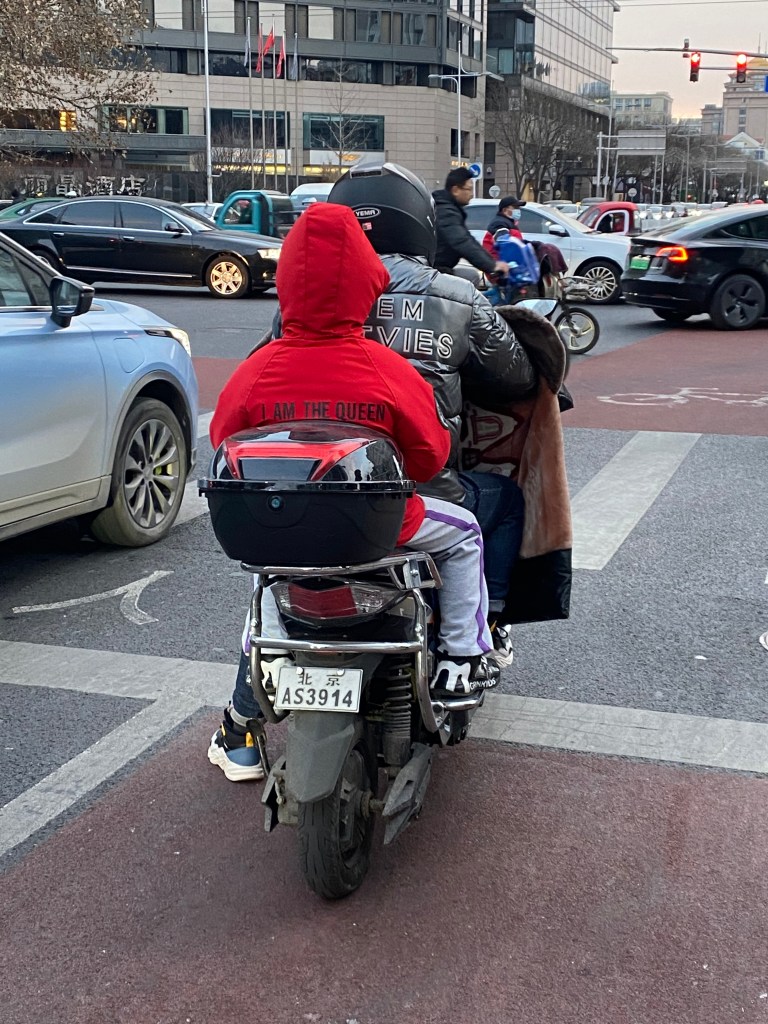 A Pékin, comme j’ai déjà eu l’occasion de le dire, si la voiture est reine, les scooters et vélos sont légion, ce sont des kyrielles de ces véhicules deux-roues qui sillonnent la capitale tous les jours, dans les rues « normales », mais aussi en lisière des dix/douze voies, car ici toutes les rues sont bordées d’une piste cyclable dans les deux sens. Il est parfois impressionnant, quand vous attendez à un feu, de voir ces armées qui vous font face (si, si, je revendique mon propos, on dirait une première ligne de cavaliers prête à fondre sur l’ennemi dès le feu passé au vert).