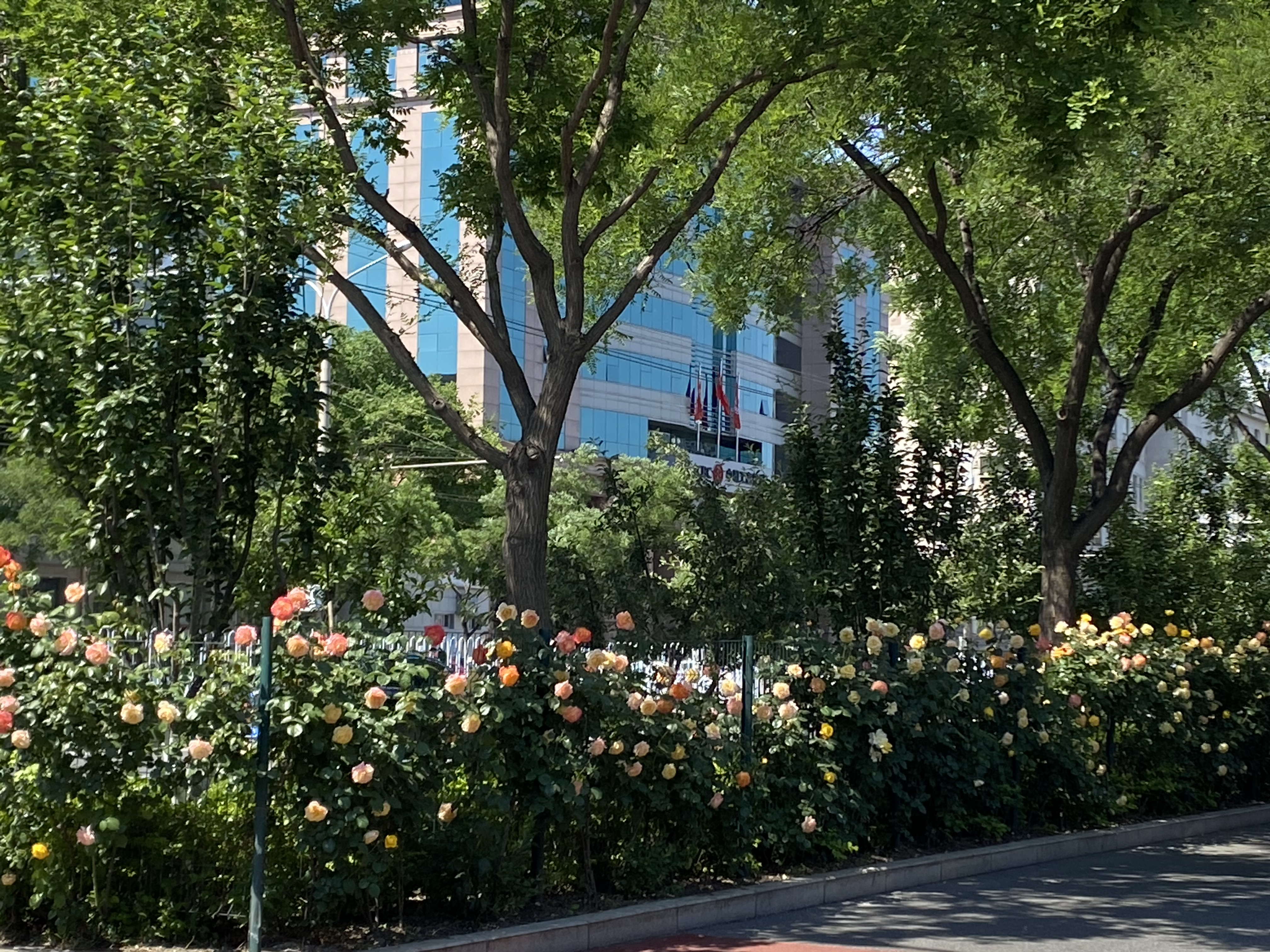 L’an dernier, j’avais déjà assisté à ce phénomène, dont je veux vous parler, confirmé cette année. Au début du mois de mai, tout d’un coup (突然 comme diraient les Chinois), des milliers de pieds de roses incrustent leurs floraisons le long des rues, des avenues, des six voies ou plus. S’invitant avec toute leur beauté dans cet univers urbain jusqu’à l’hostilité (franchement, si vous étiez une fleur, vous aimeriez être en bordure d’une six voies ? Moi je préfèrerais être dans un jardin, mais je ne suis pas une fleur, nous n’avons peut-être pas les mêmes façons de penser).