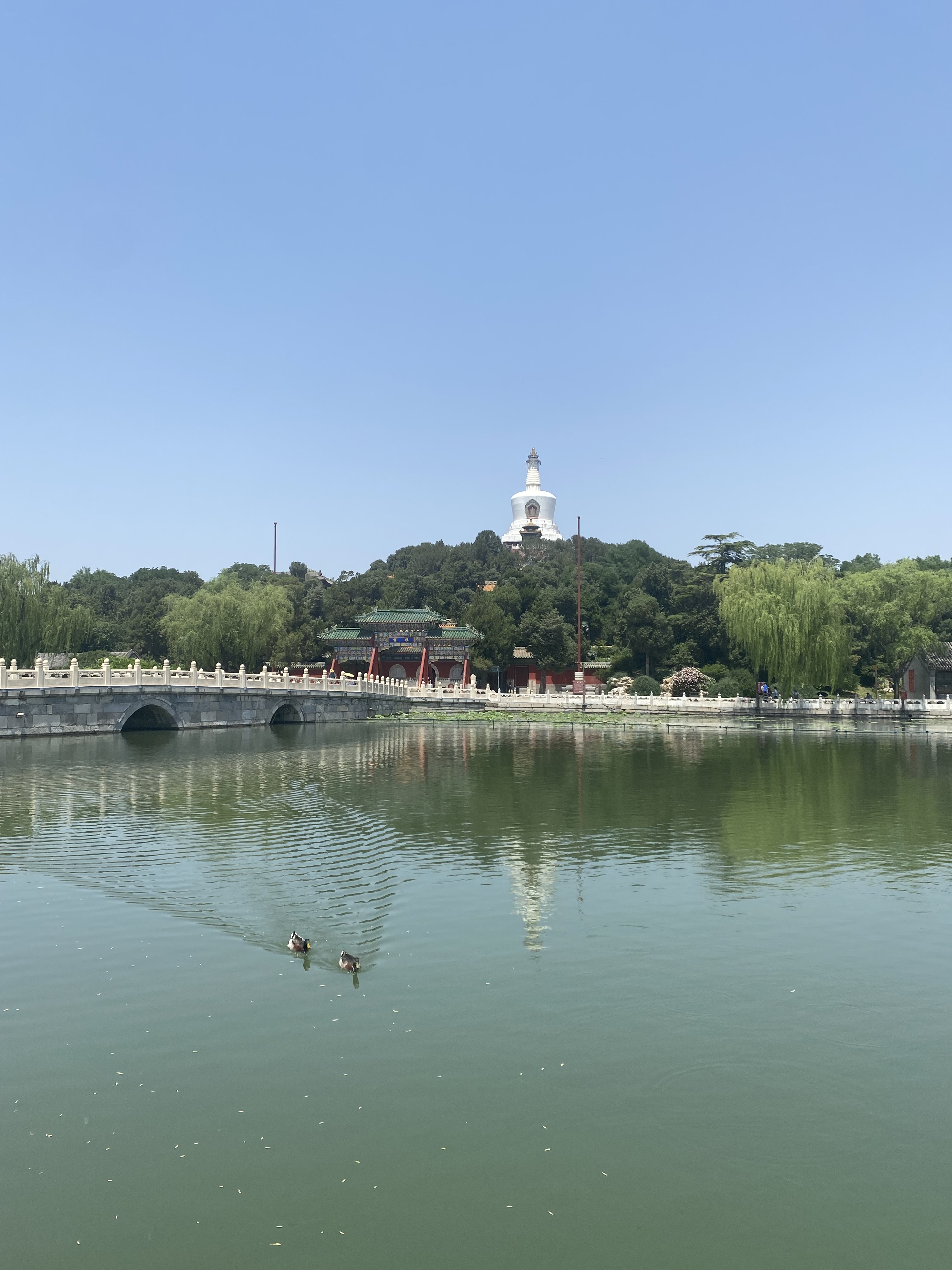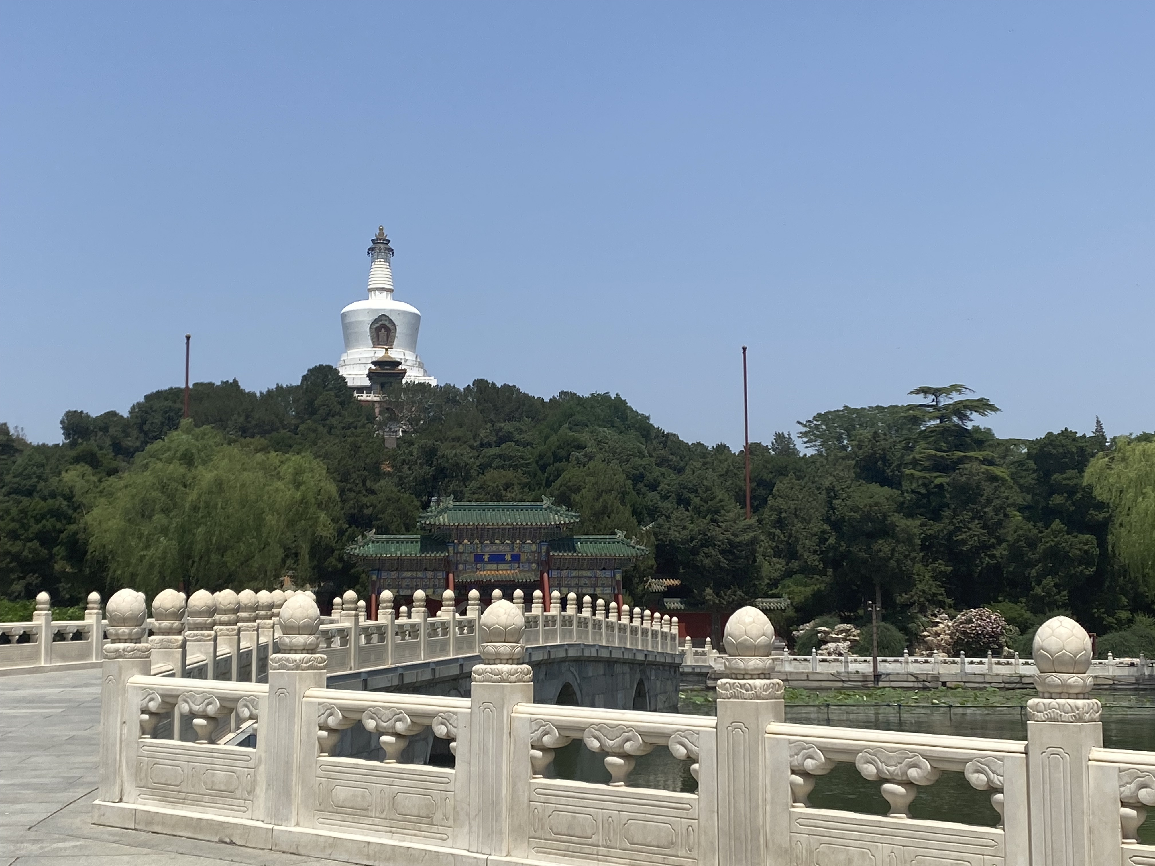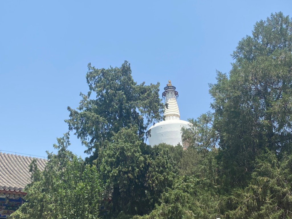 C’est bien sûr la pagode blanche (百搭) qui nous accueille, depuis toute sa hauteur et sa séniorité (elle a été bâtie en 1651 pour honorer la visite du 5e Dalai Lama, puis reconstruite plusieurs fois depuis). Elle trône du haut de ses 40 mètres, sur le point culminant de l’Ile des fleurs de jade. Elle va nous accompagner tout au long de votre trajet le long du lac, se laissant découvrir peu à peu sous tous ses profils, si je peux me permettre cette analogie.