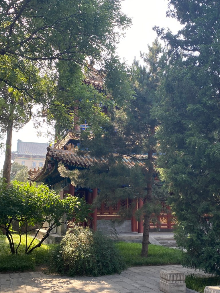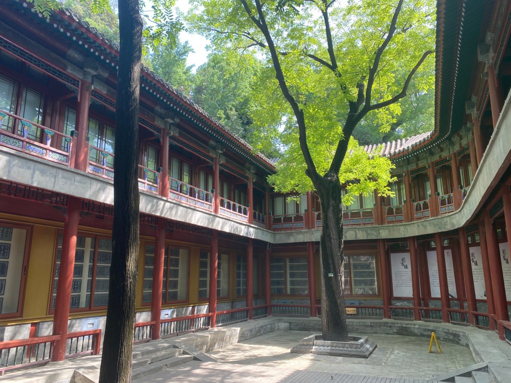 Des pavillons ornent la rive nord-ouest du lac, notamment celui-là, le Palais Daci Zhenru (大甆真如) avec un édifice entièrement fait de bois. Comment dire la beauté de ce que j’ai vu ? Un ciel de cobalt, le soleil qui se faisait complice de la nature pour la magnifier, et toutes ces architectures traditionnelles rutilantes. Je vous laisse le plaisir des images.