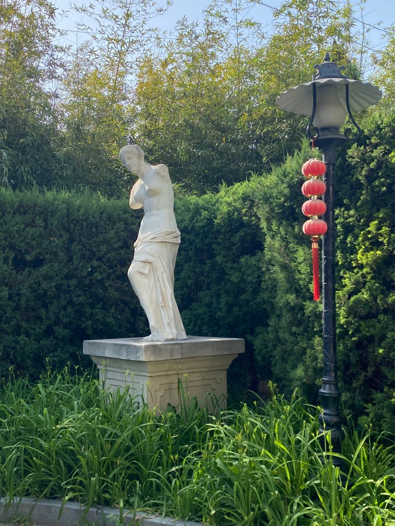 Arrivée à l’entrée du jardin, je croise ce mélange de cultures, un peu incongru, car nous sommes dans un jardin de quartier, convoquer la Vénus de Milo comme annonce d’entrée me paraissait un peu curieux.