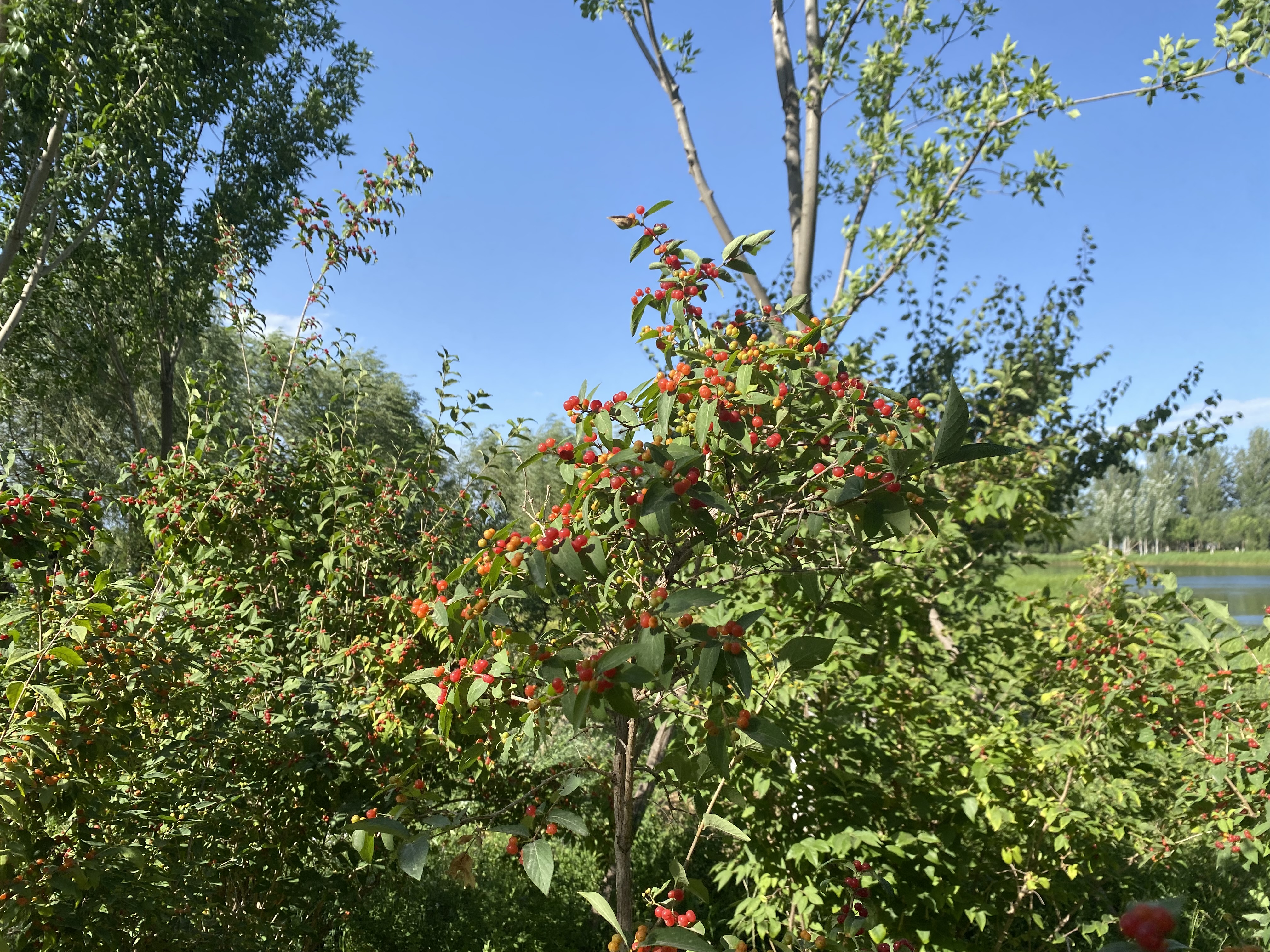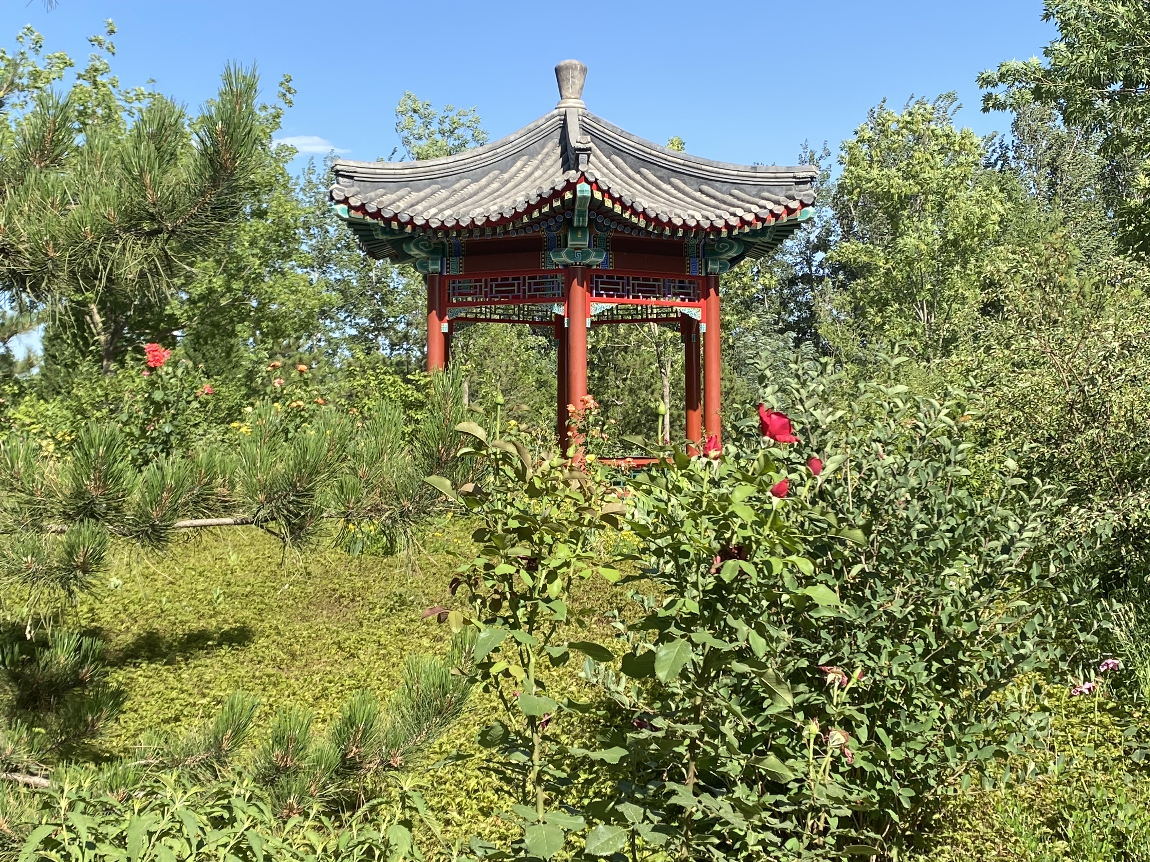 En continuant vers ce monument chinois, je croise des plantes étonnantes, qui se sont vêtues de baies rouges. Je ne les ai pas identifiées, mais elles étaient bien belles dans leur résistance à l’été qui ne cesse de monter en chaleur.
