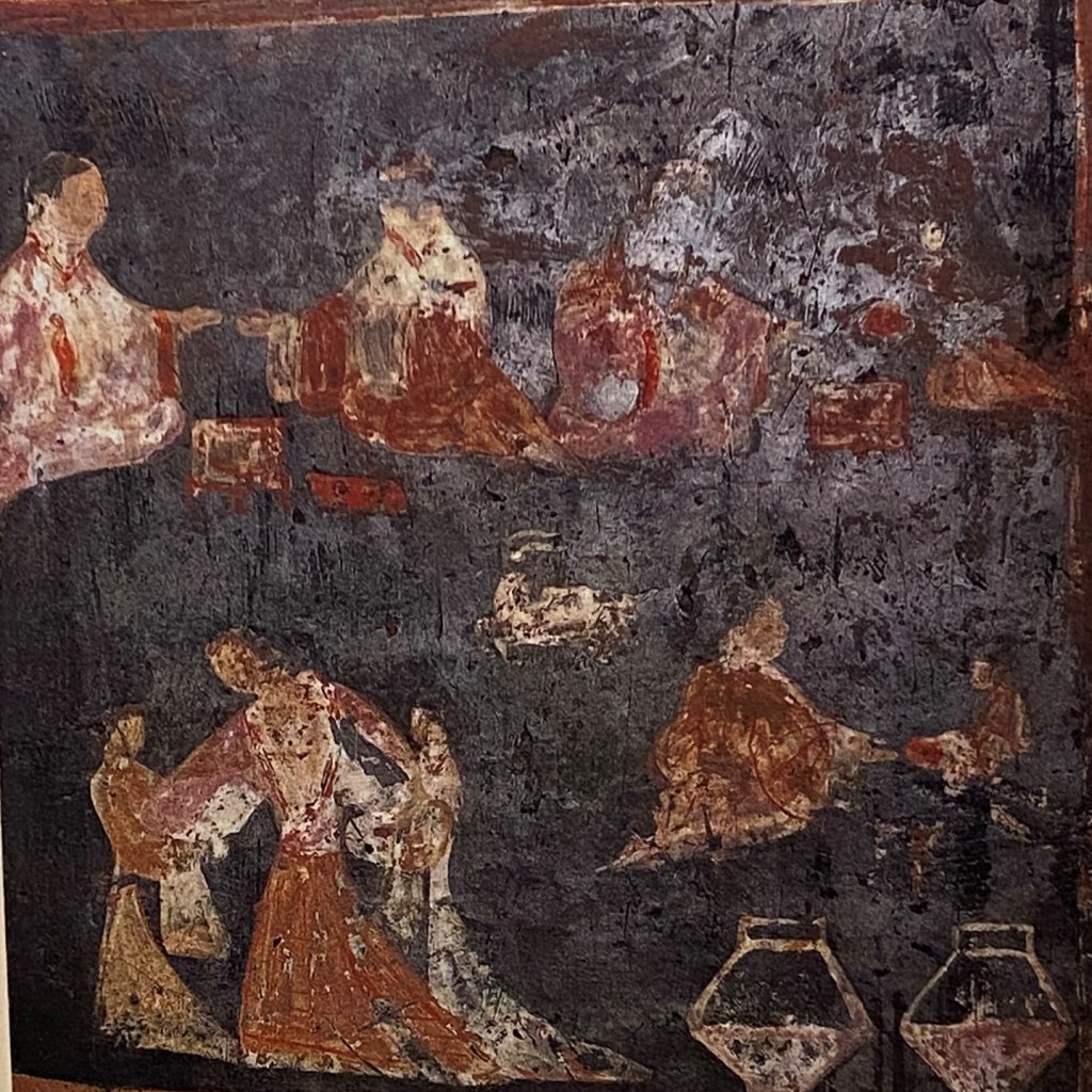 L’image ci-dessous m’a beaucoup amusée, on y voit des femmes ivres (c’est ce que dit le carton) à l’époque Han (2e siècle av JC – 2e siècle ap JC), enfin un soupçon d’égalité des sexes dans les temps anciens ! (Je ne vois pas pourquoi se saouler serait l’apanage des hommes).