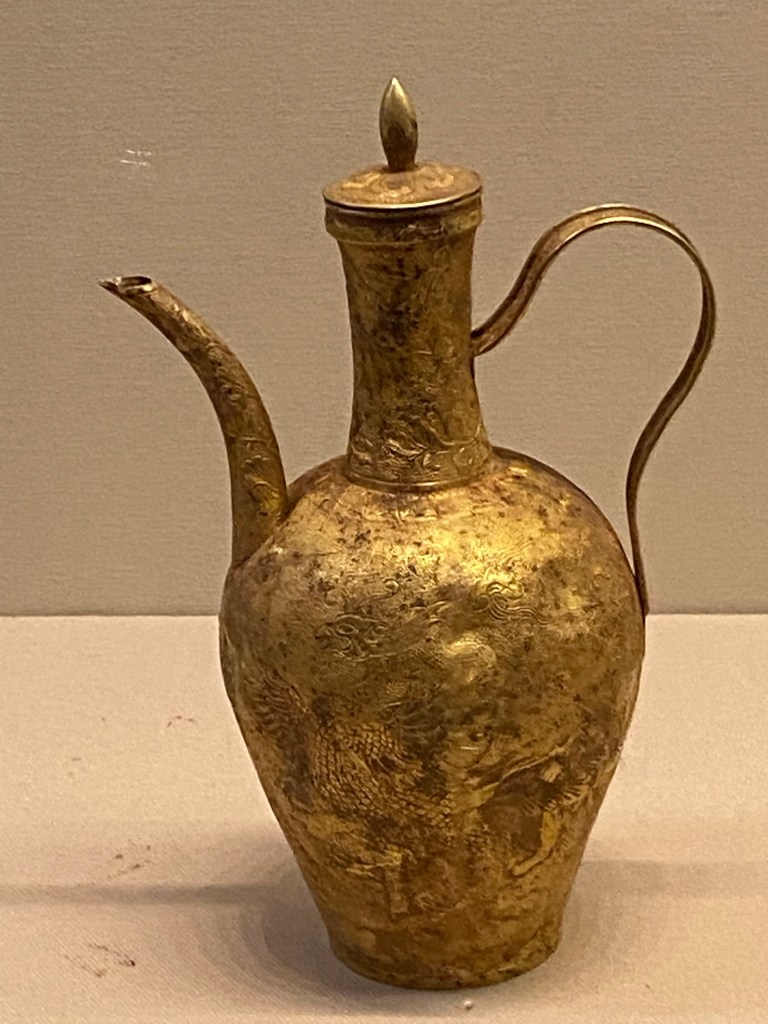 Encore un objet magnifique, auquel ma photographie ne rend qu’à moitié hommage, une verseuse à vin en or, décorée de subtils motifs.