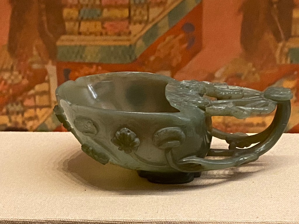 Dans les si beaux objets rencontrés en chemin, je citerai également ces deux chefs d’oeuvre faits de jade, cette pierre si difficile à travailler (très résistante et friable à la fois), des coupes, l’une en forme de pèche et l’autre ornée de fleurs. Un étalage de beauté qui me rappelle pourquoi je suis contente d’être ici.